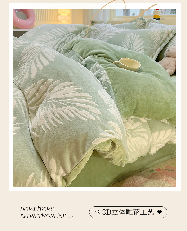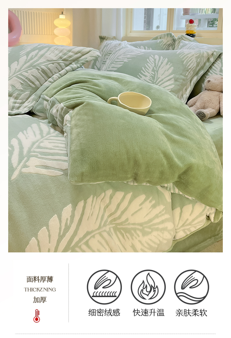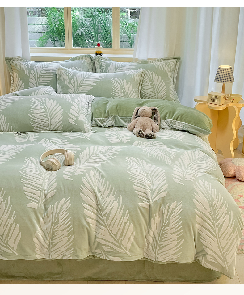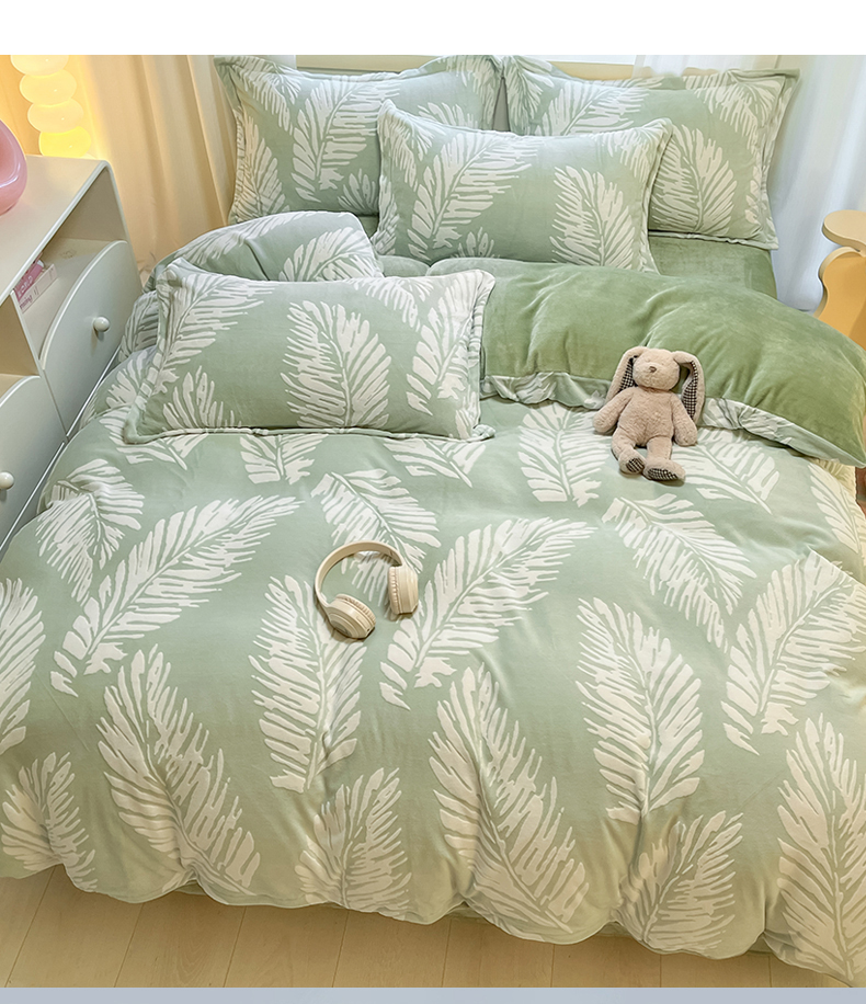 当前位置: 91家纺网 > 商品网购 > 床品套件 > 四件套 > 雕花绒四件套 > 名兮家居 2025新款亲肤舒适高克重雕花绒四件套 羽毛-浅绿