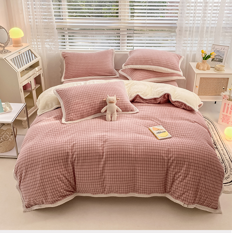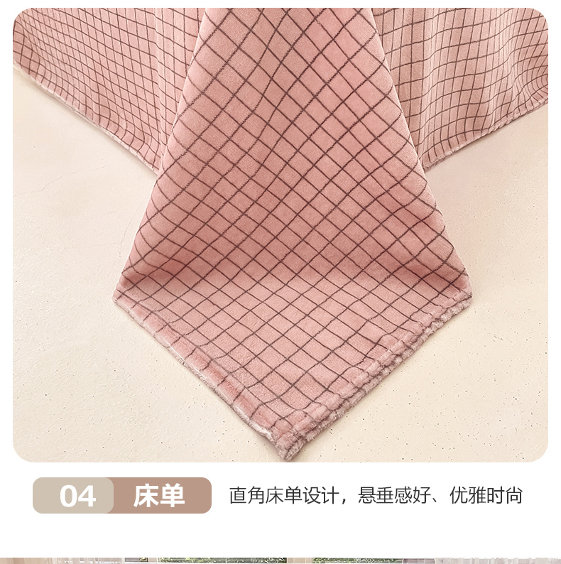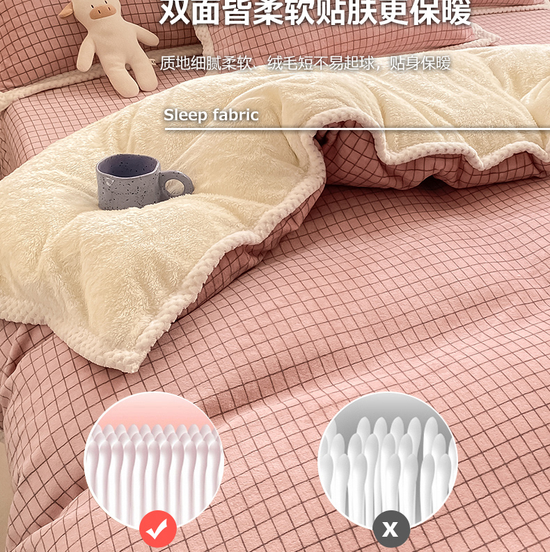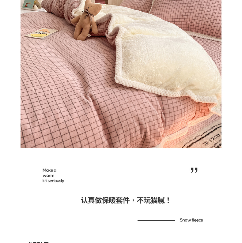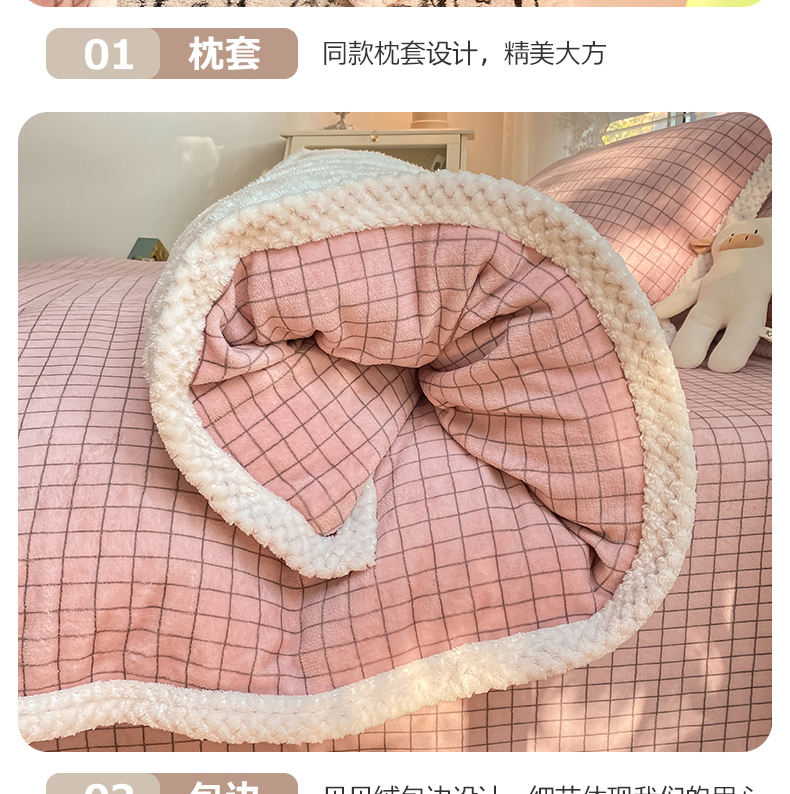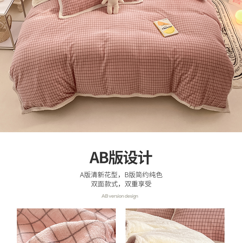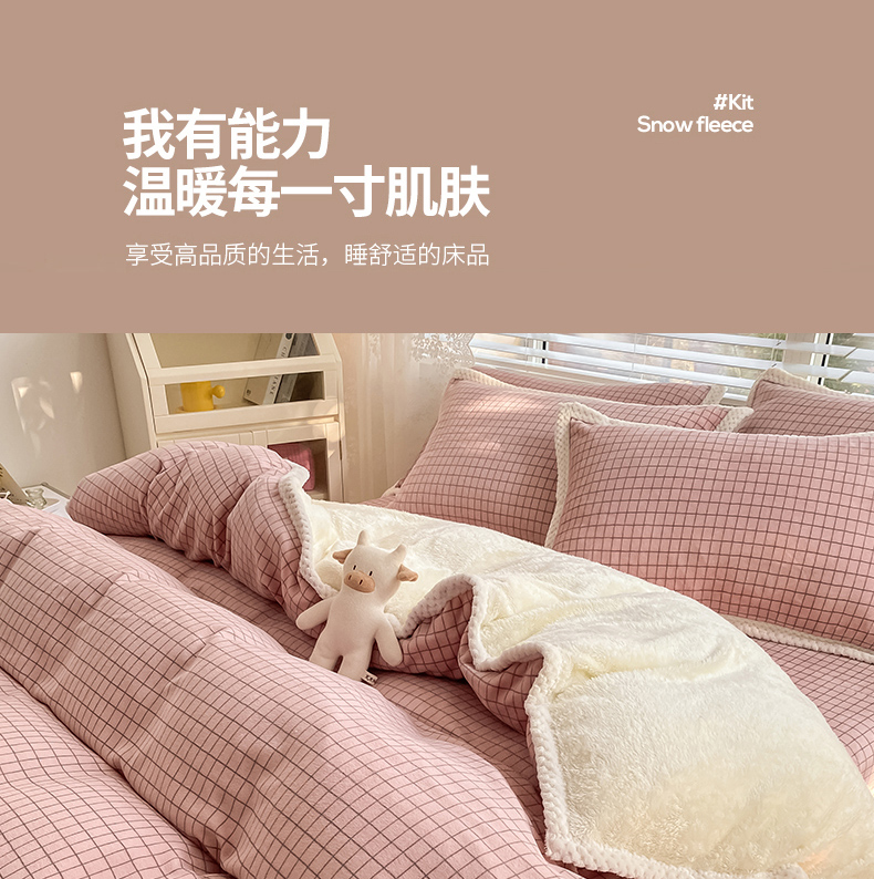 商品名称:琪格格纺织 2025新款A牛奶绒B兔兔绒保暖印花四件套 大包边绒粉小格