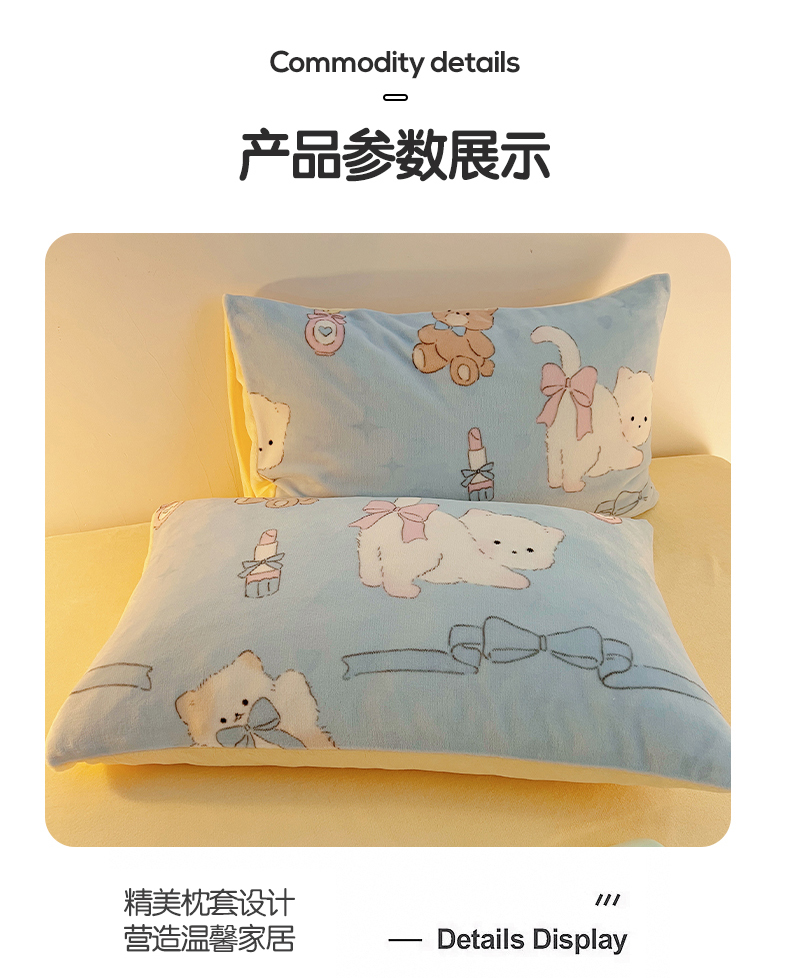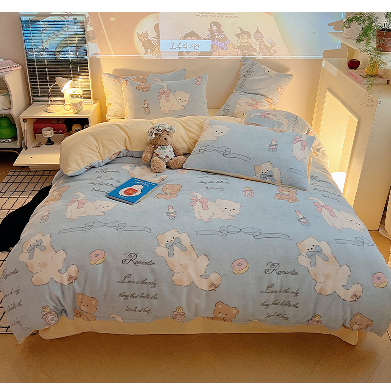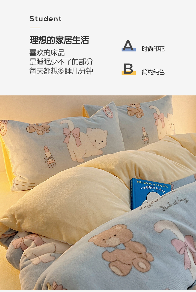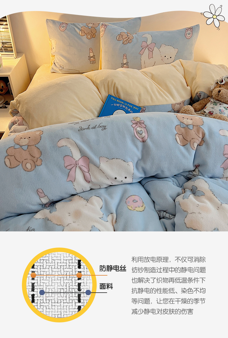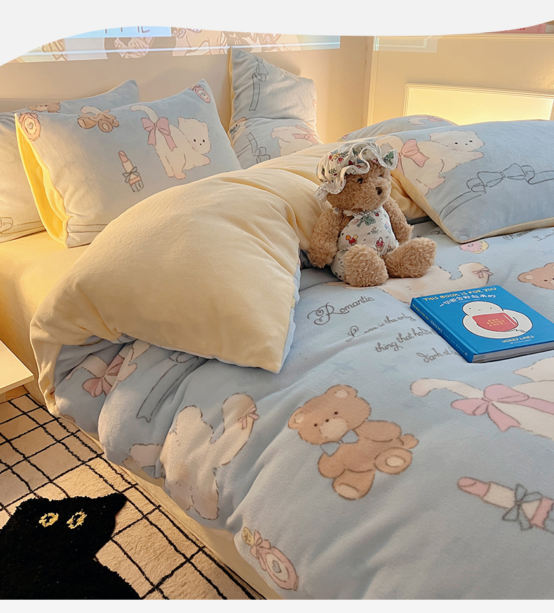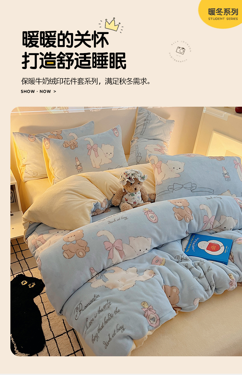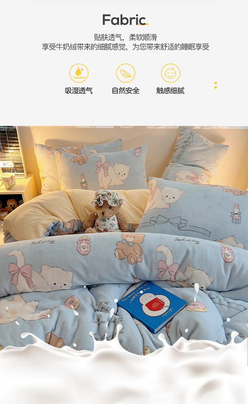 商品名称:瑞莱 2025新款A类200克高克重秋冬印花牛奶绒四件套-卡通系列 慵懒小猫