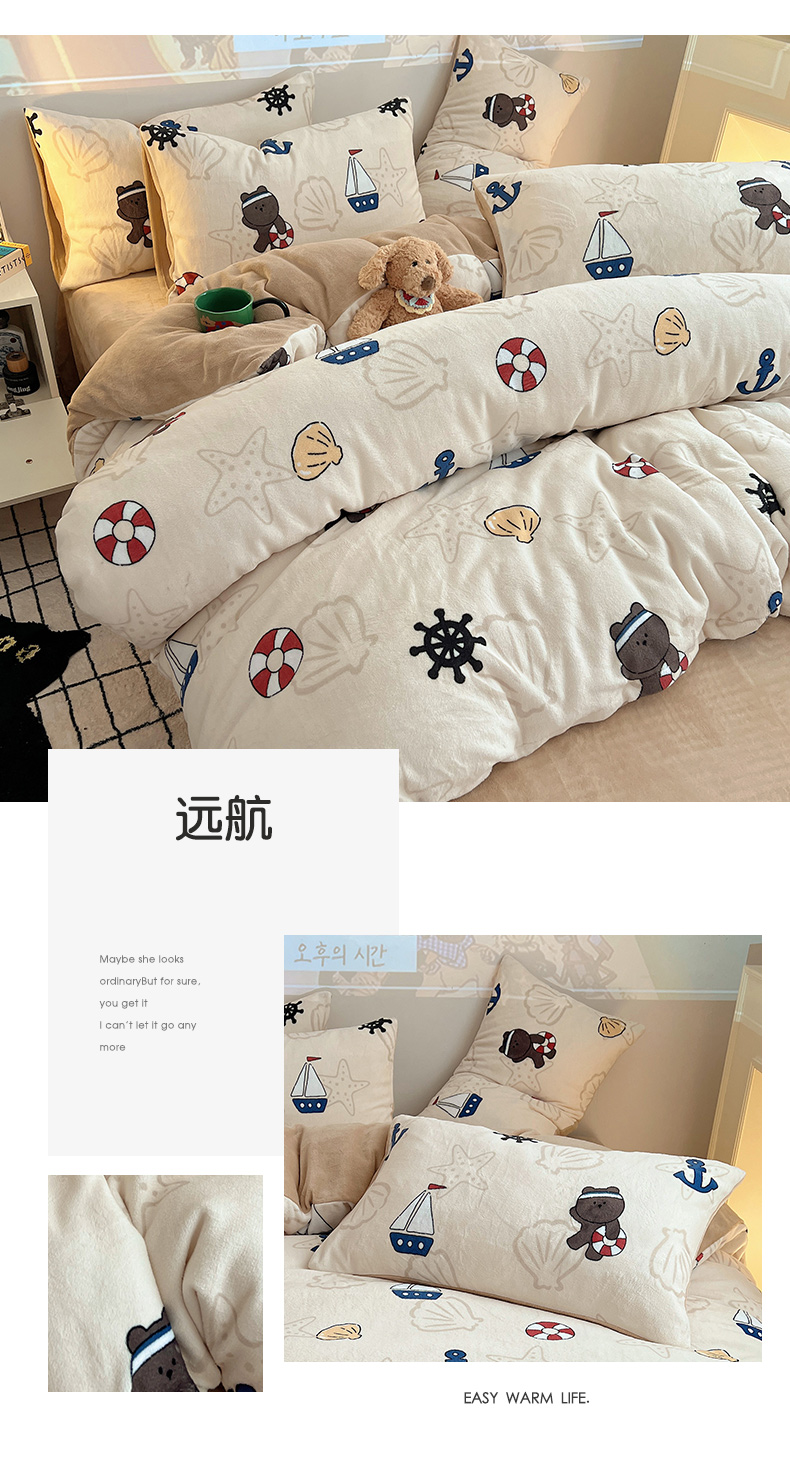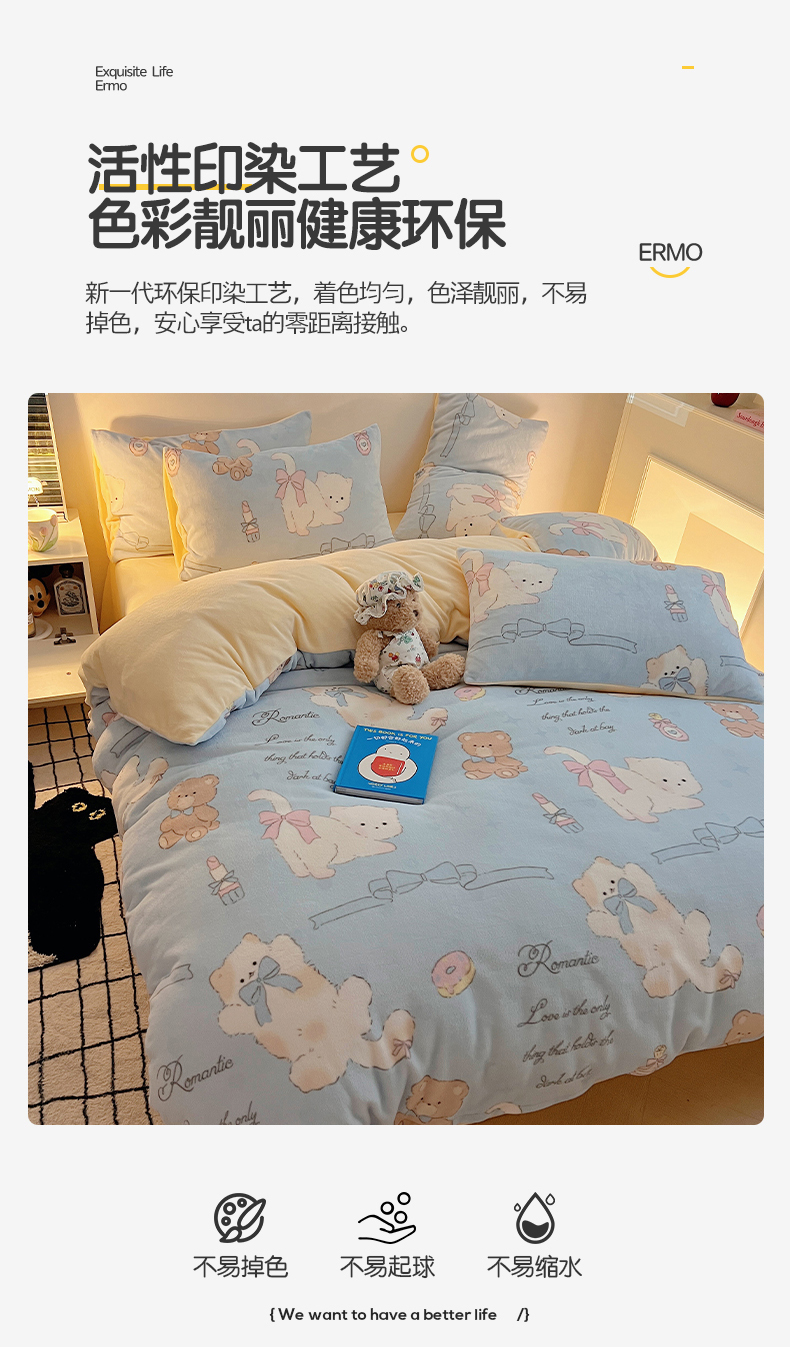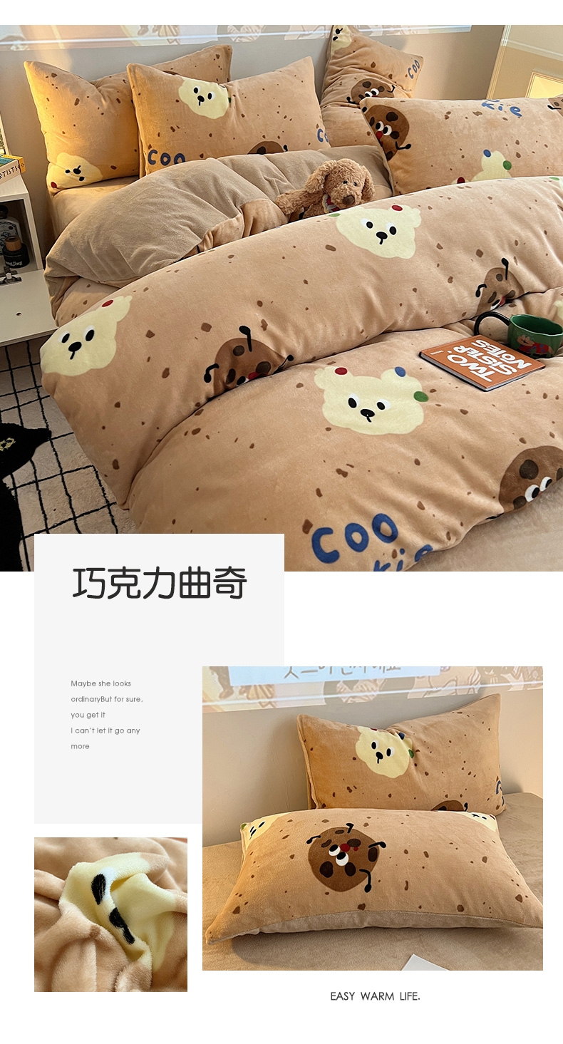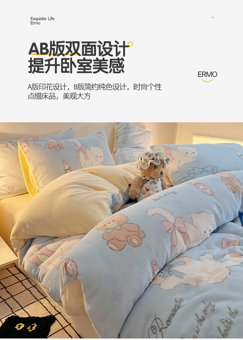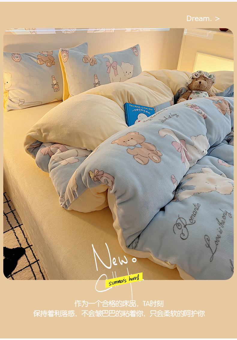 商品名称:瑞莱 2025新款A类200克高克重秋冬印花牛奶绒四件套-卡通系列 慵懒小猫