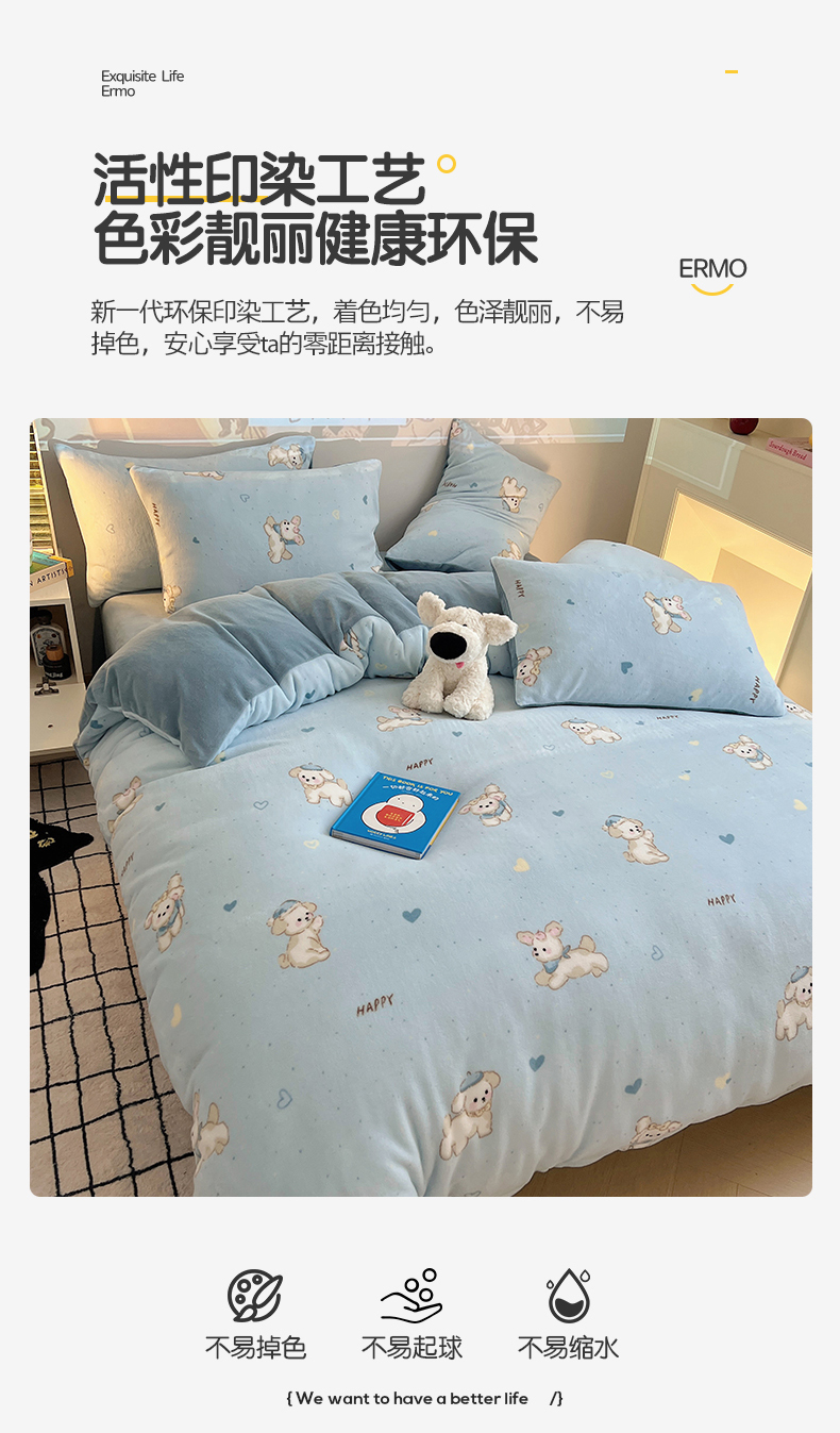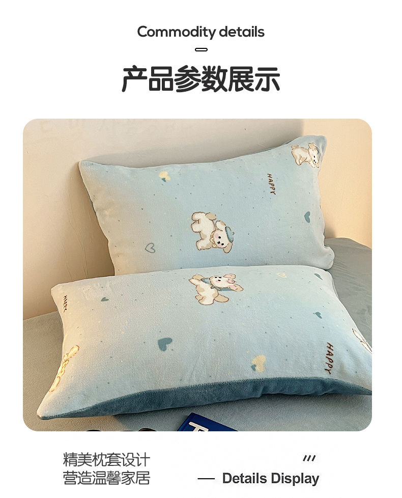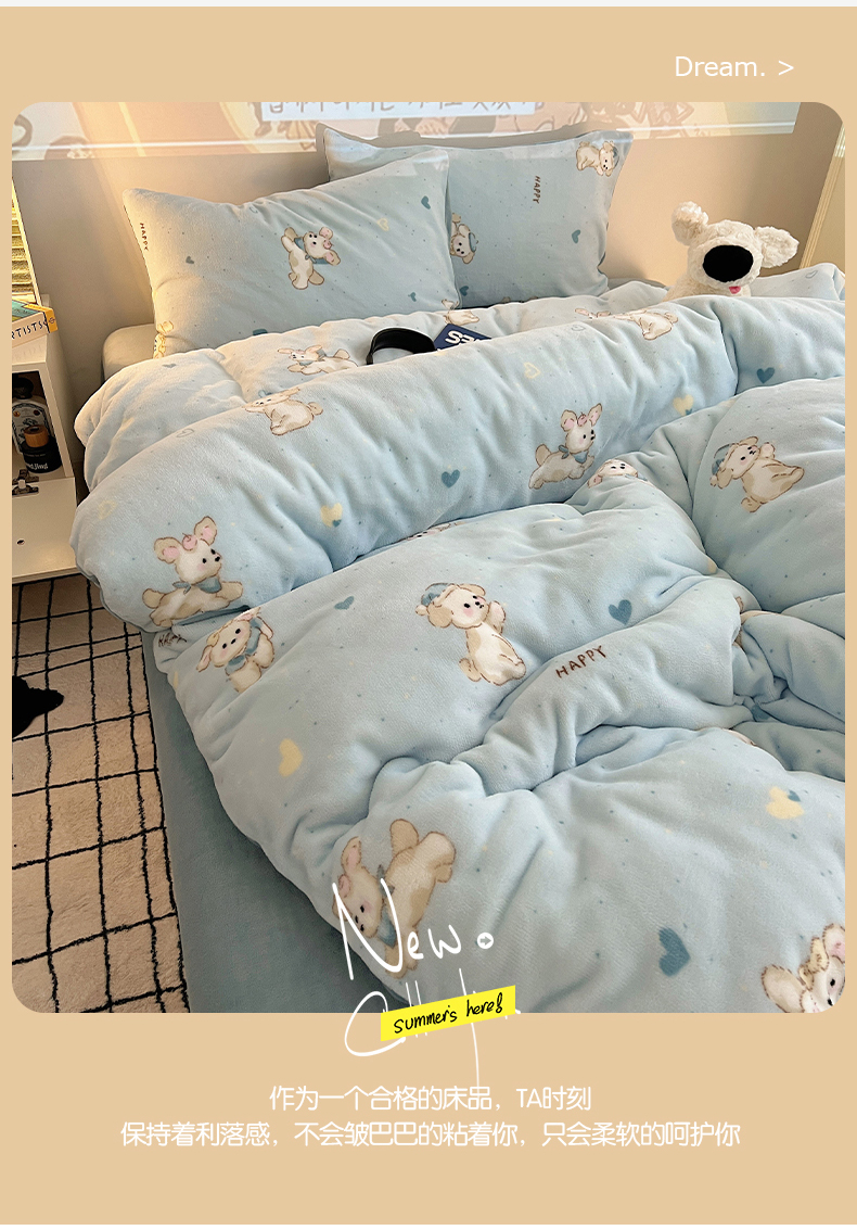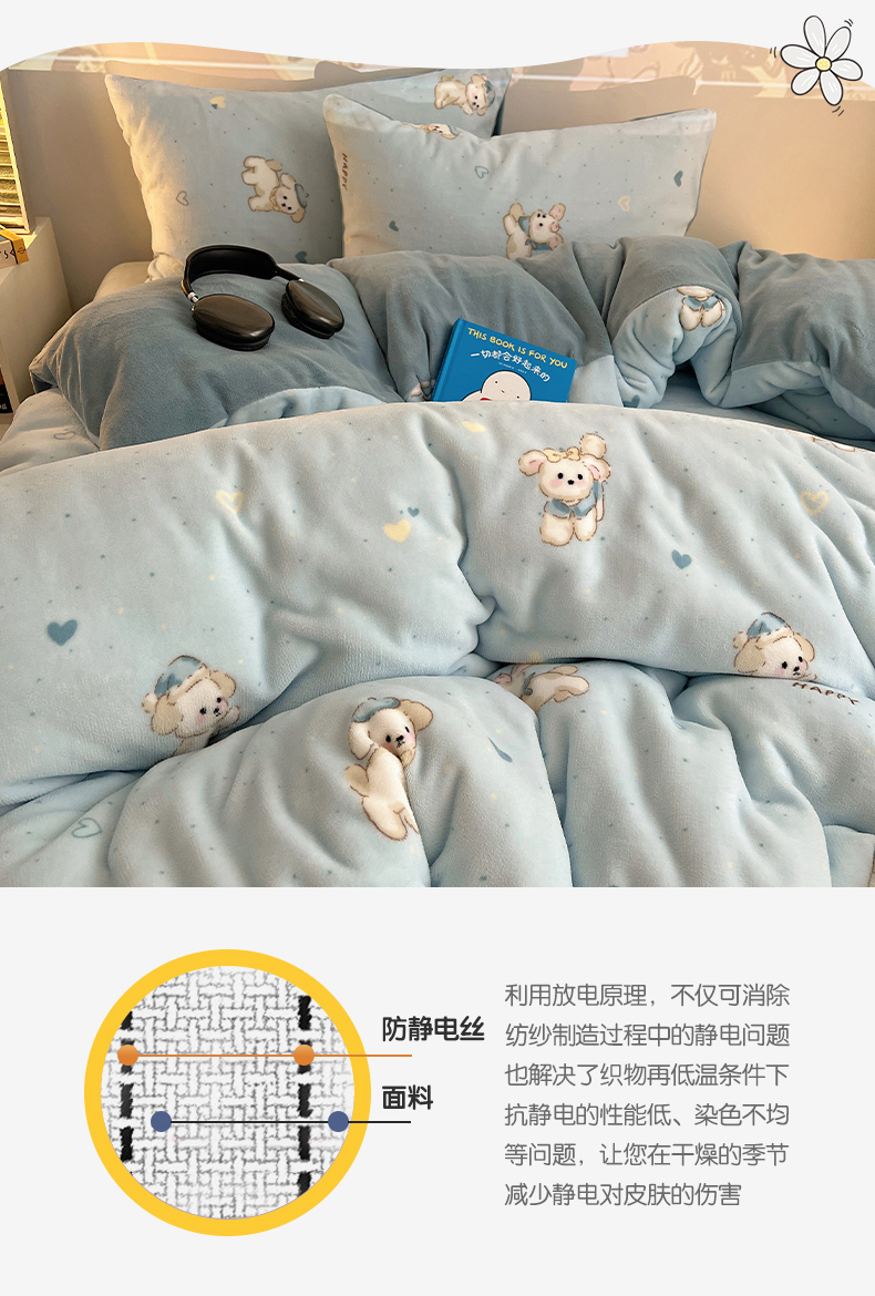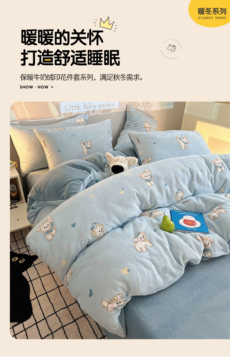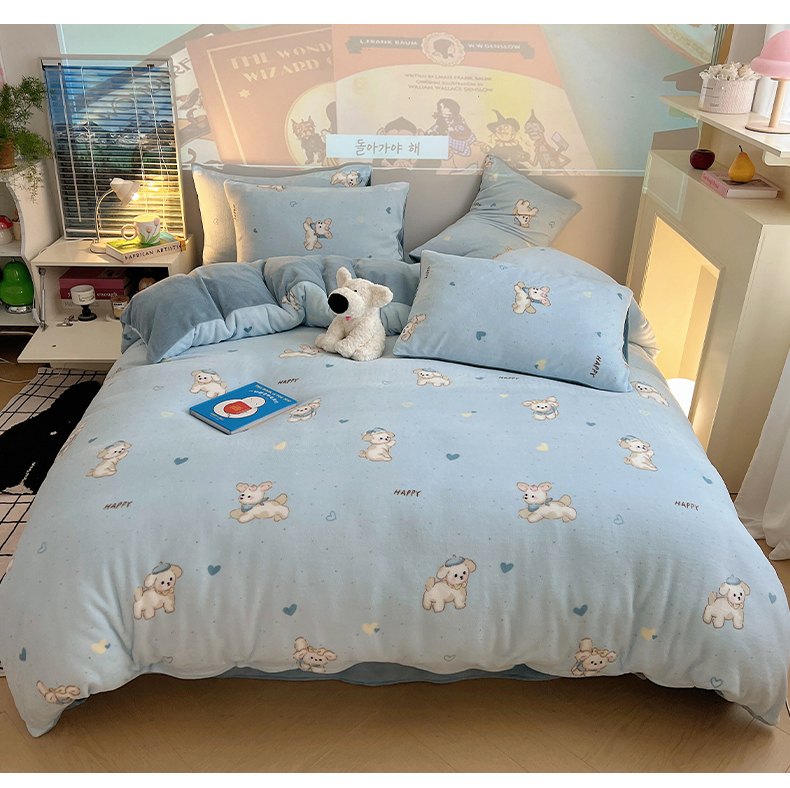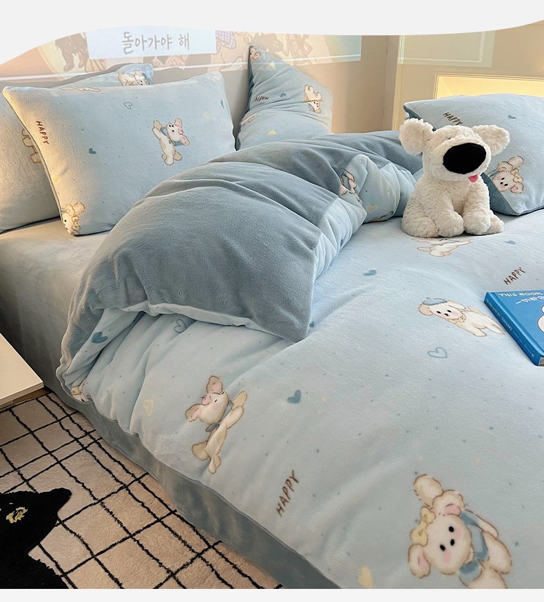 商品名称:瑞莱 2025新款A类200克高克重秋冬印花牛奶绒四件套-卡通系列 绒小奶狗