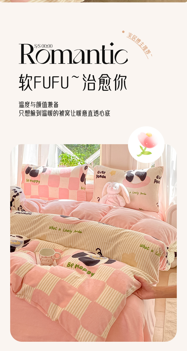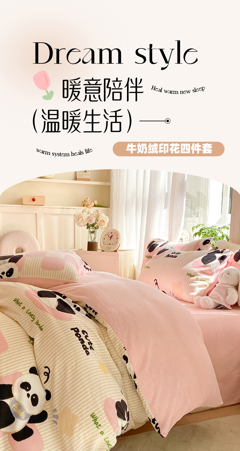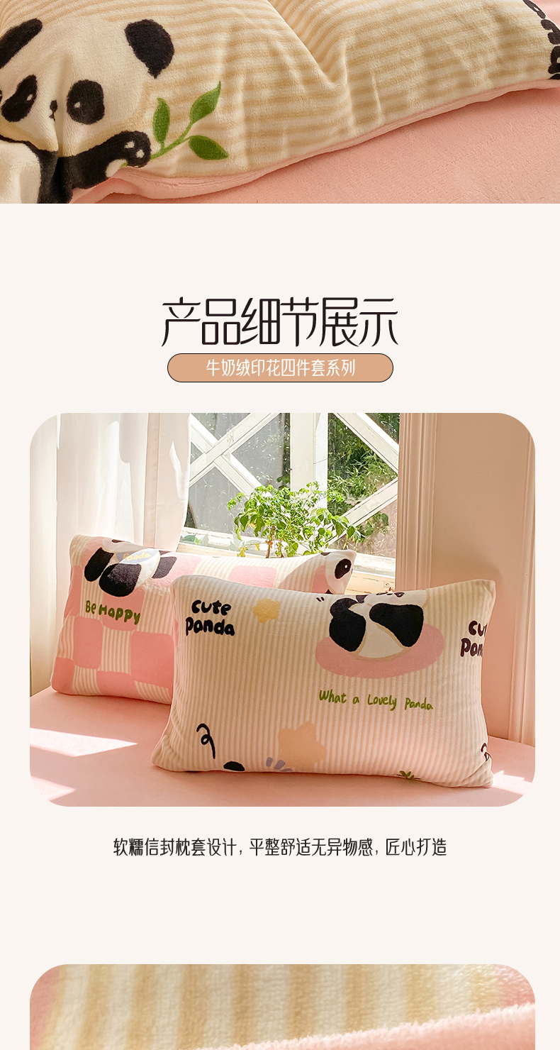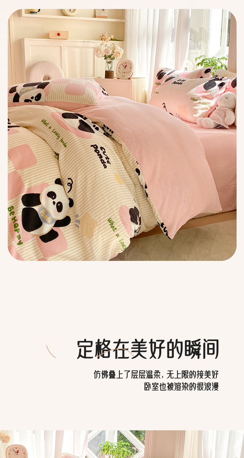 豫见家纺 2025新款牛奶绒印花四件套 熊猫乐园-粉