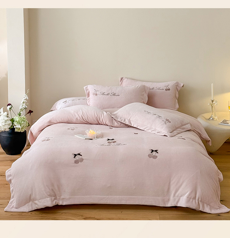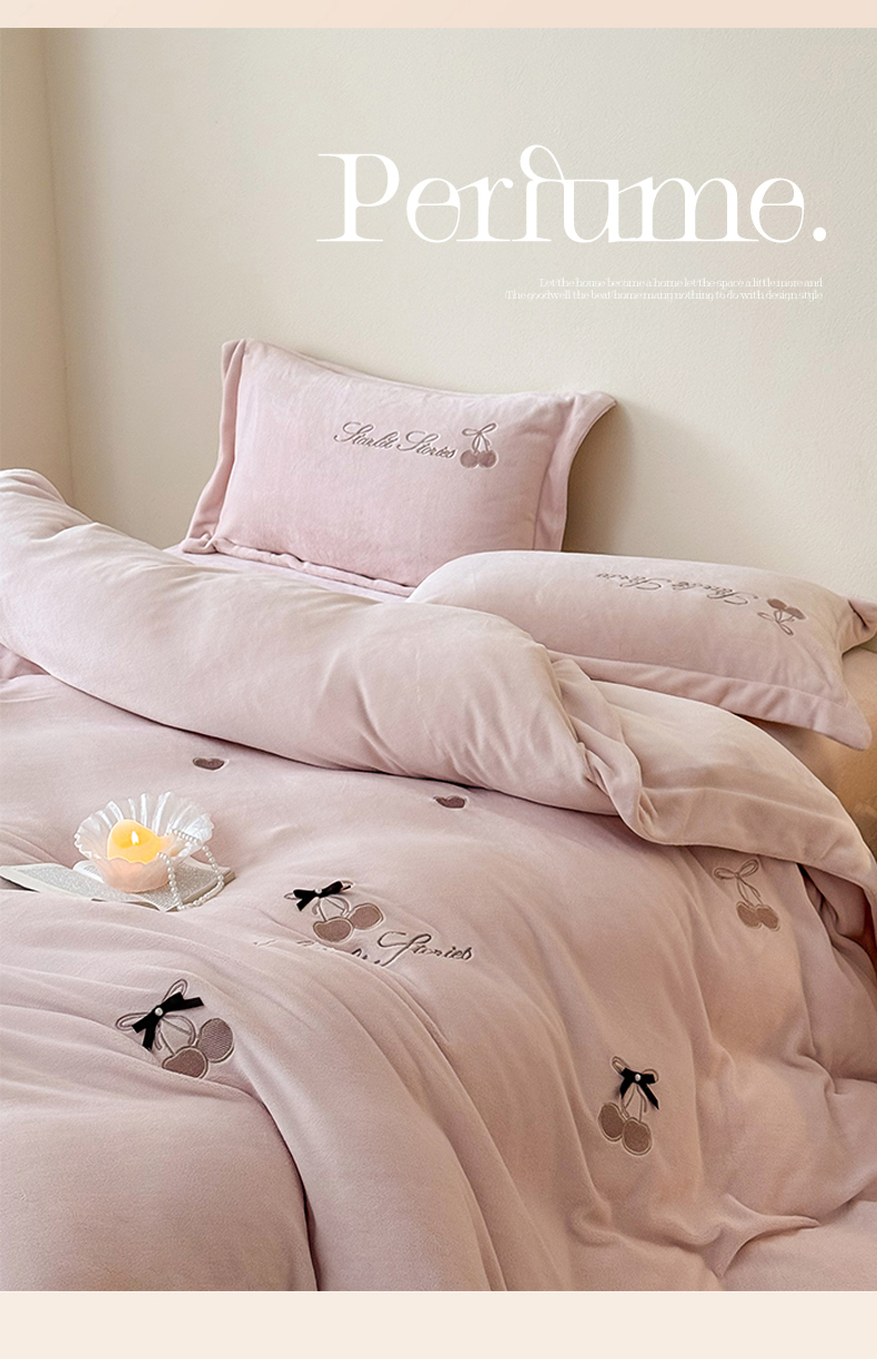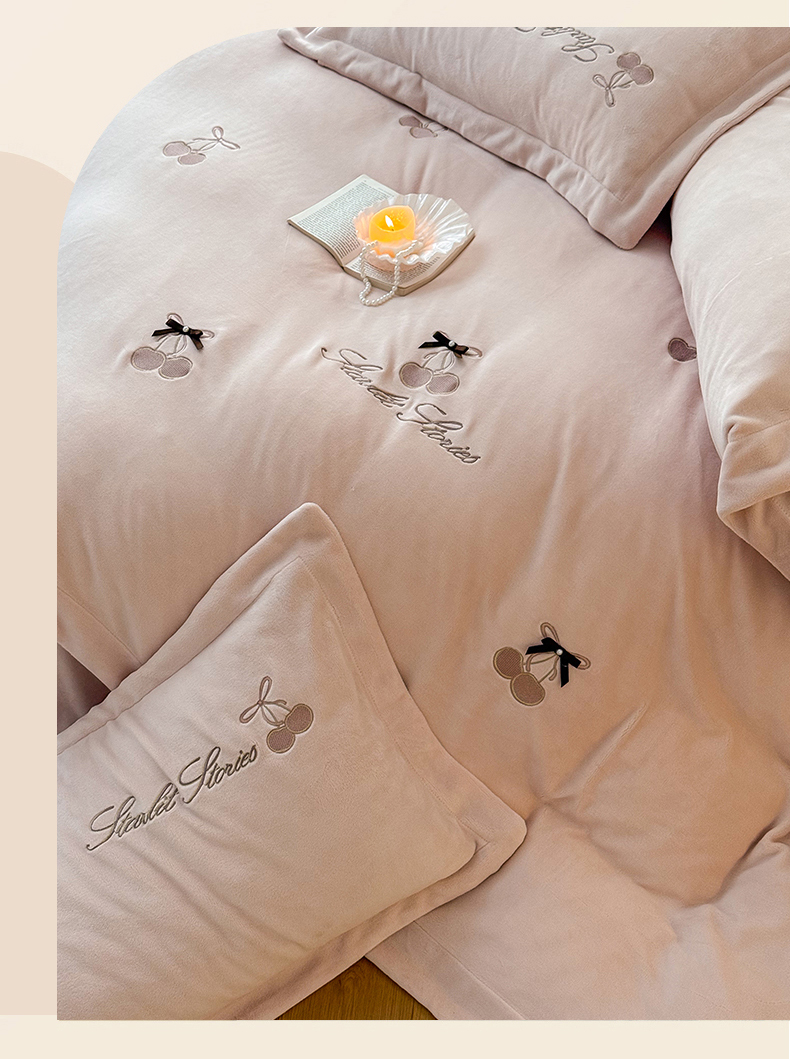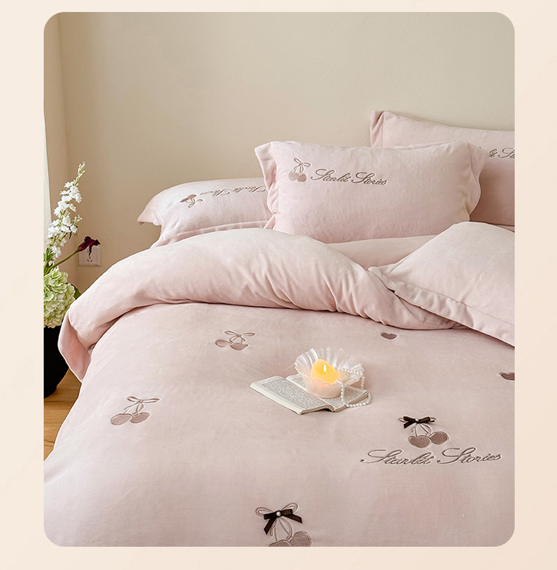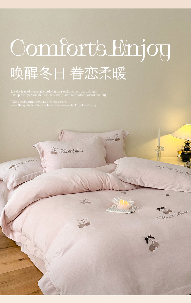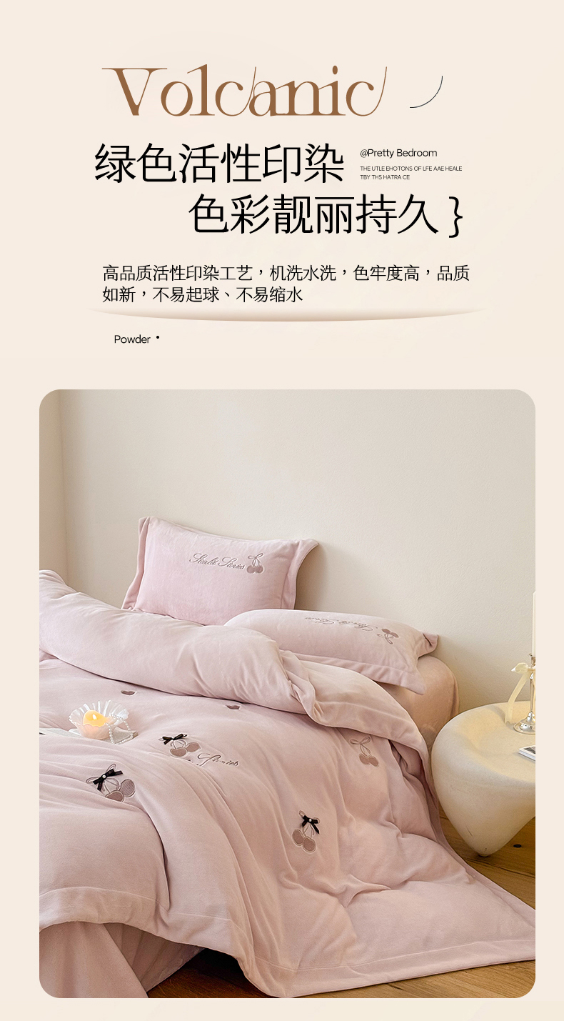 泽西家纺+V17798841158发大图 2025新品秋冬加厚保暖220克9斤刺绣牛奶绒四件套-樱桃泡泡糖 樱桃泡泡糖-粉色