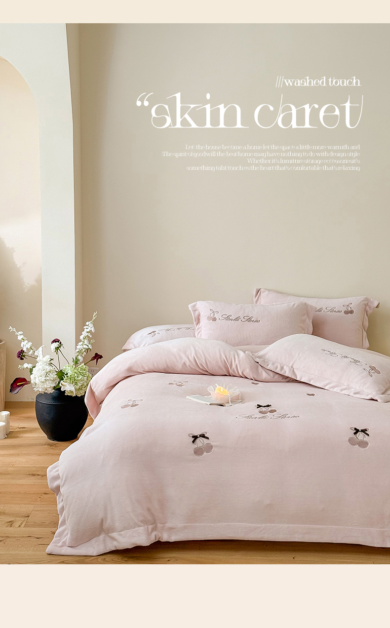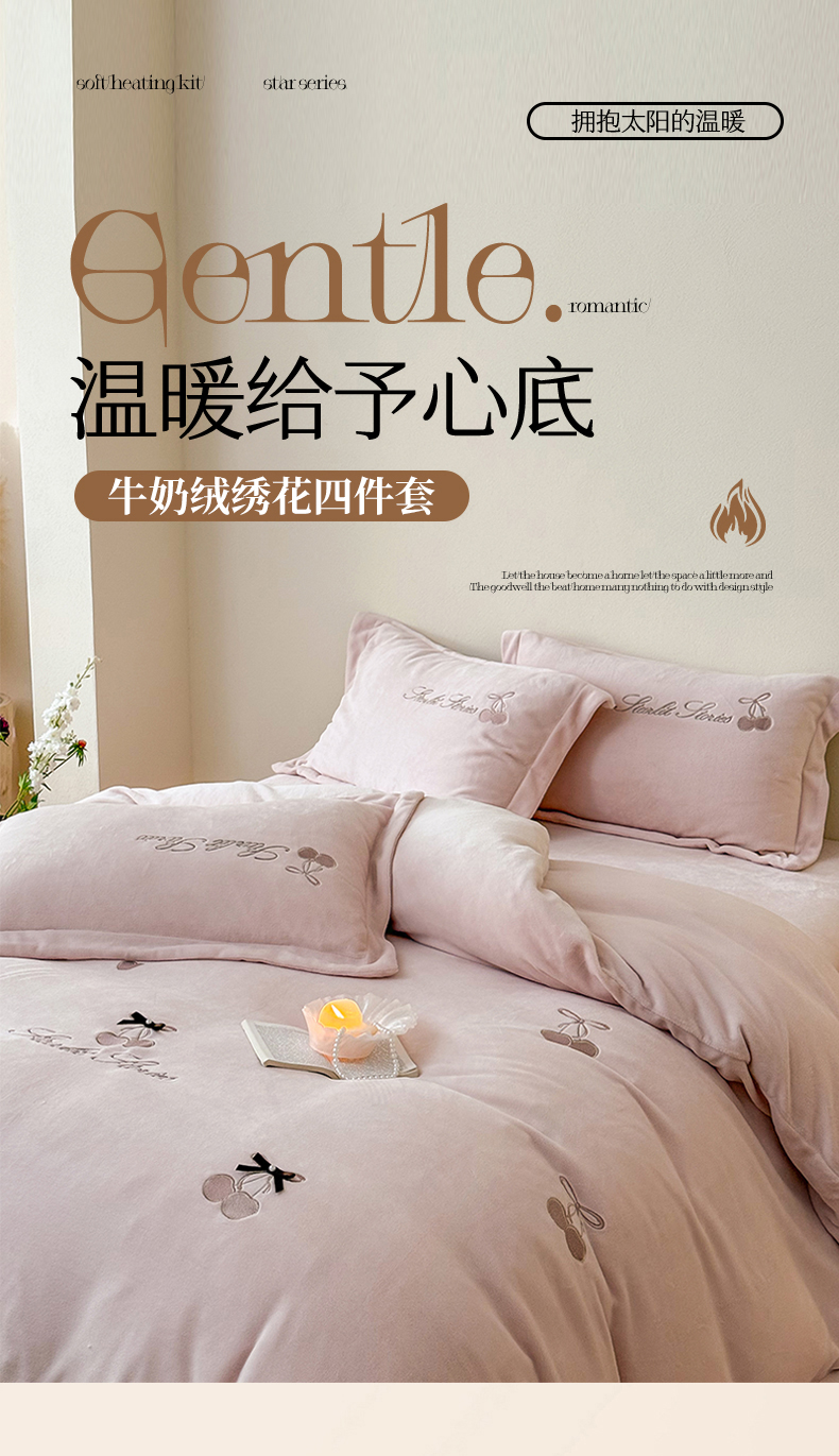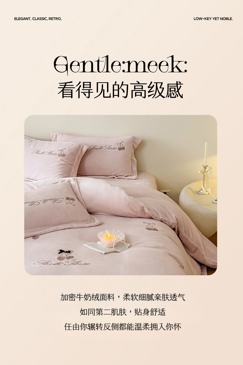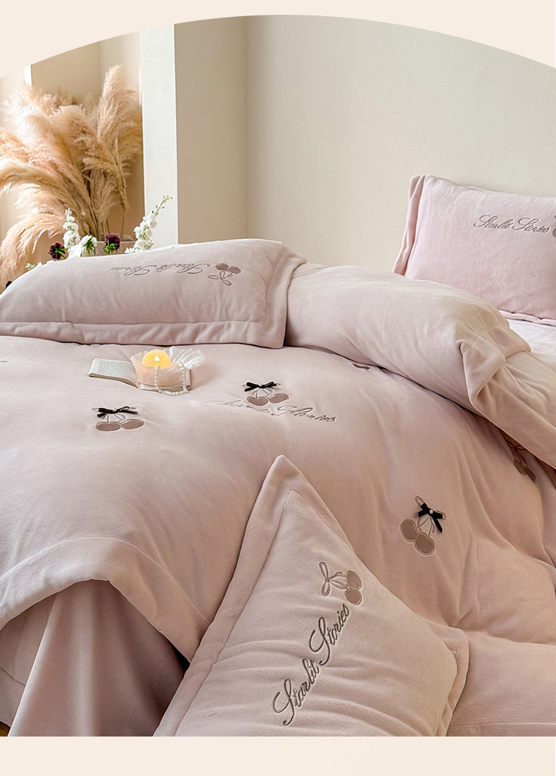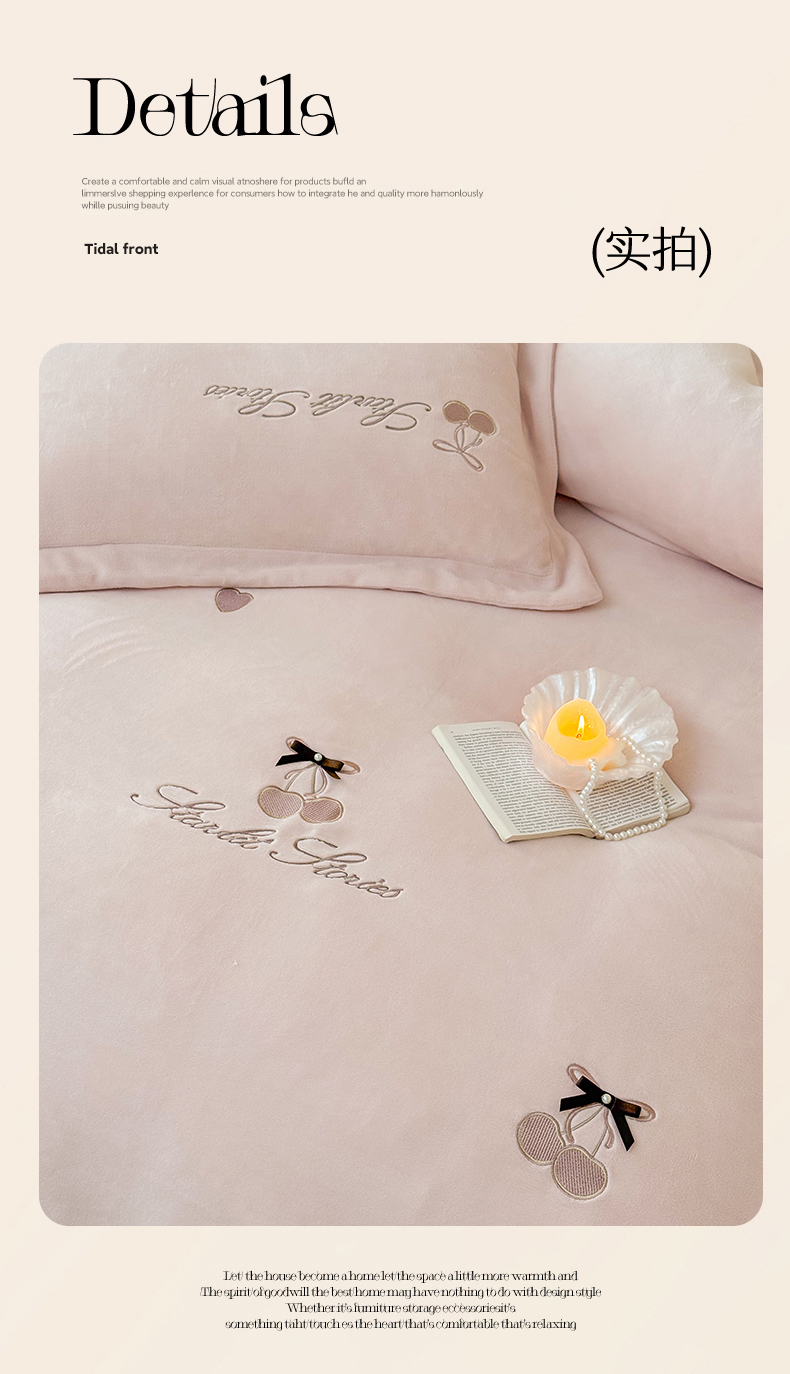 泽西家纺+V17798841158发大图 2025新品秋冬加厚保暖220克9斤刺绣牛奶绒四件套-樱桃泡泡糖 樱桃泡泡糖-粉色