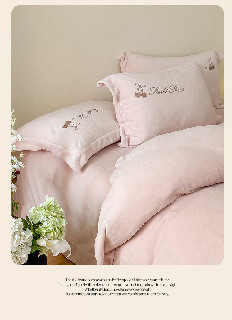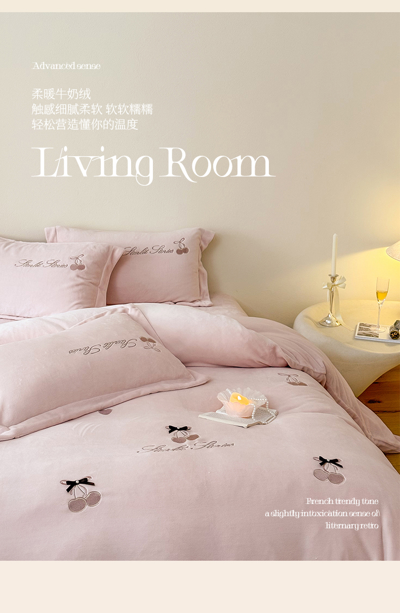 商品名称:泽西家纺+V17798841158发大图 2025新品秋冬加厚保暖220克9斤刺绣牛奶绒四件套-樱桃泡泡糖 樱桃泡泡糖-粉色