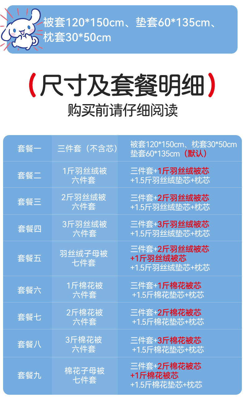 三件套(不含芯):被套120x150cm+垫套60x135cm+枕套30x50cm | ¥60.00 |