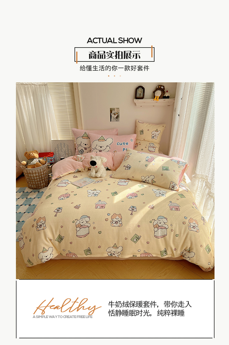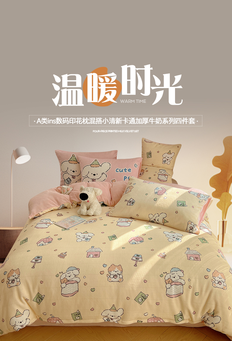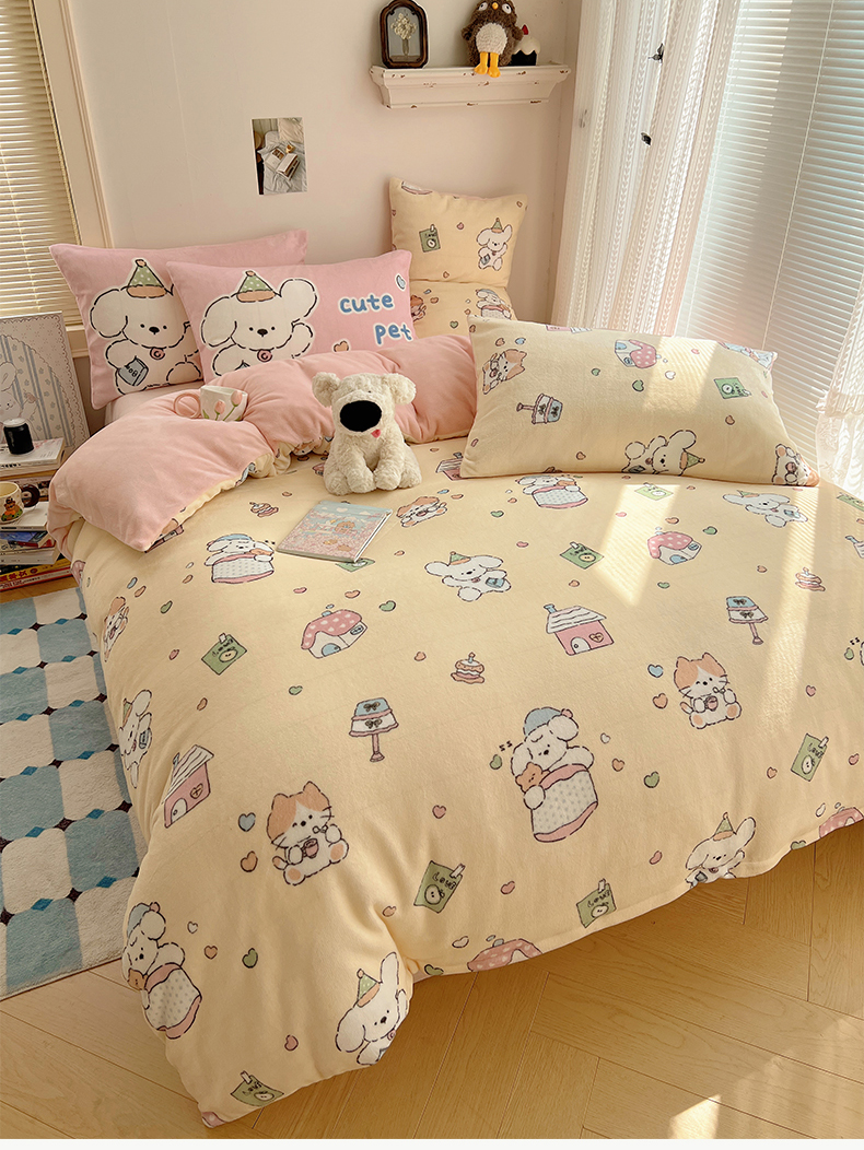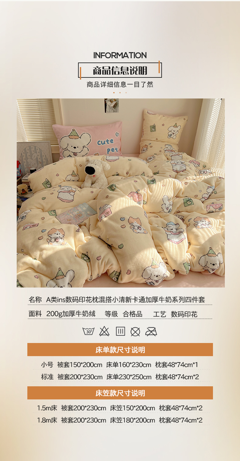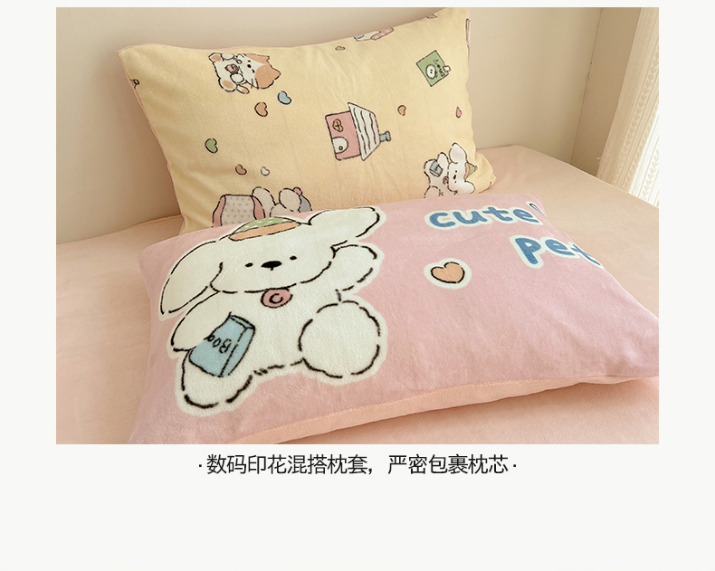商品名称:桃子家居 2025新款A类ins数码印花枕混搭小清新少女卡通猫咪加厚牛奶系列四件套 绒-混搭奶黄日记