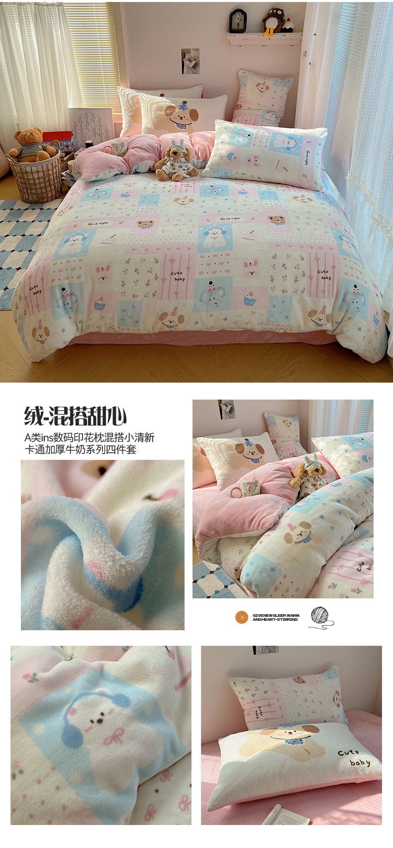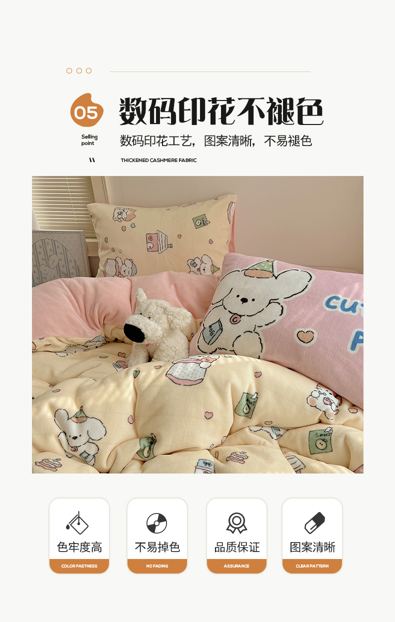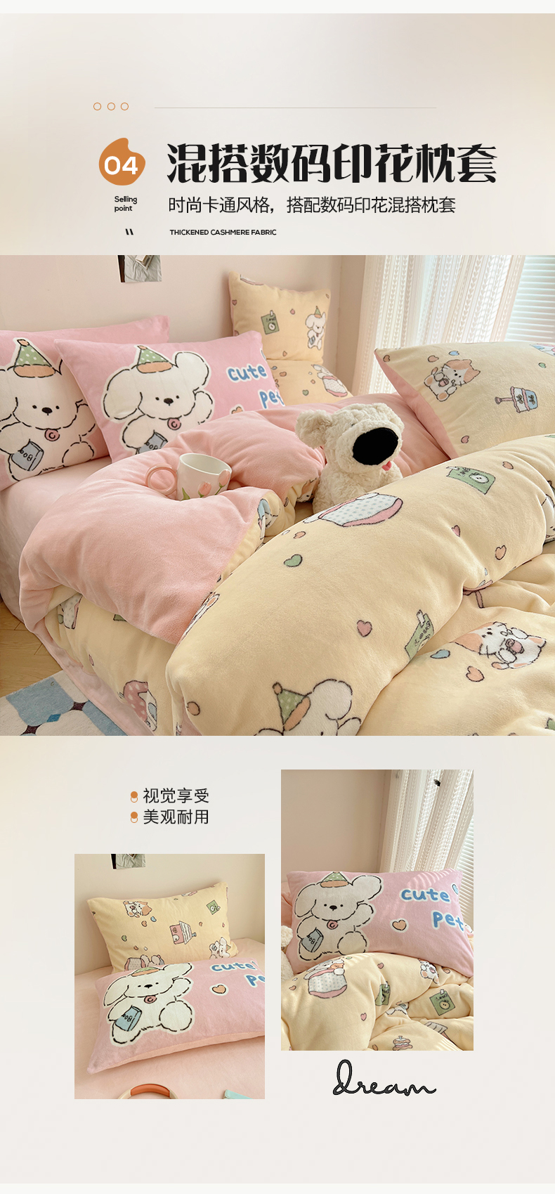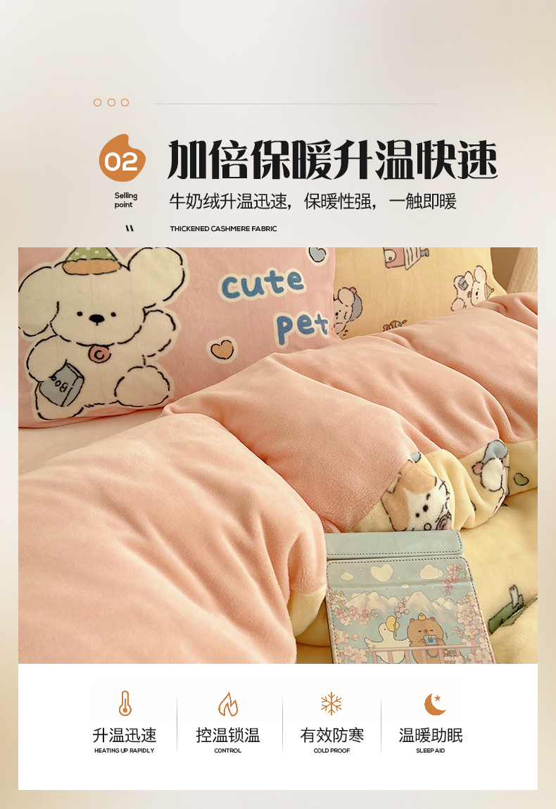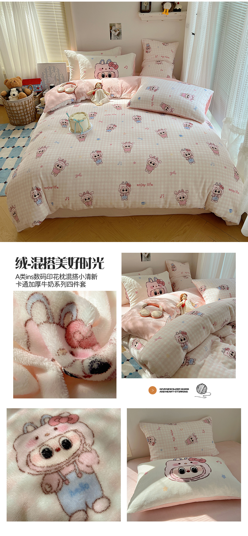 商品名称:桃子家居 2025新款A类ins数码印花枕混搭小清新少女卡通猫咪加厚牛奶系列四件套 绒-混搭奶黄日记