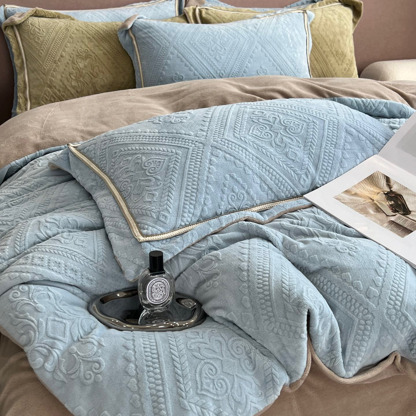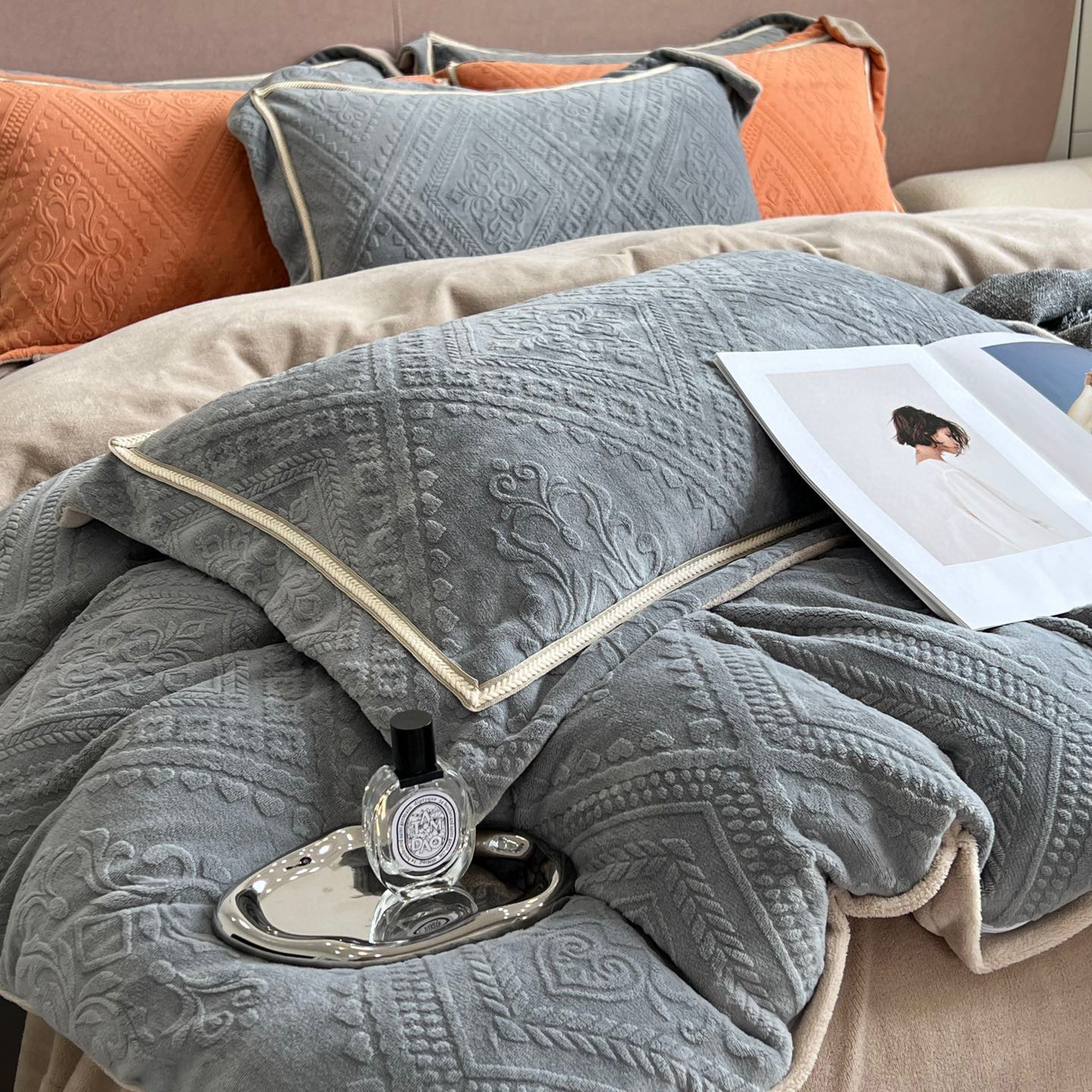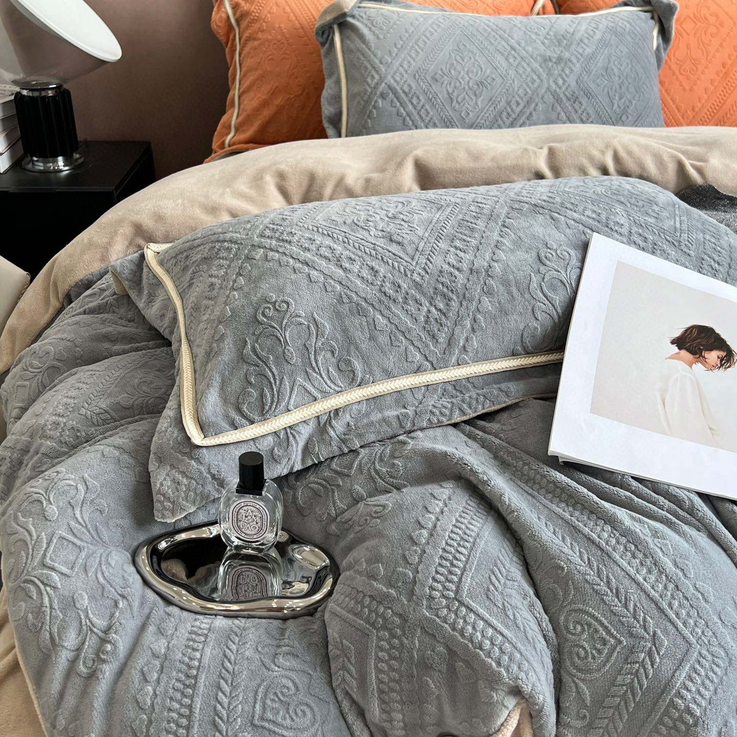 (总)纯优家纺 2025秋冬新品拼角款牛奶绒雕花四件套-花枳菁语,花枳菁语-粉色,花枳菁语-灰色,花枳菁语-蓝色,花枳菁语-奶咖