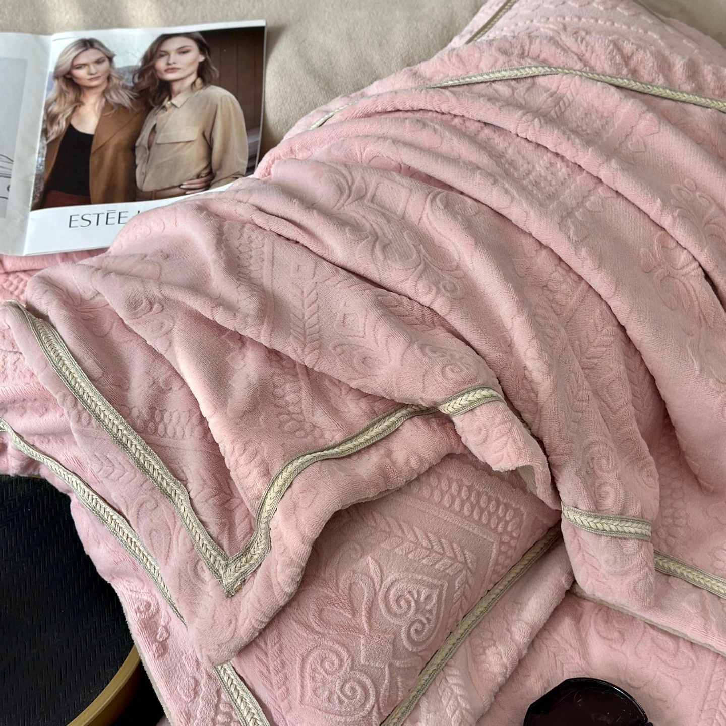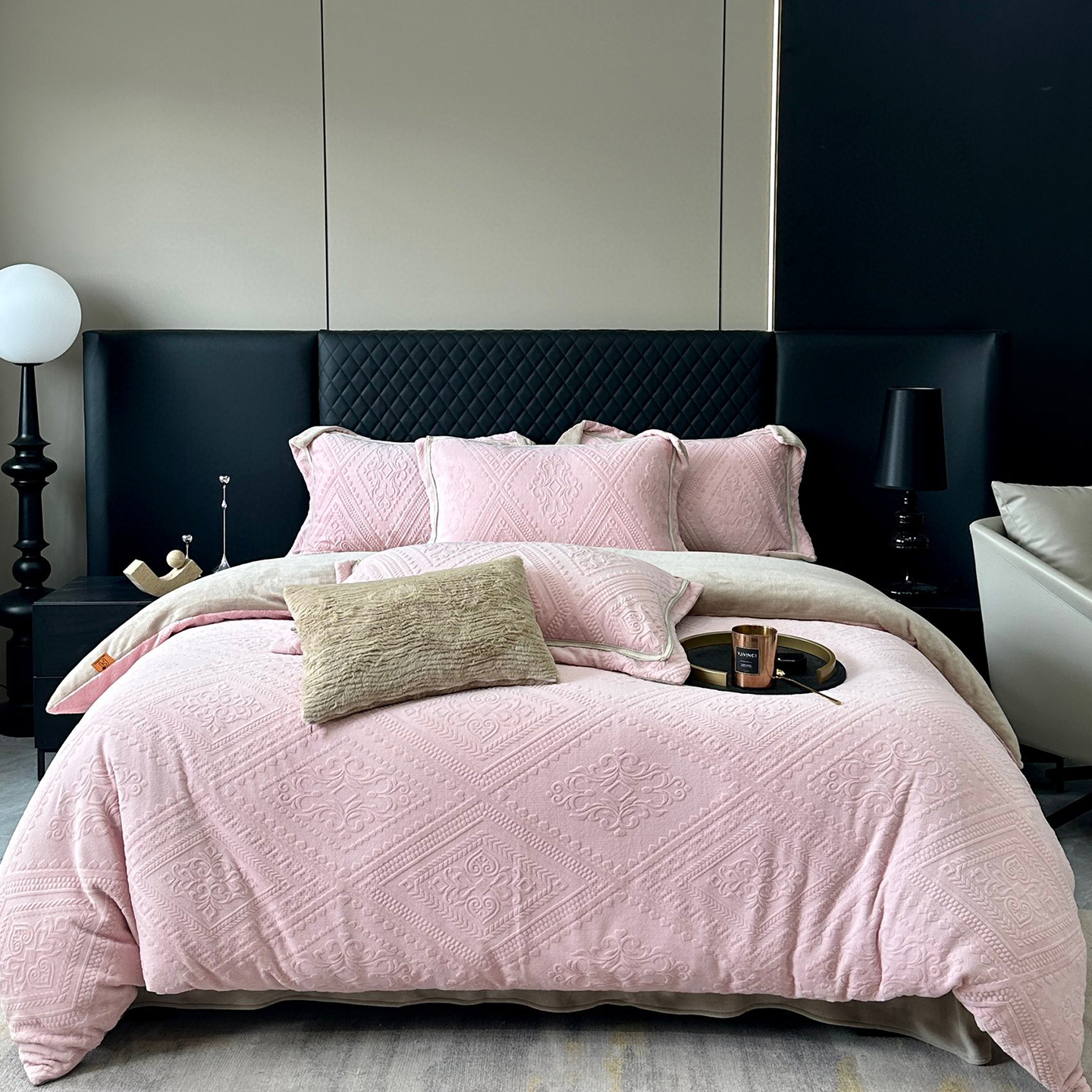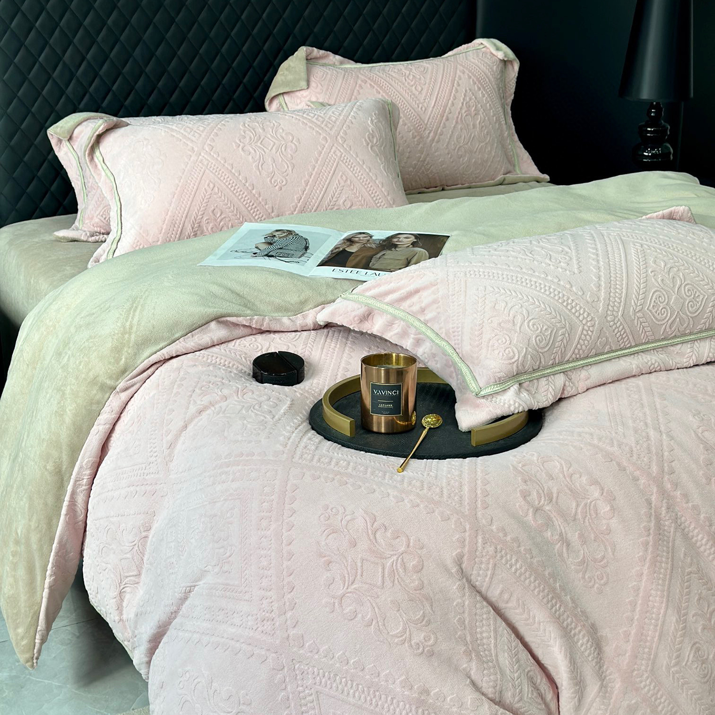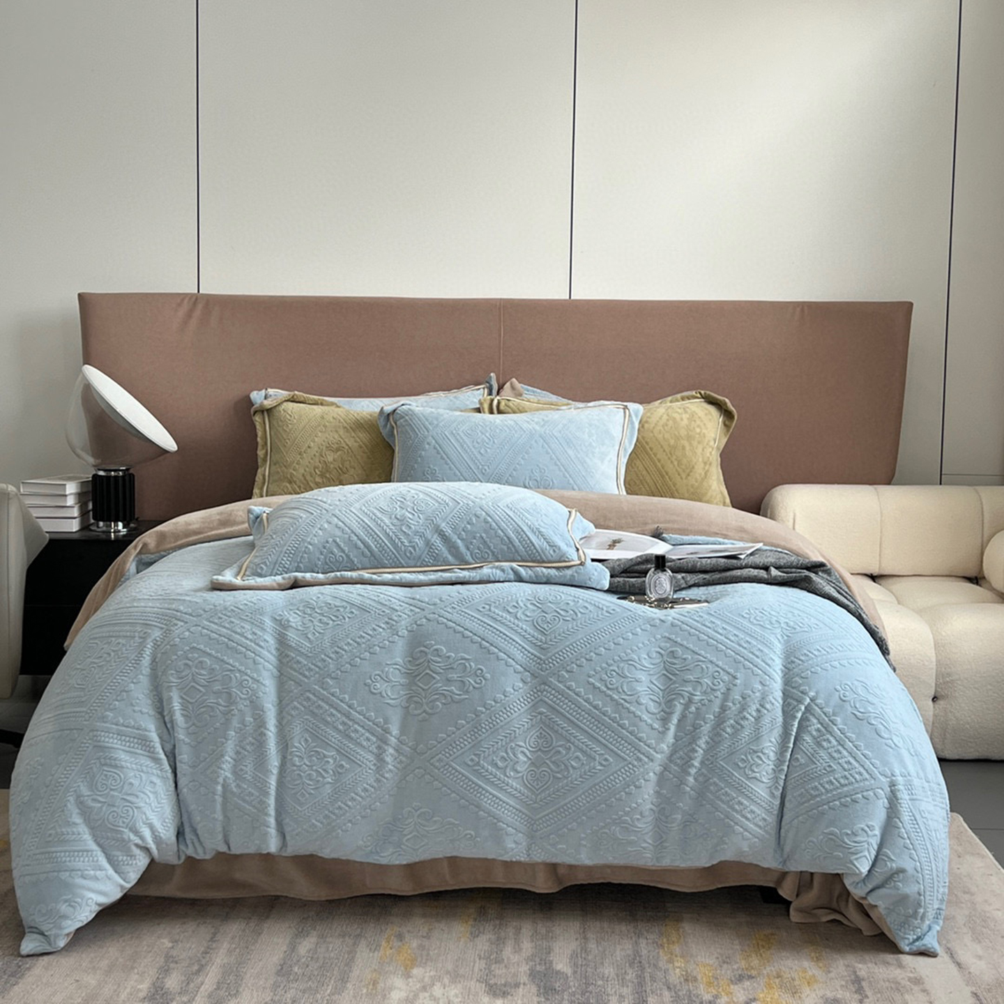 (总)纯优家纺 2025秋冬新品拼角款牛奶绒雕花四件套-花枳菁语,花枳菁语-粉色,花枳菁语-灰色,花枳菁语-蓝色,花枳菁语-奶咖