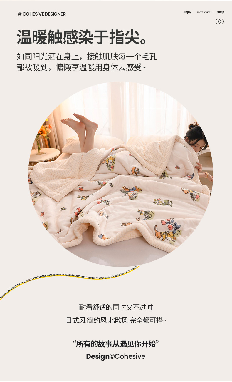 印季家纺 2025新款三层夹棉印花牛奶绒毛毯毯子 花丛兔