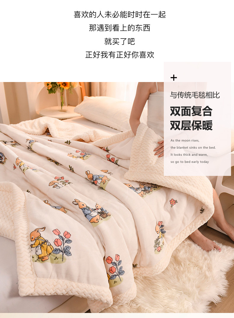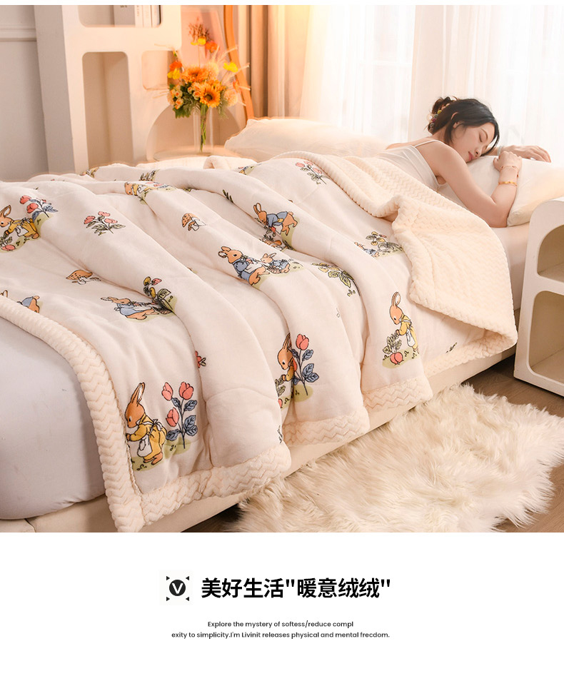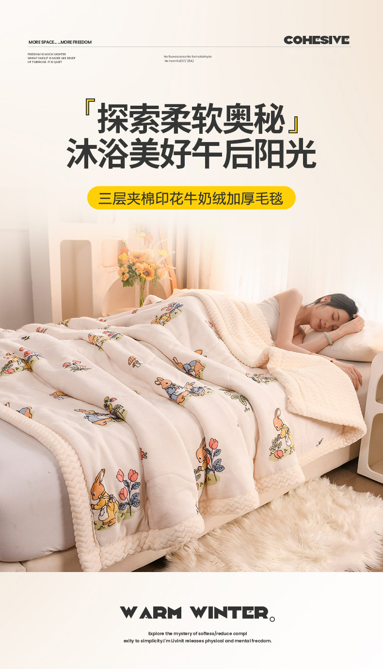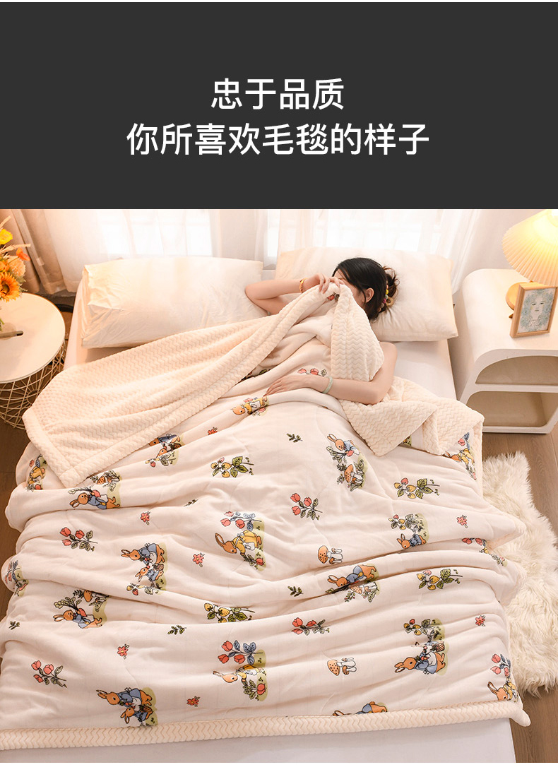 商品名称:印季家纺 2025新款三层夹棉印花牛奶绒毛毯毯子 花丛兔