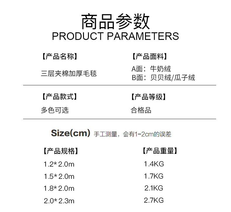 [{"sp_id":11,"sp_name":"\u989c\u8272","sp_format":2,"sp_list":[{"sp_value_id":657,"sp_value_name":"\u5e78\u8fd0\u72d7","sp_value_image":{"id":999,"path":"https:\/\/img3.91jf.com\/ghelp\/2025\/20251012\/20251012105301_516193.jpeg"},"sp_value_video":{"id":0,"img":"","path":"","time":0,"download_num":0,"play_num":0},"price":"65.00","storage":2000,"weight":"1.400","is_check_weight":0,"plus_price":"","sp_sort":17}]},{"sp_id":12,"sp_name":"\u5c3a\u5bf8","sp_format":1,"sp_list":[{"sp_value_id":75,"sp_value_name":"120x200cm","sp_value_image":{"id":0,"path":""},"sp_value_video":{"id":0,"img":"","path":"","time":0,"download_num":0,"play_num":0},"price":"65.00","storage":500,"weight":"1.400","is_check_weight":0,"plus_price":"","sp_sort":5},{"sp_value_id":76,"sp_value_name":"150x200cm","sp_value_image":{"id":0,"path":""},"sp_value_video":{"id":0,"img":"","path":"","time":0,"download_num":0,"play_num":0},"price":"70.00","storage":500,"weight":"1.700","is_check_weight":0,"plus_price":"","sp_sort":6},{"sp_value_id":77,"sp_value_name":"180x200cm","sp_value_image":{"id":0,"path":""},"sp_value_video":{"id":0,"img":"","path":"","time":0,"download_num":0,"play_num":0},"price":"75.00","storage":500,"weight":"2.100","is_check_weight":0,"plus_price":"","sp_sort":7},{"sp_value_id":78,"sp_value_name":"200x230cm","sp_value_image":{"id":0,"path":""},"sp_value_video":{"id":0,"img":"","path":"","time":0,"download_num":0,"play_num":0},"price":"85.00","storage":500,"weight":"2.700","is_check_weight":0,"plus_price":"","sp_sort":8}]}]