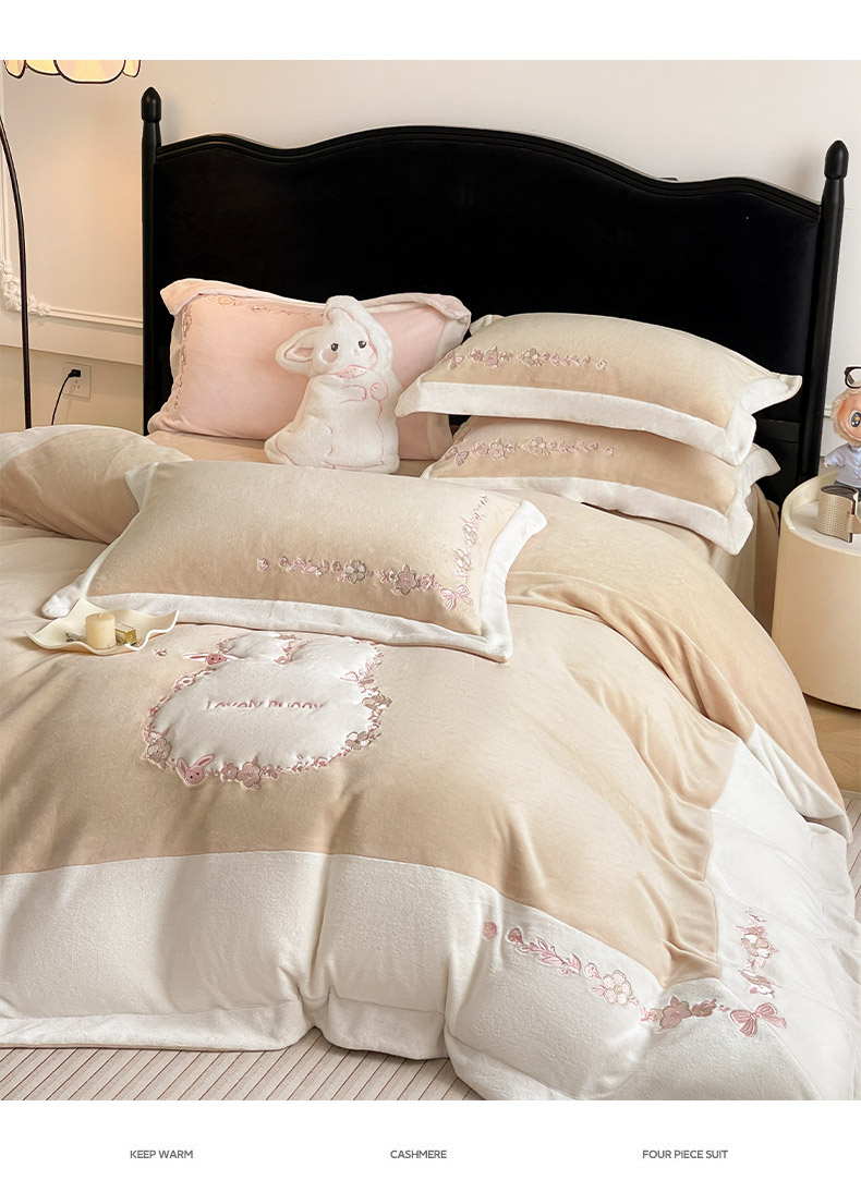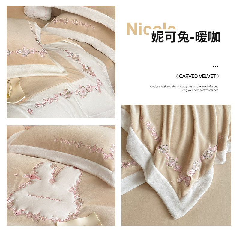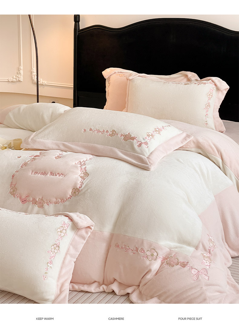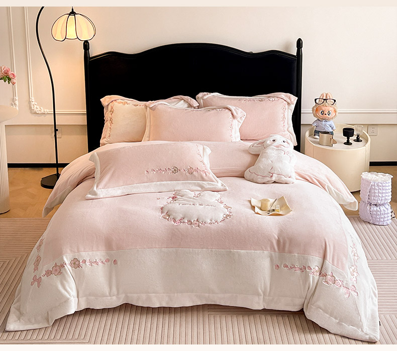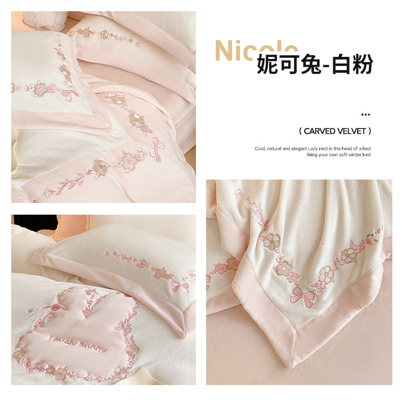 商品名称:2025直播热款A类加厚牛奶绒四件套保暖双面加绒珊瑚绒重工刺绣被套床单冬季床上用品-妮可兔 妮可兔-粉白