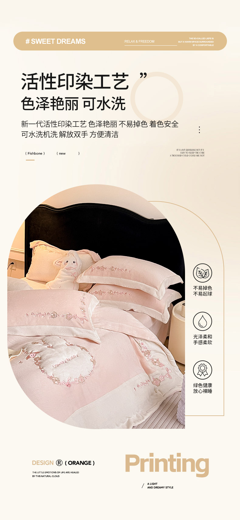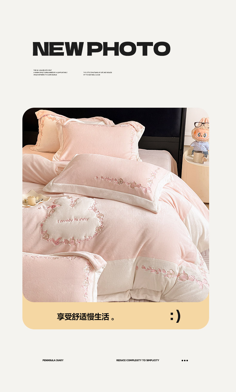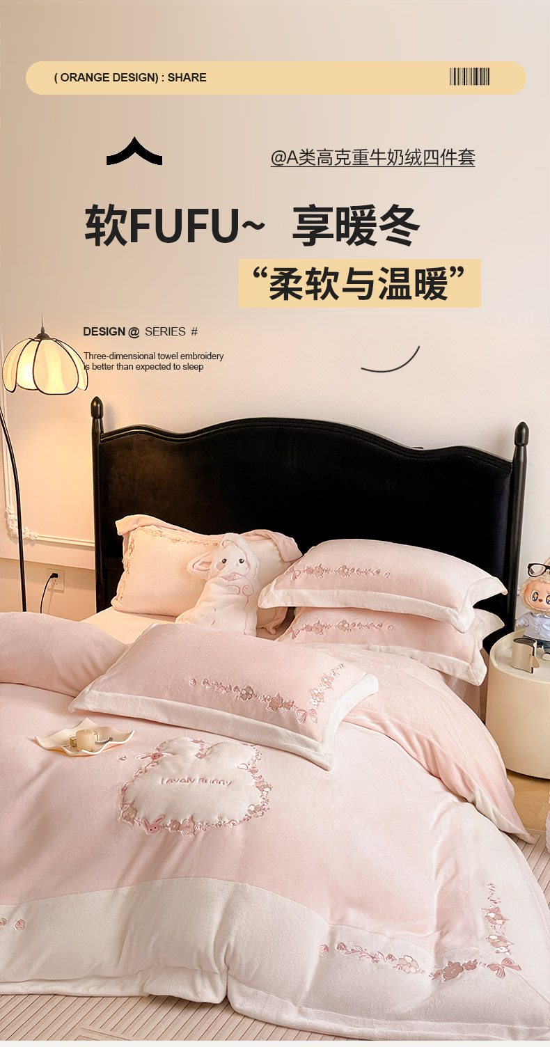 商品名称:2025直播热款A类加厚牛奶绒四件套保暖双面加绒珊瑚绒重工刺绣被套床单冬季床上用品-妮可兔 妮可兔-粉白