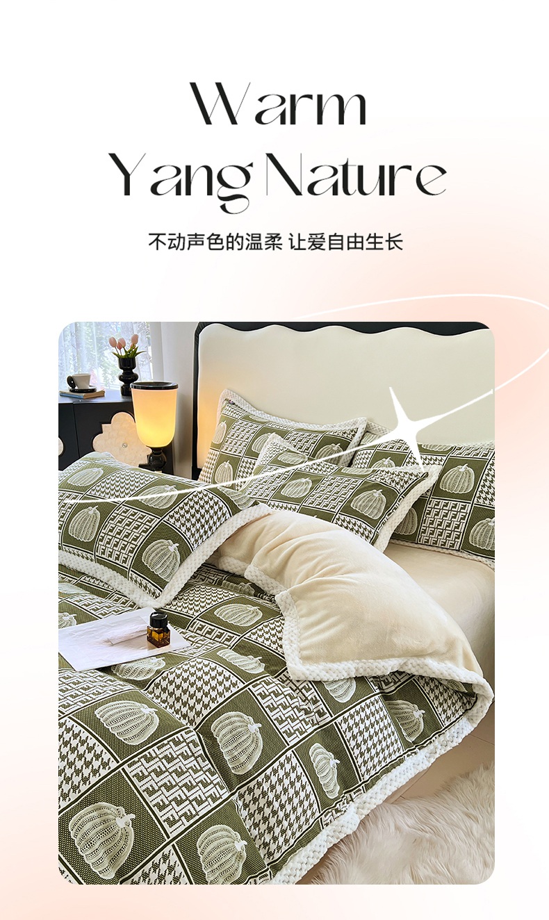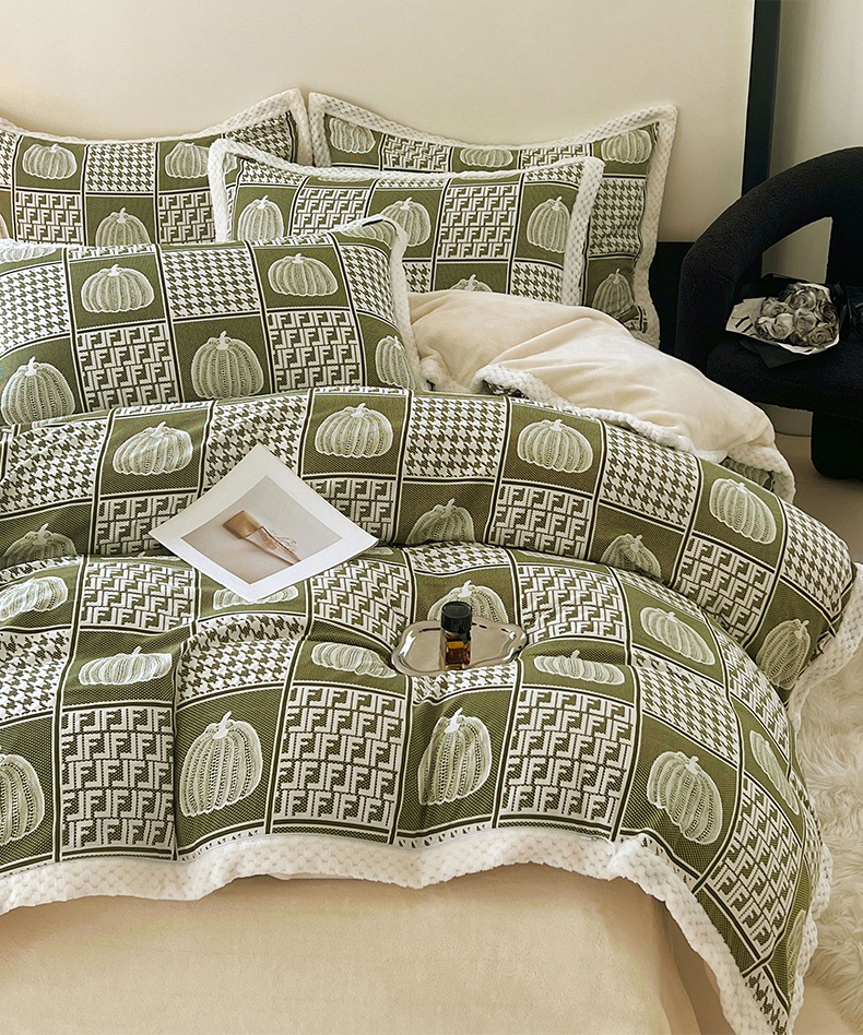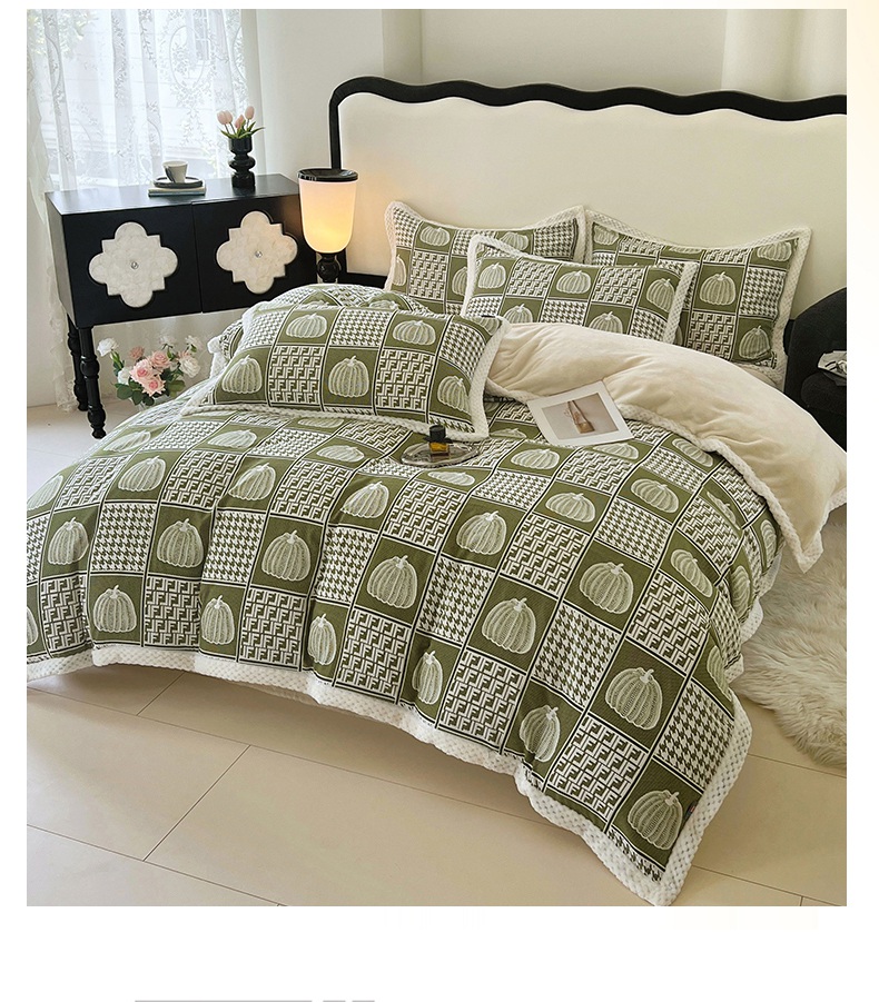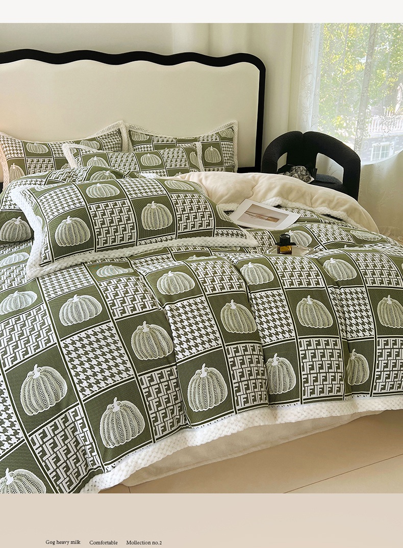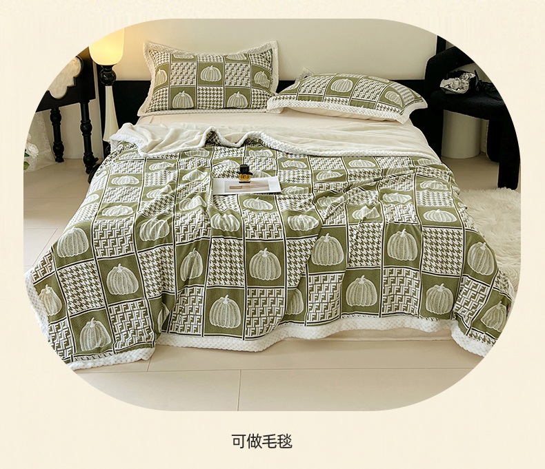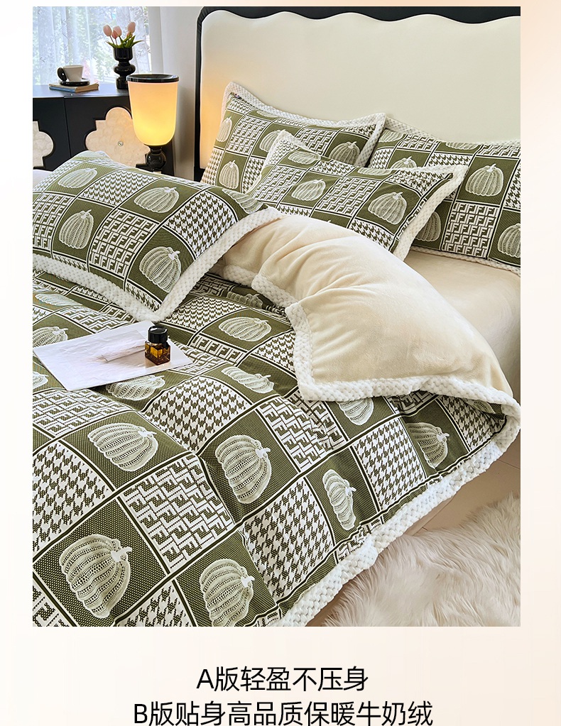 yyds网供 2025新款棉加绒四件套多功能盖毯被套牛奶绒四件套床单款-南瓜 绿野南瓜