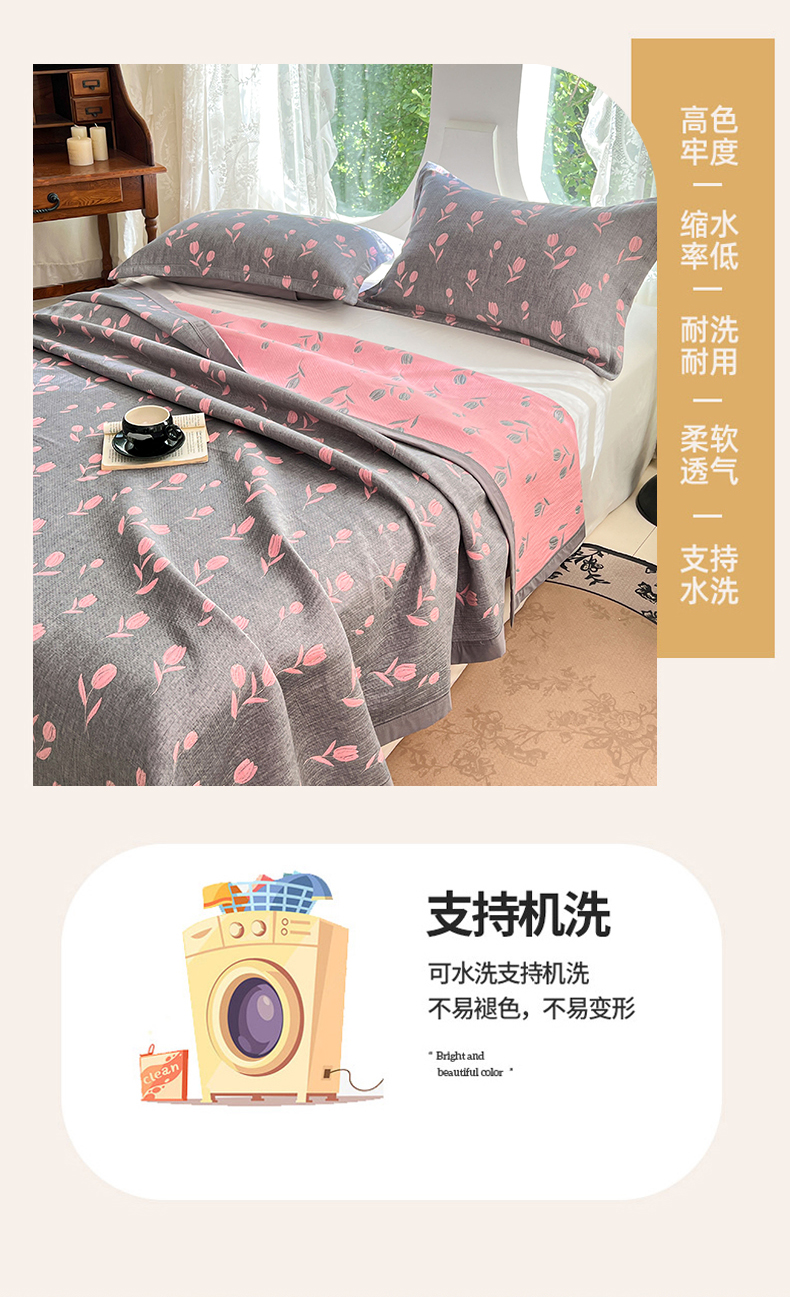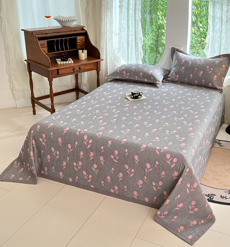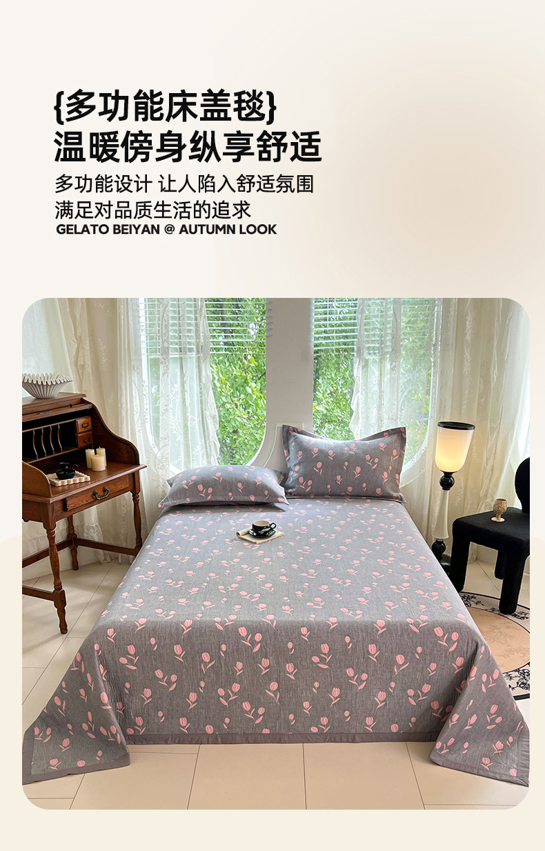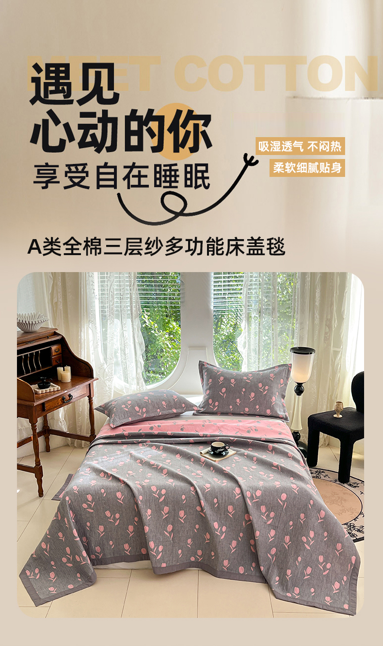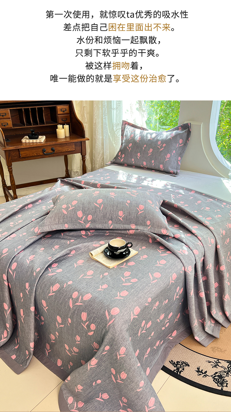 商品名称:yyds网供 2025新款A类色织全棉三层纱布床盖三件套喷气夹棉盖毯夏被厚床单多功能榻榻米风格二 相遇灰粉