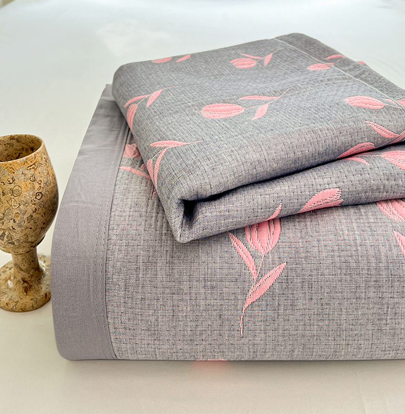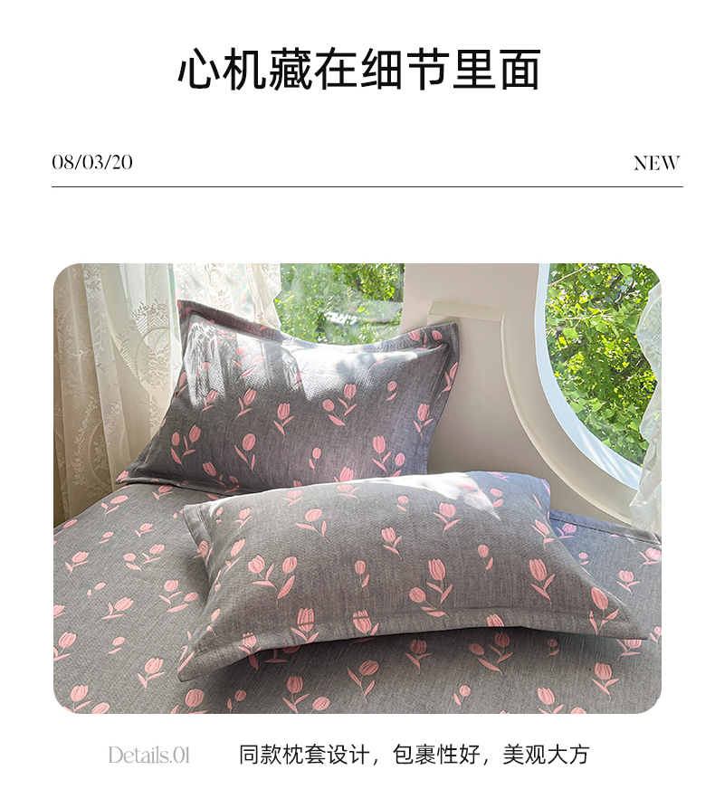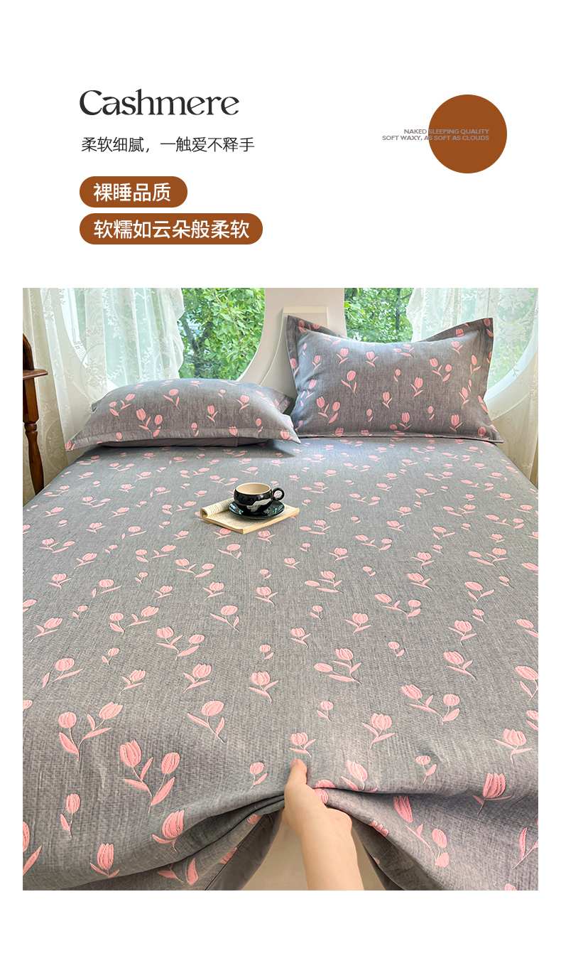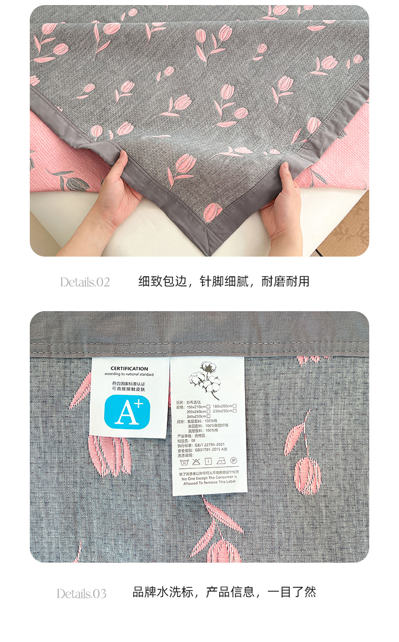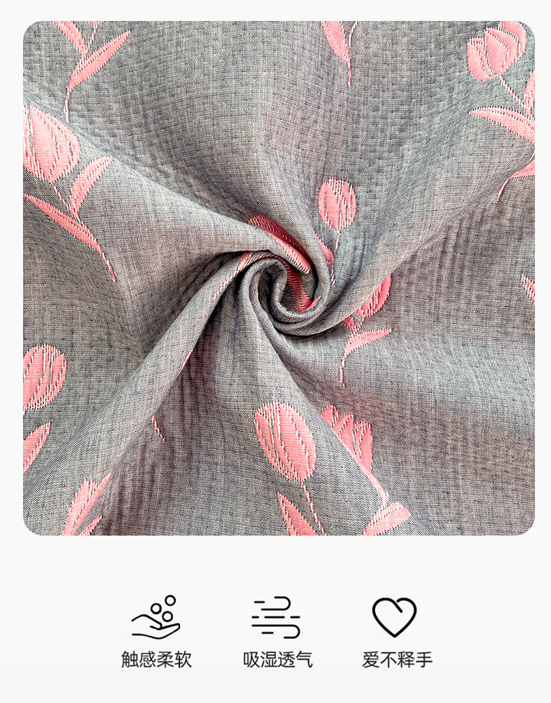 商品名称:yyds网供 2025新款A类色织全棉三层纱布床盖三件套喷气夹棉盖毯夏被厚床单多功能榻榻米风格二 相遇灰粉