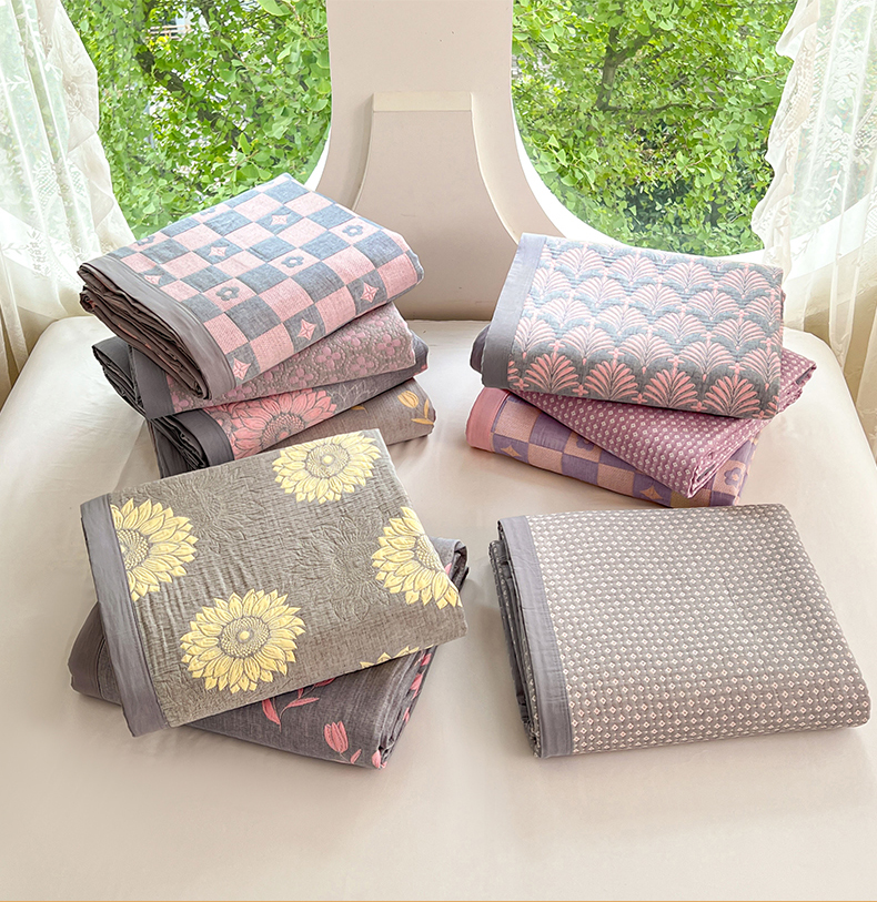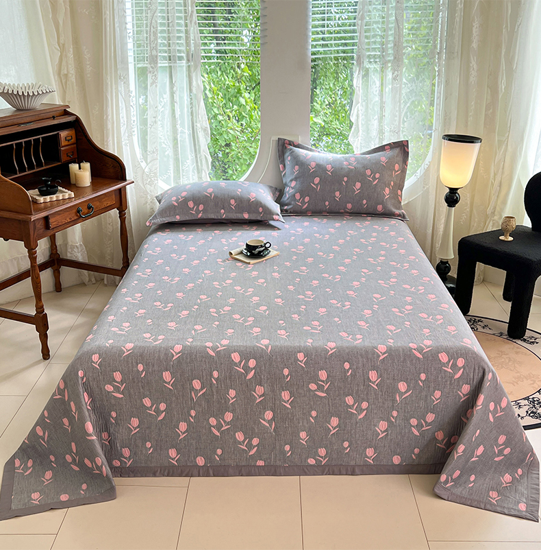 yyds网供 2025新款A类色织全棉三层纱布床盖三件套喷气夹棉盖毯夏被厚床单多功能榻榻米风格二 相遇灰粉