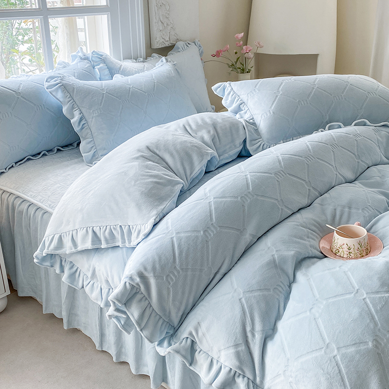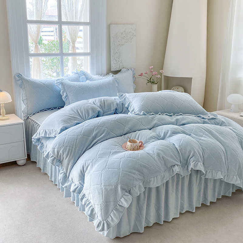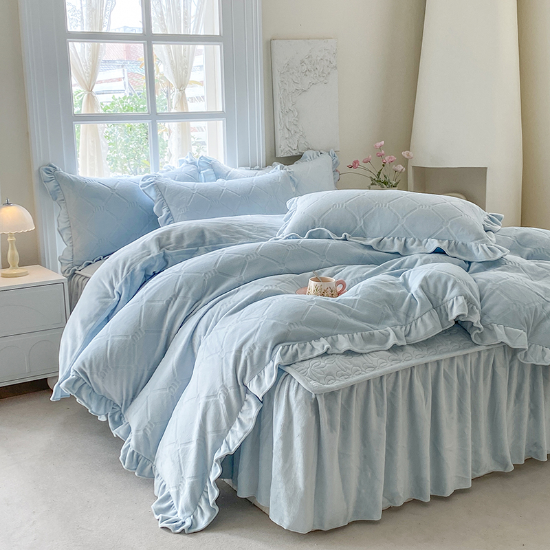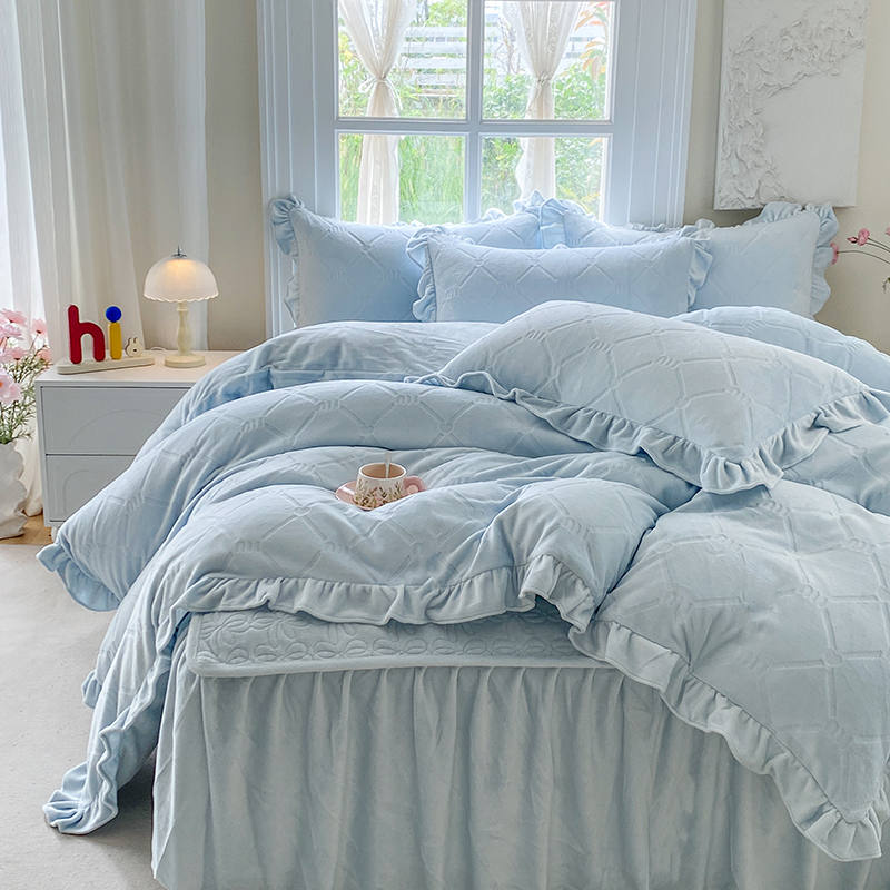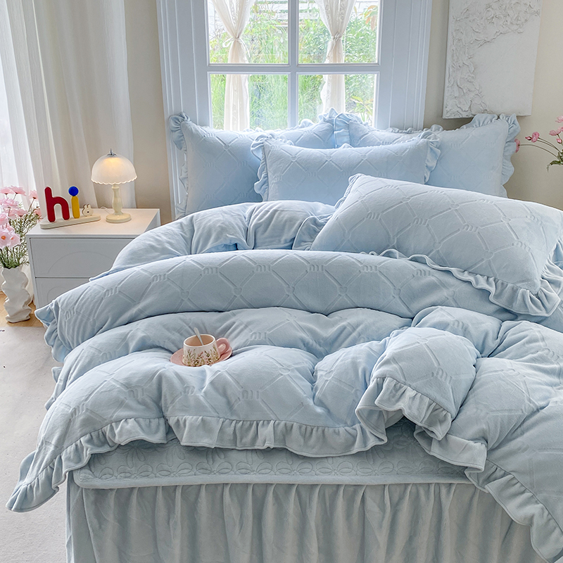 乐嘉盈 2025新款雕花牛奶绒床裙款四件套-字母菲菲 字母菲菲-蓝色