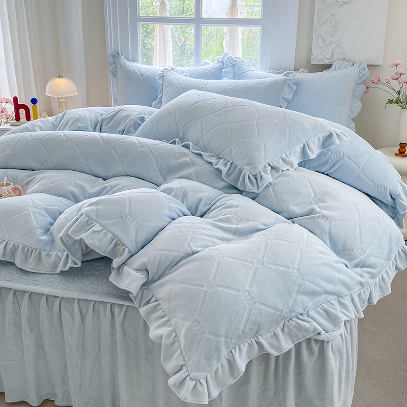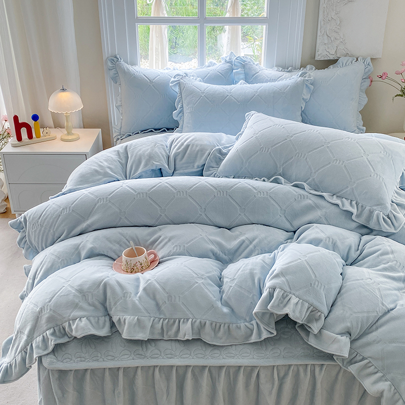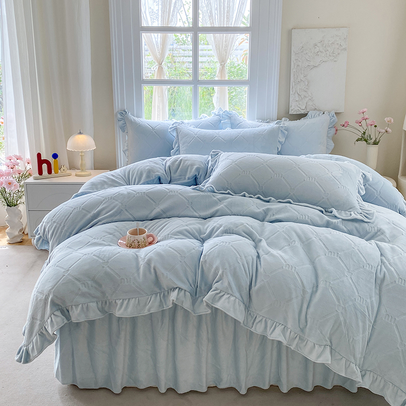 商品名称:乐嘉盈 2025新款雕花牛奶绒床裙款四件套-字母菲菲 字母菲菲-蓝色