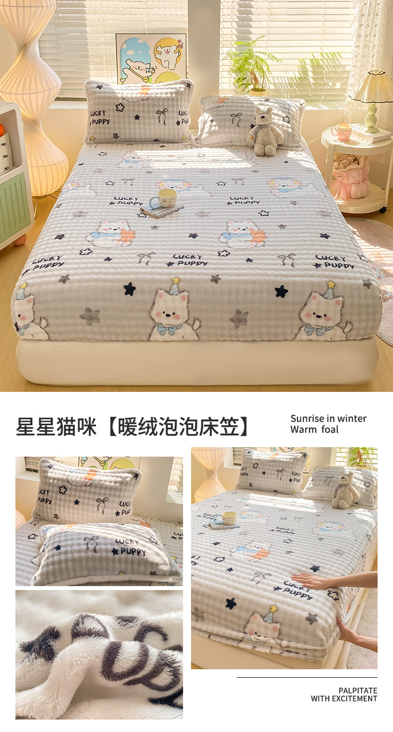 • 91家纺网 家纺一手货源 找家纺 眠势力 2025新款暖绒泡泡床笠单件冬季保暖床罩牛奶绒床垫保护套 星星猫咪【暖绒泡泡床笠】