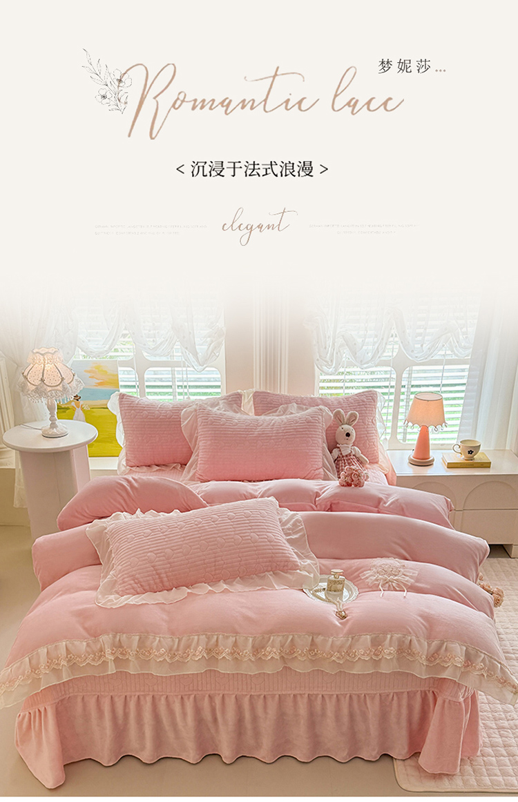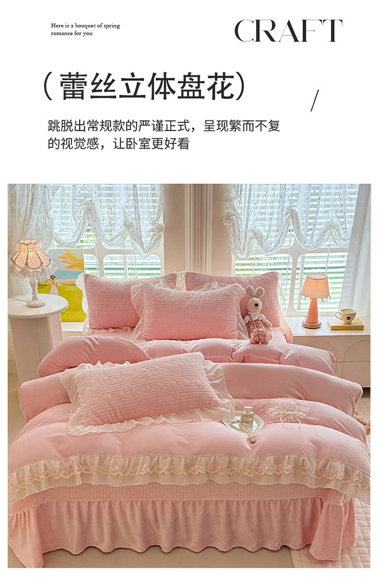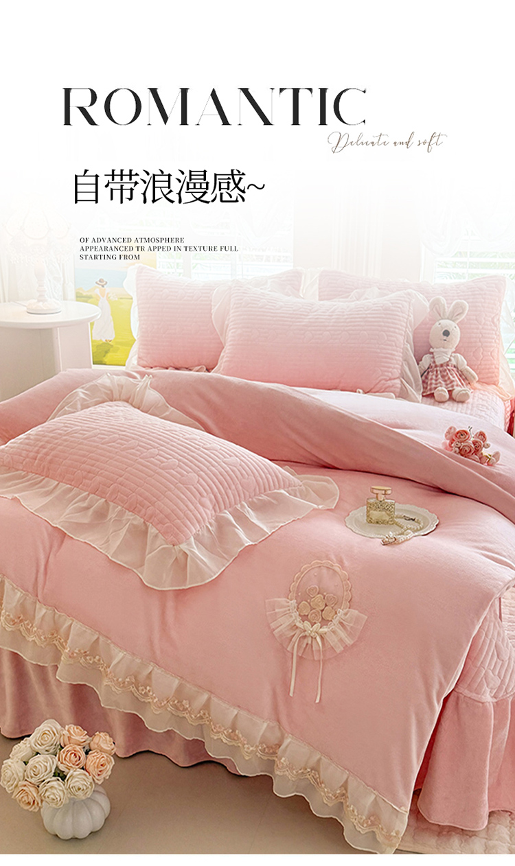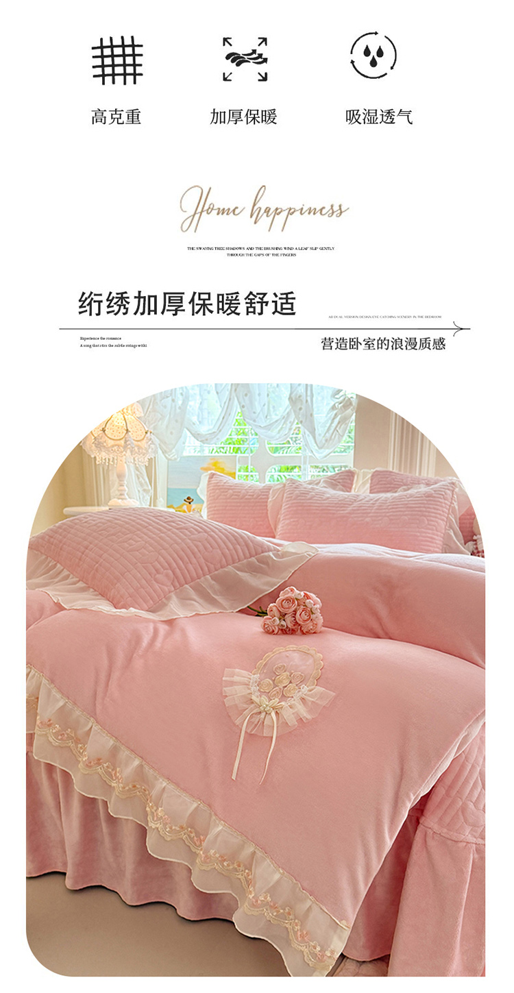 商品名称:(总)苏米娜2025秋冬新款11斤230g全消光牛奶绒夹棉床盖款四件套纯色蕾丝花边刺绣床裙款床盖--米兰系列