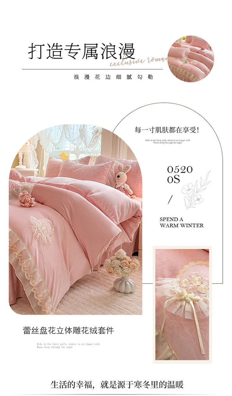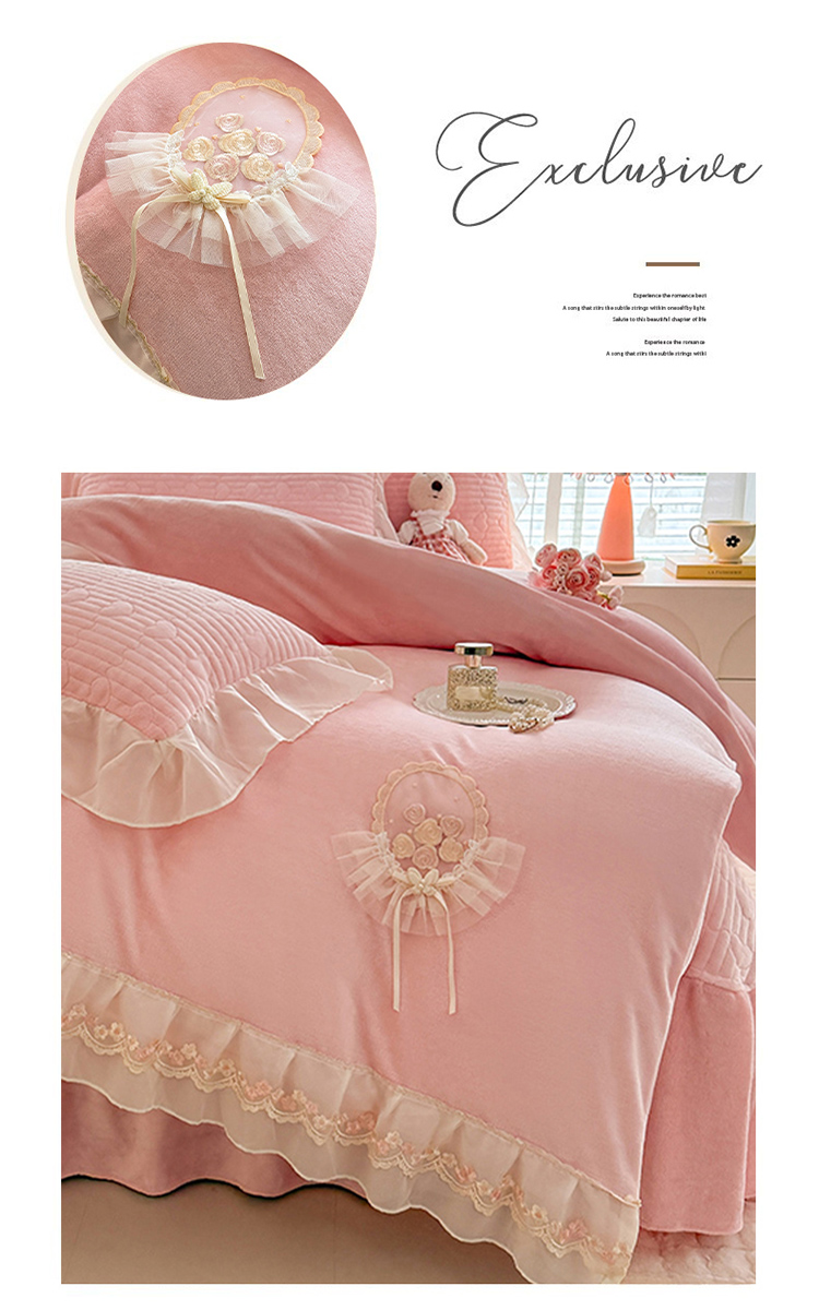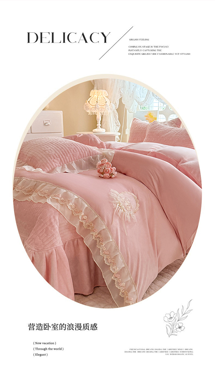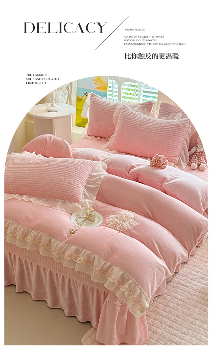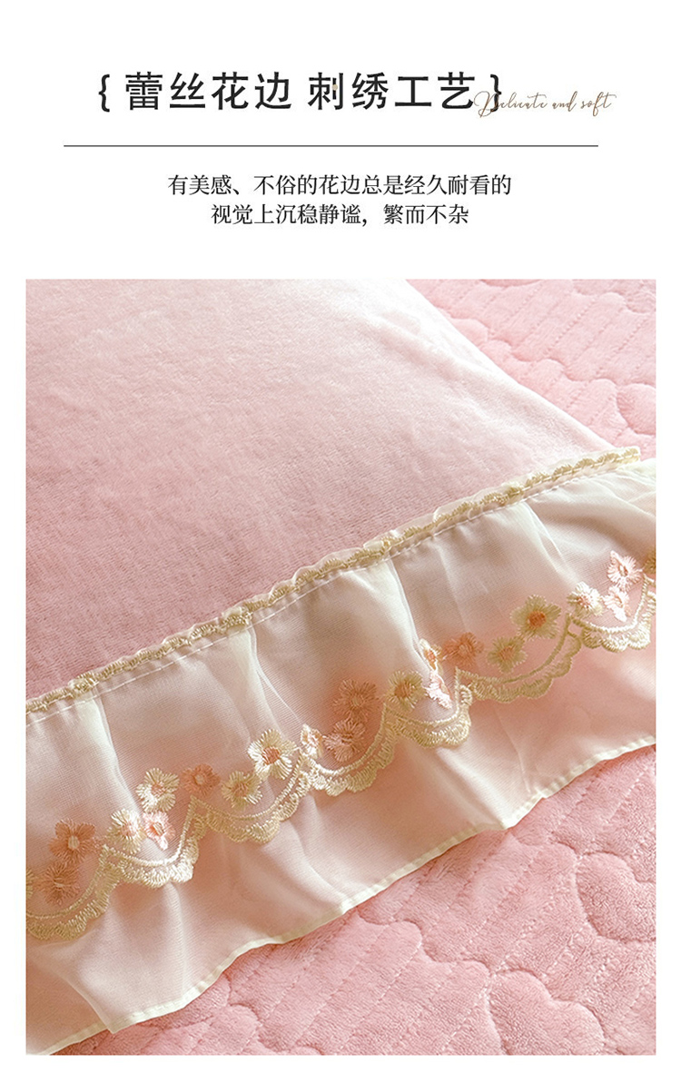 商品名称:(总)苏米娜2025秋冬新款11斤230g全消光牛奶绒夹棉床盖款四件套纯色蕾丝花边刺绣床裙款床盖--米兰系列