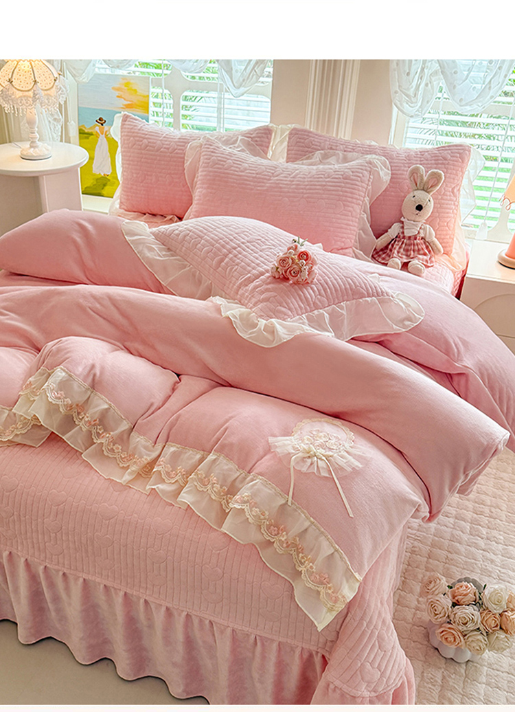(总)苏米娜2025秋冬新款11斤230g全消光牛奶绒夹棉床盖款四件套纯色蕾丝花边刺绣床裙款床盖--米兰系列