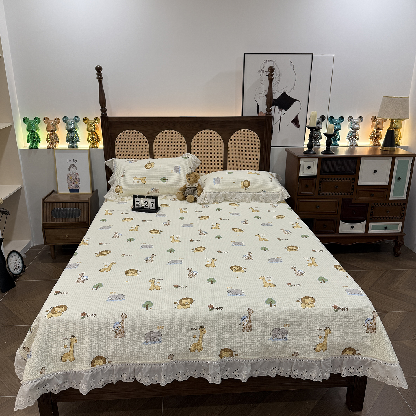 欣宜家纺 2026新款法式双面全棉填充棉花加厚花边床盖三件套 哆米兔