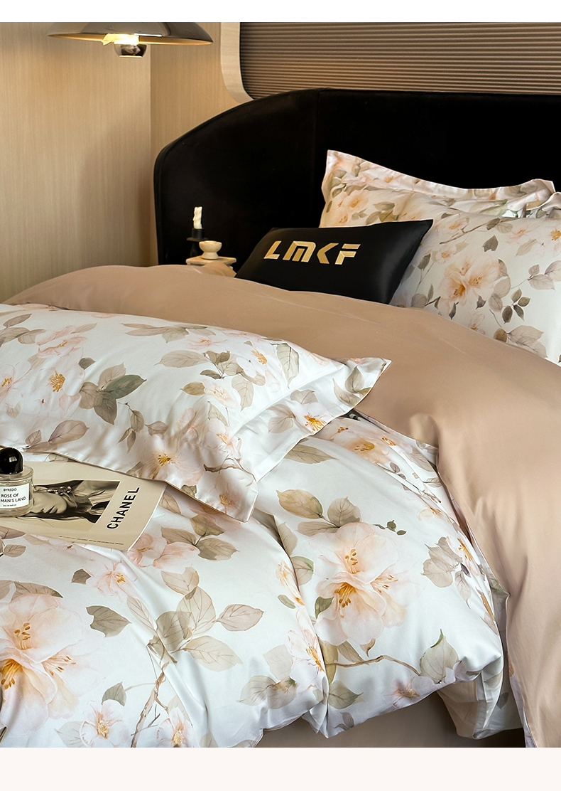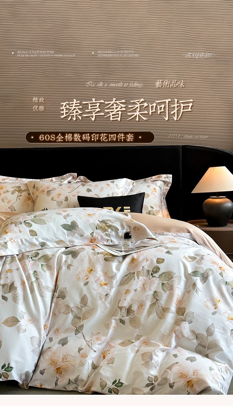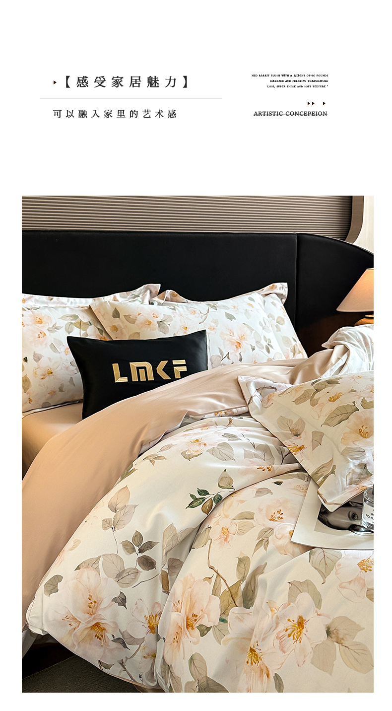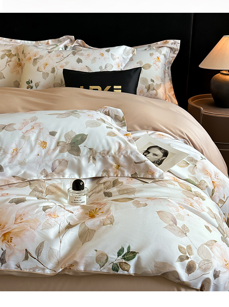 商品名称:蓝米卡夫 2026春季新款-60S长绒棉数码印花贡缎系列四件套(礼盒) 芳香情思-咖