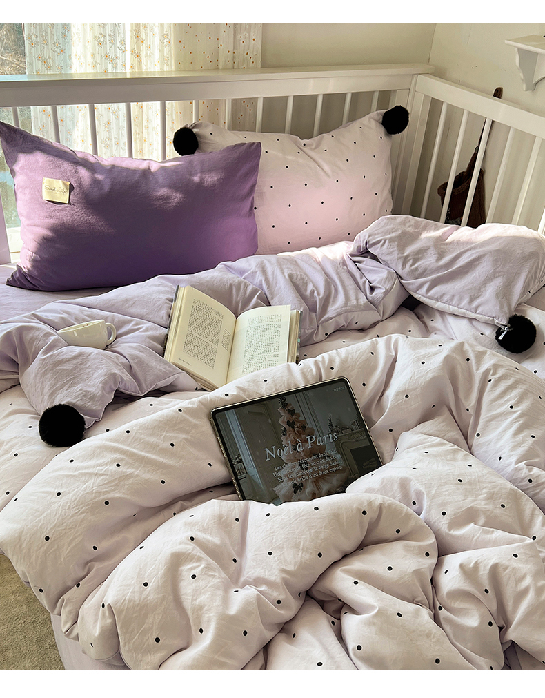轻奢坊 2026新款水洗棉波点可拆卸毛球四件套 紫波点-枕套混搭