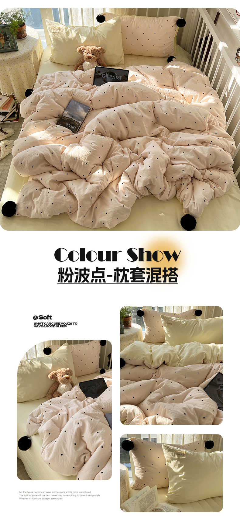 (总)轻奢坊 2026新款水洗棉波点可拆卸毛球四件套,紫波点-枕套混搭,粉波点-枕套波点,粉波点-枕套混搭,蓝波点-枕套波点,蓝波点-枕套混搭,绿波点-枕套波点,绿波点-枕套混搭,米波点-枕套波点,米波点-枕套混搭,紫波点-枕套波点