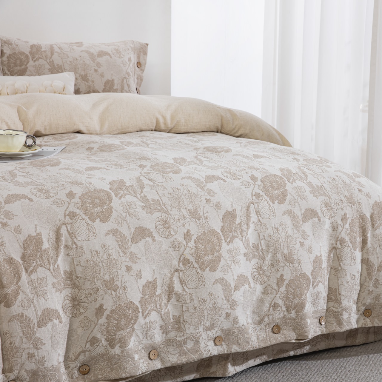 商品名称:(总)仰望棉麻双层纱供应链 2026新款棉麻色织大提花纽扣款四件套-虞美人系列