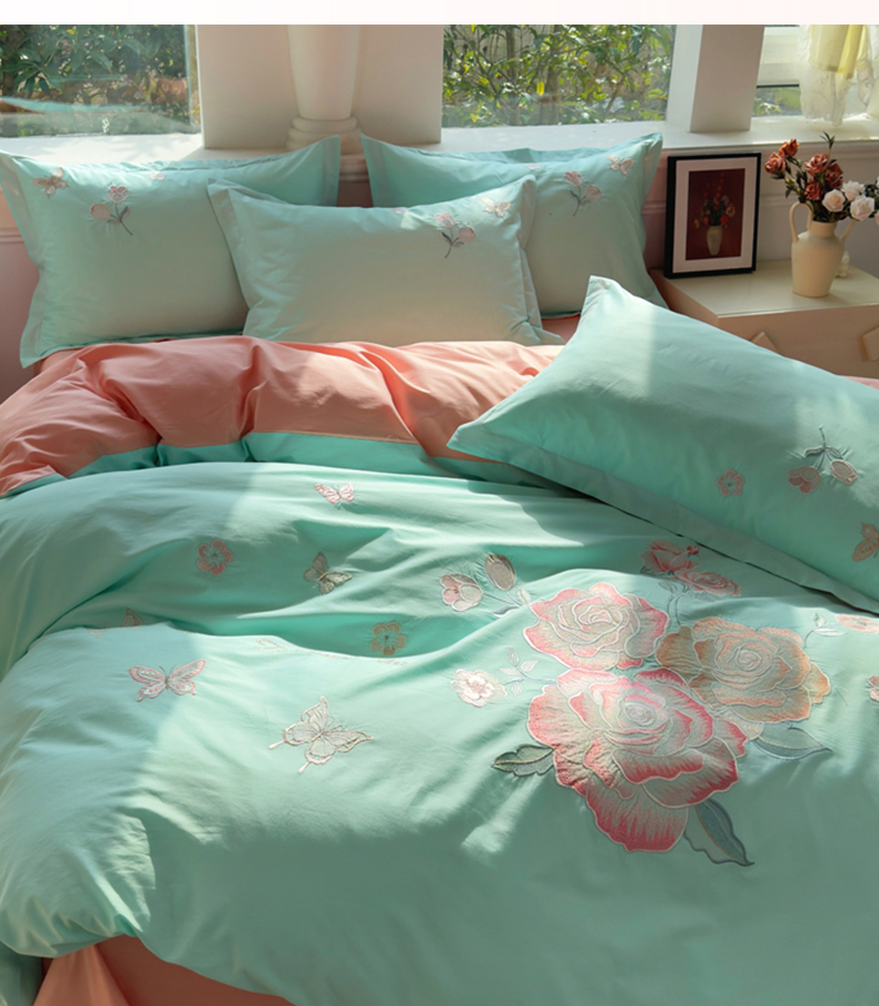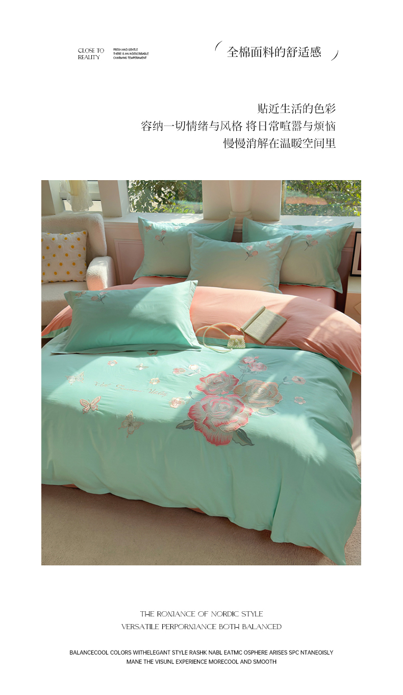 商品名称:铭博家纺 2026新款13372新款100%全棉刺绣工艺款四件套-蝶舞玫瑰系列 蝶舞玫瑰-碧玉