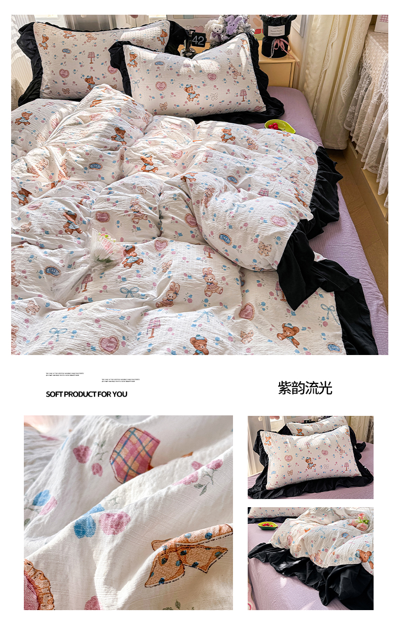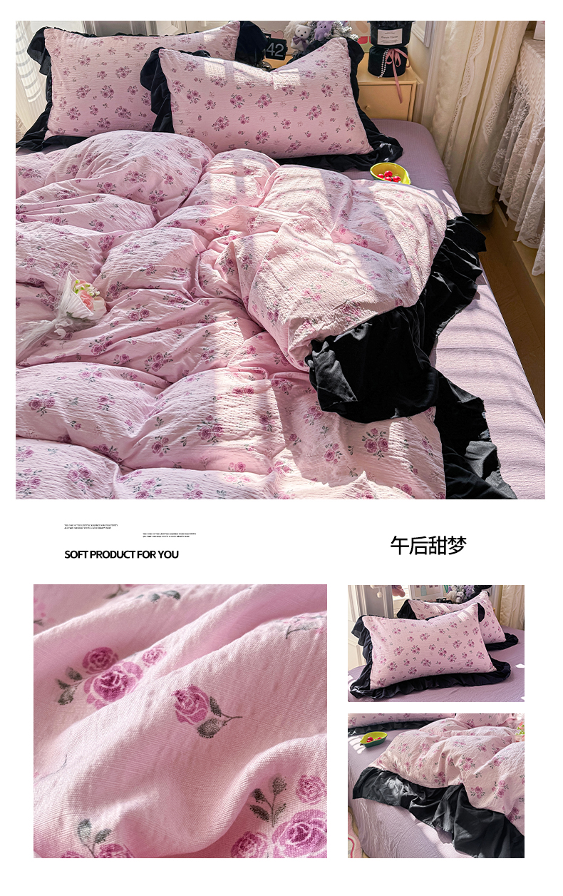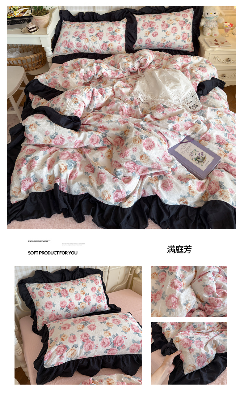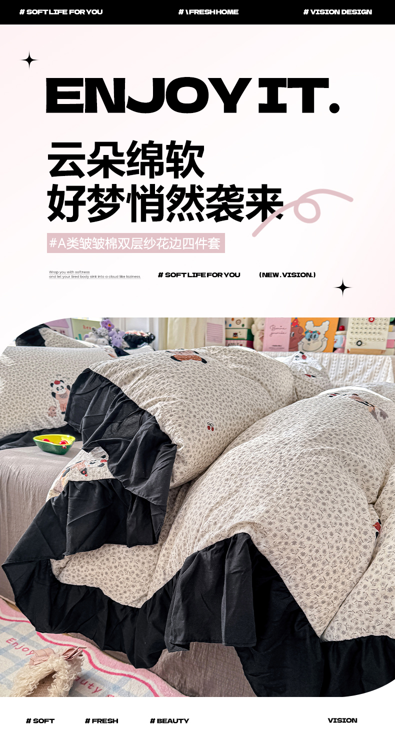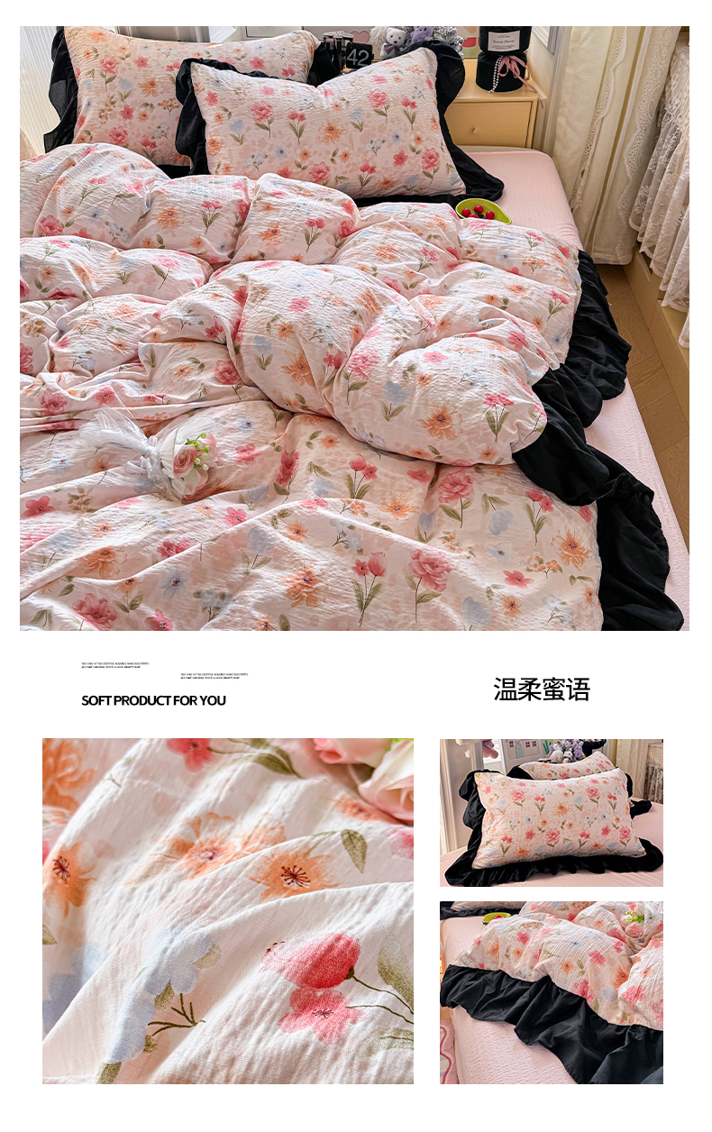 商品名称:(总)优卡迪家纺馆 2026新款皱皱棉双层纱黑花边四件套下载文件包含买家秀