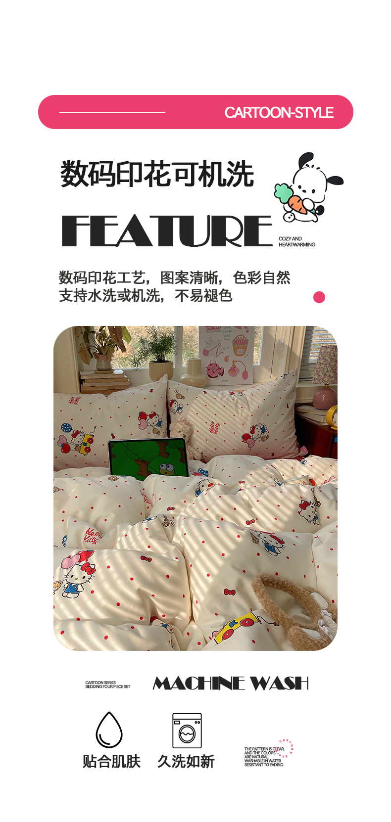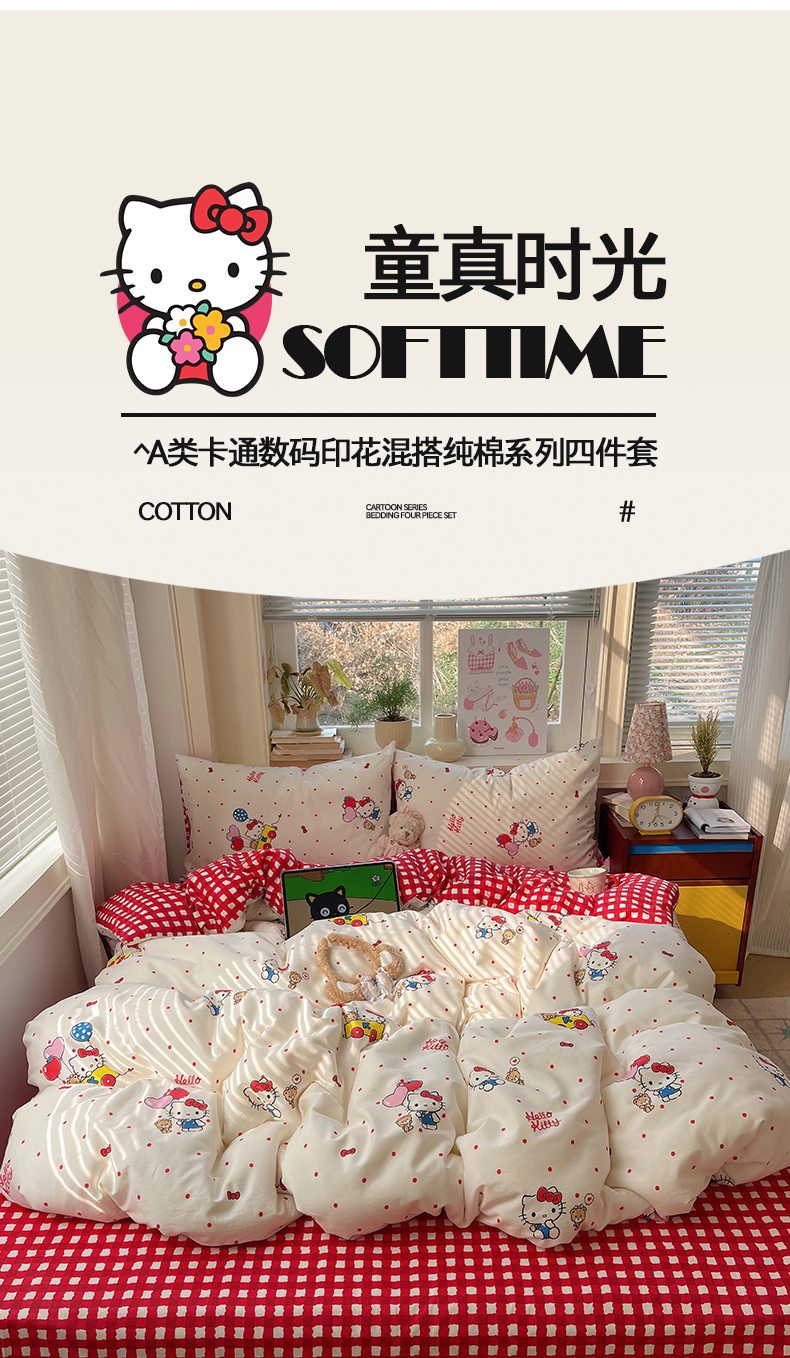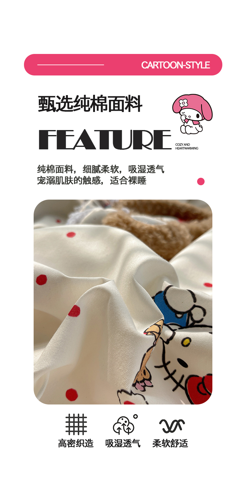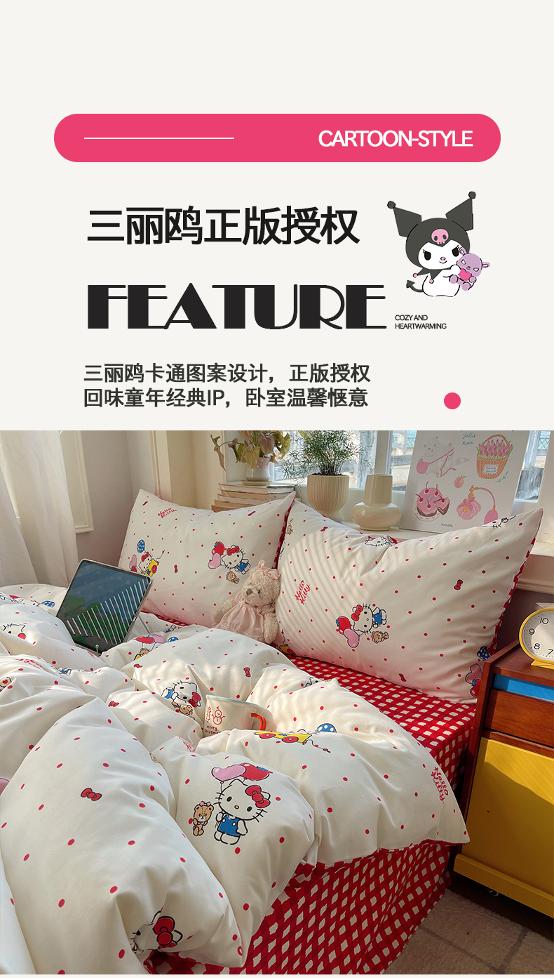 当前位置: 91家纺网 > 商品网购 > 床品套件 > 四件套 > 全棉普通四件套 > 桃子家居 2026新款A类三丽鸥正版授权卡通数码印花混搭纯棉印花系列四件套 棉三丽鸥-甜心波点kt