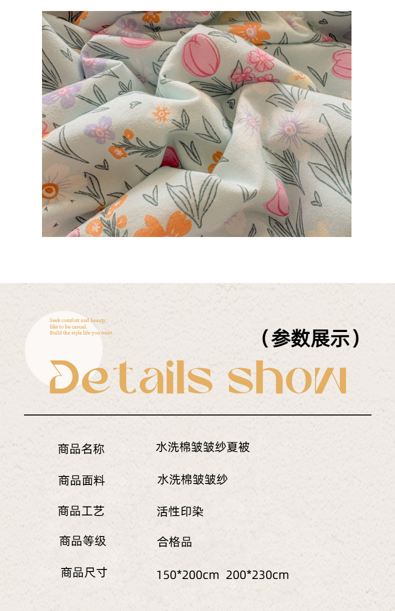 商品名称:宜梦家居 2026新款水洗棉皱皱纱夏被夏凉被空调被 花色娇美