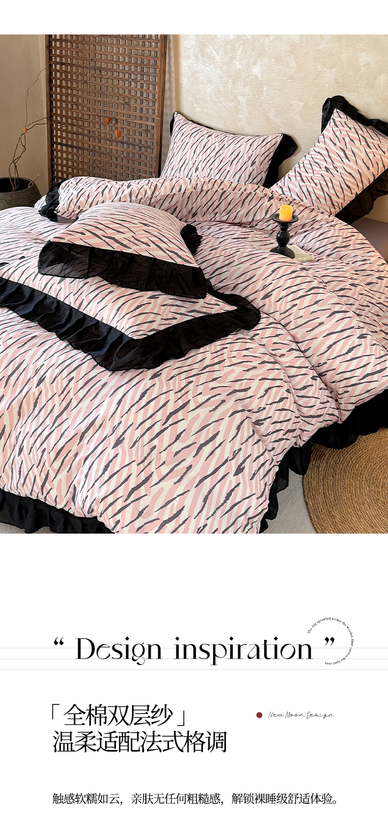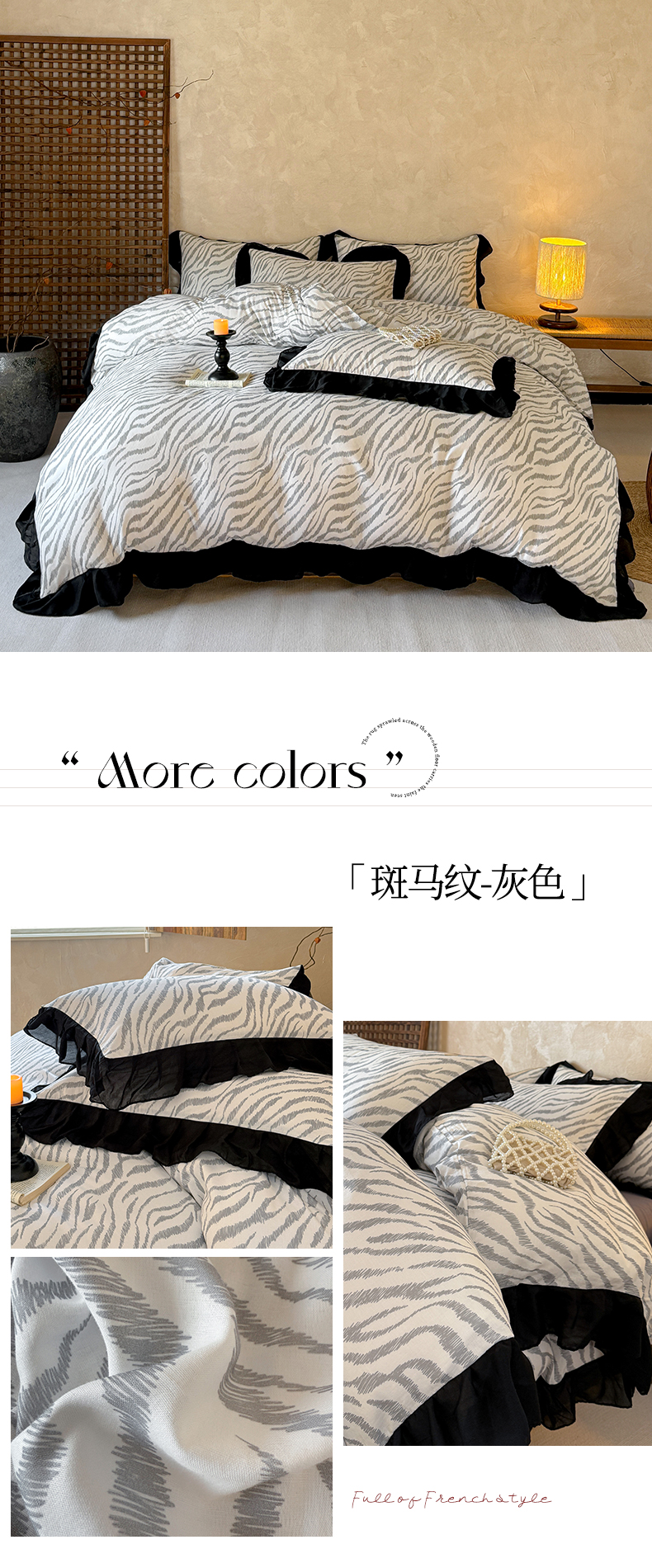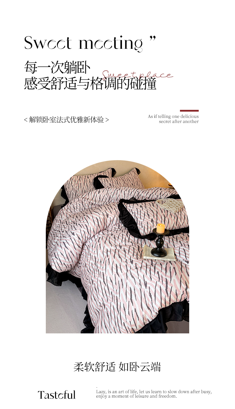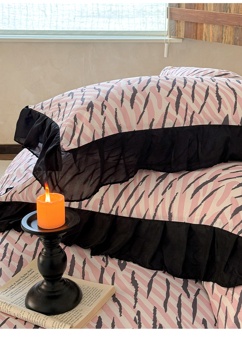 当前位置: 91家纺网 > 商品网购 > 床品套件 > 四件套 > 全棉普通四件套 > (总)宅家居 2026新款A类轻法式复古赫本风印花纯棉有氧双层纱花边斑马纹黑色韩式花边四件套