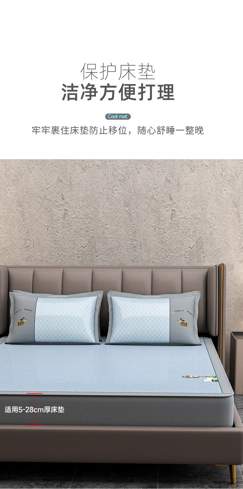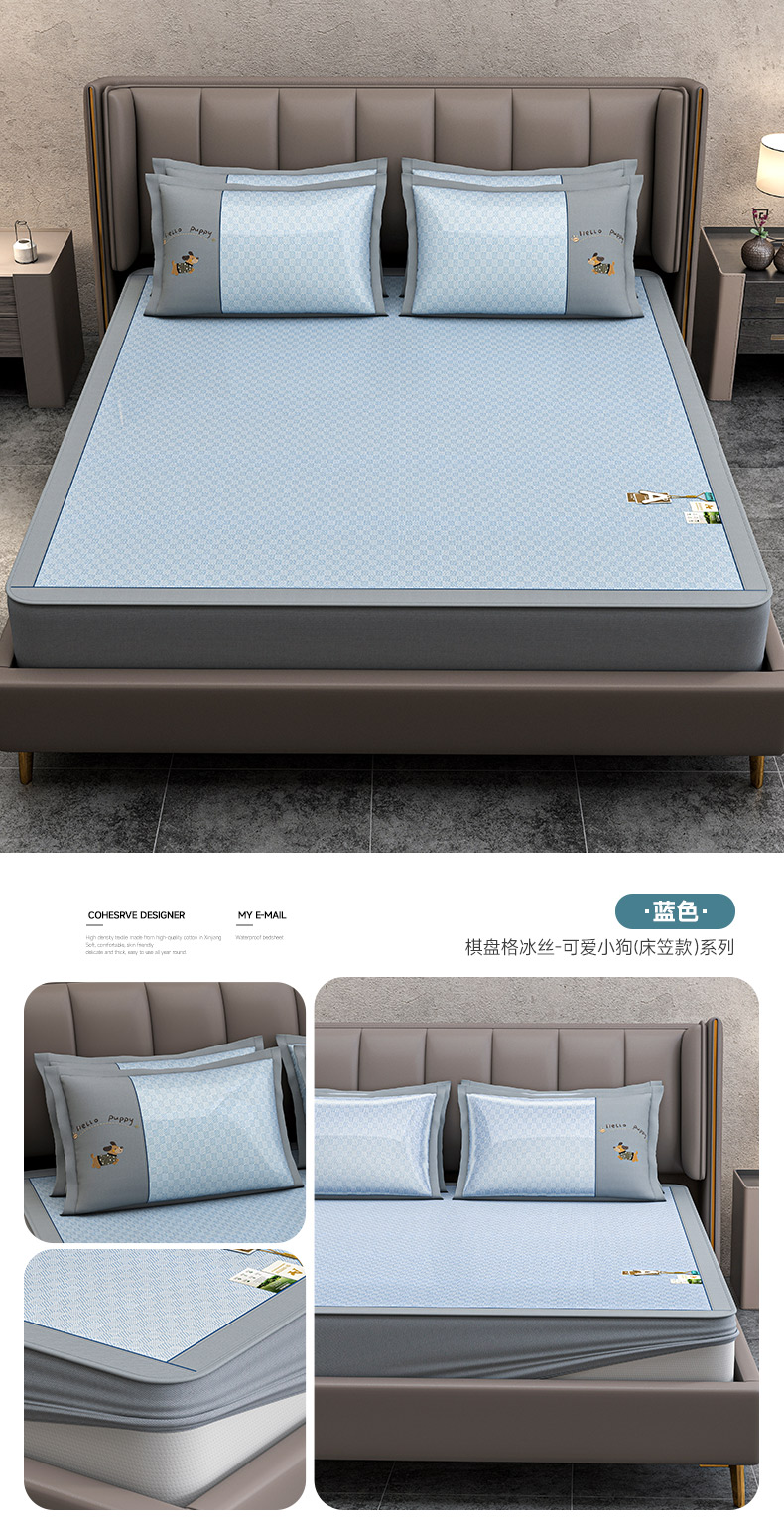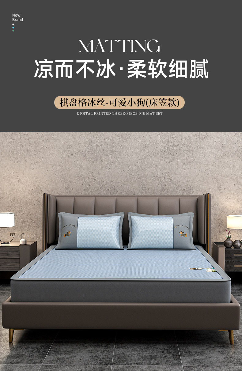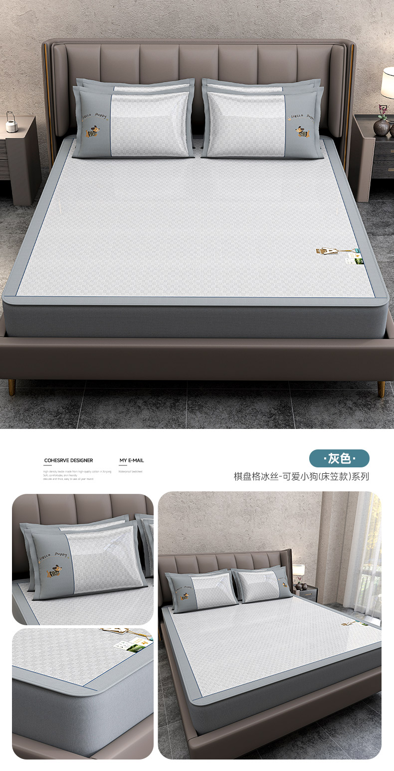 商品名称:小牛席业 2026新款棋盘格冰丝腊肠狗贴布绣冰丝席席子凉席-床笠款 灰色
