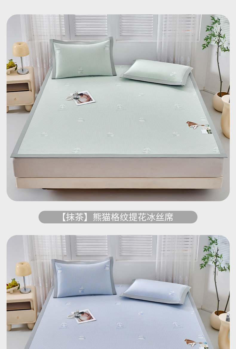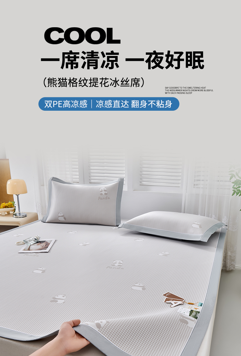 (总)小牛席业 2026新款熊猫格纹提花冰丝席席子凉席-(床笠款)凉席藤席冰藤席冰丝席凉感空调席,粉色,灰色,蓝色,抹茶,香槟