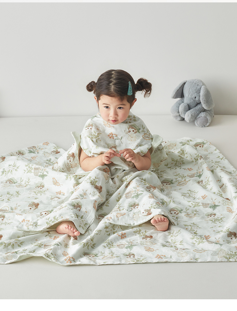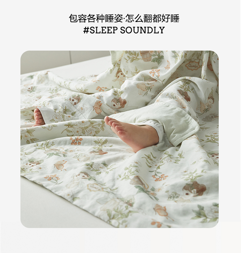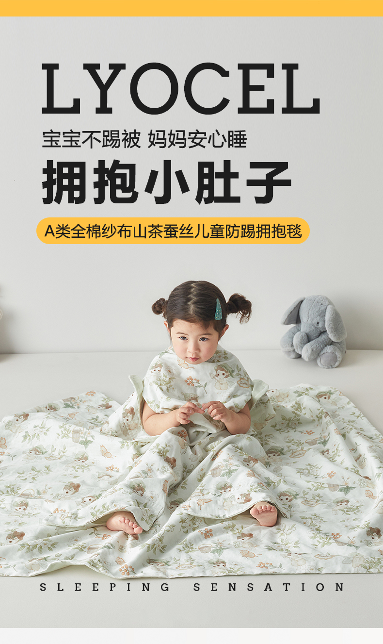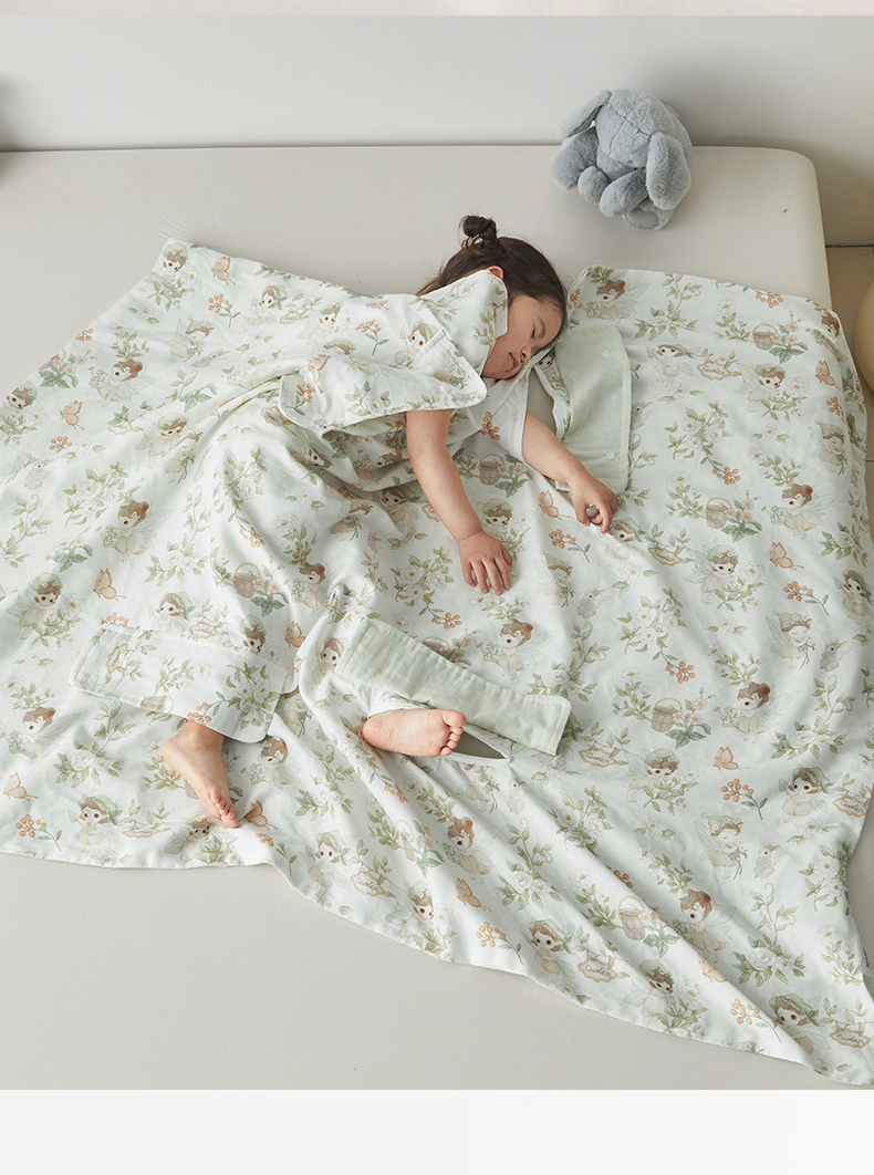 • 91家纺网 家纺一手货源 找家纺 荷马之梦 2026新款全棉纱布印花小版盖毯山茶蚕丝儿童拥抱防踢夏被-拥抱森林 茶园梦境