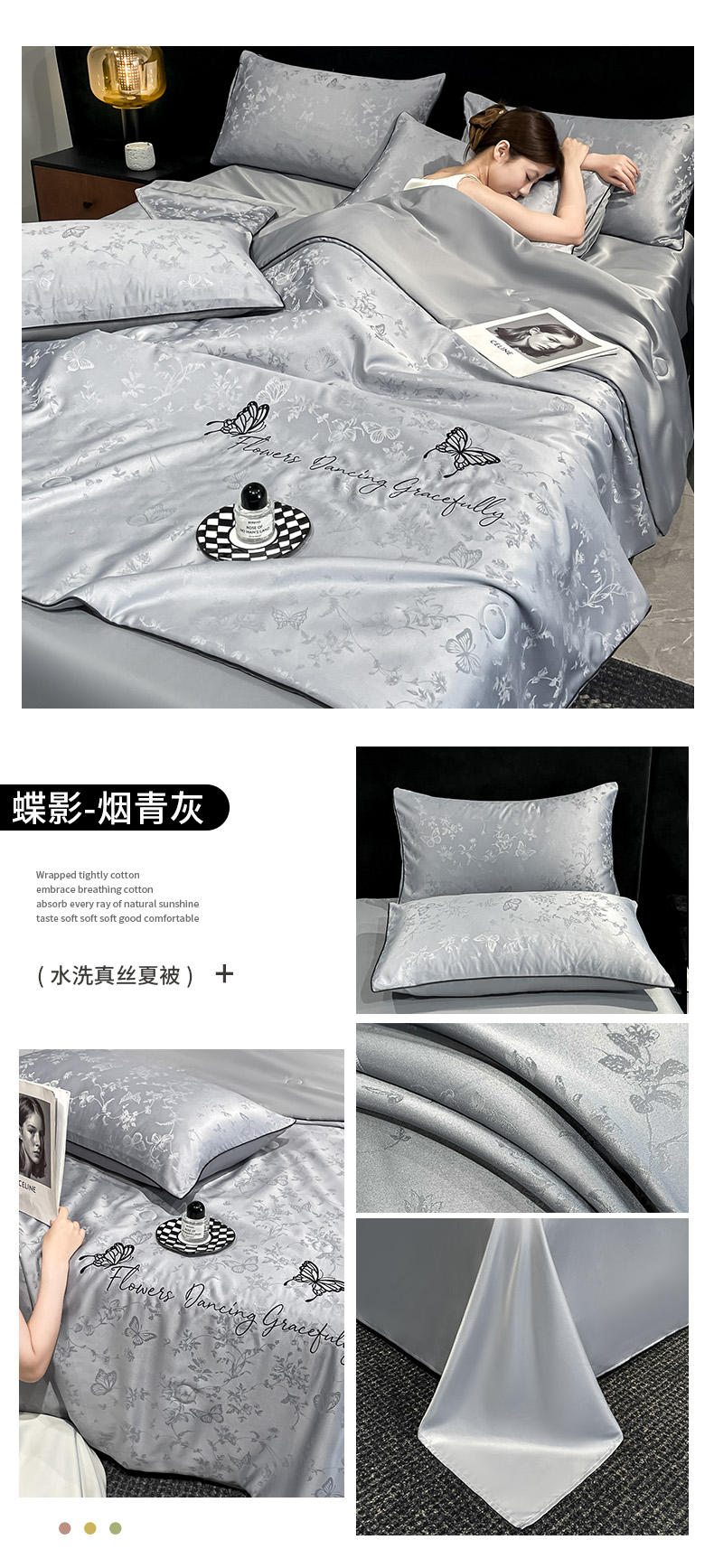 (总)慕澄家纺 2026新款厚织亮丝提花刺绣水洗真丝四件套,蝶恋花-烟青灰,蝶恋花-白+灰,蝶恋花-冰蓝,蝶恋花-蔷薇粉,蝶恋花-霜白,蝶恋花-香槟金