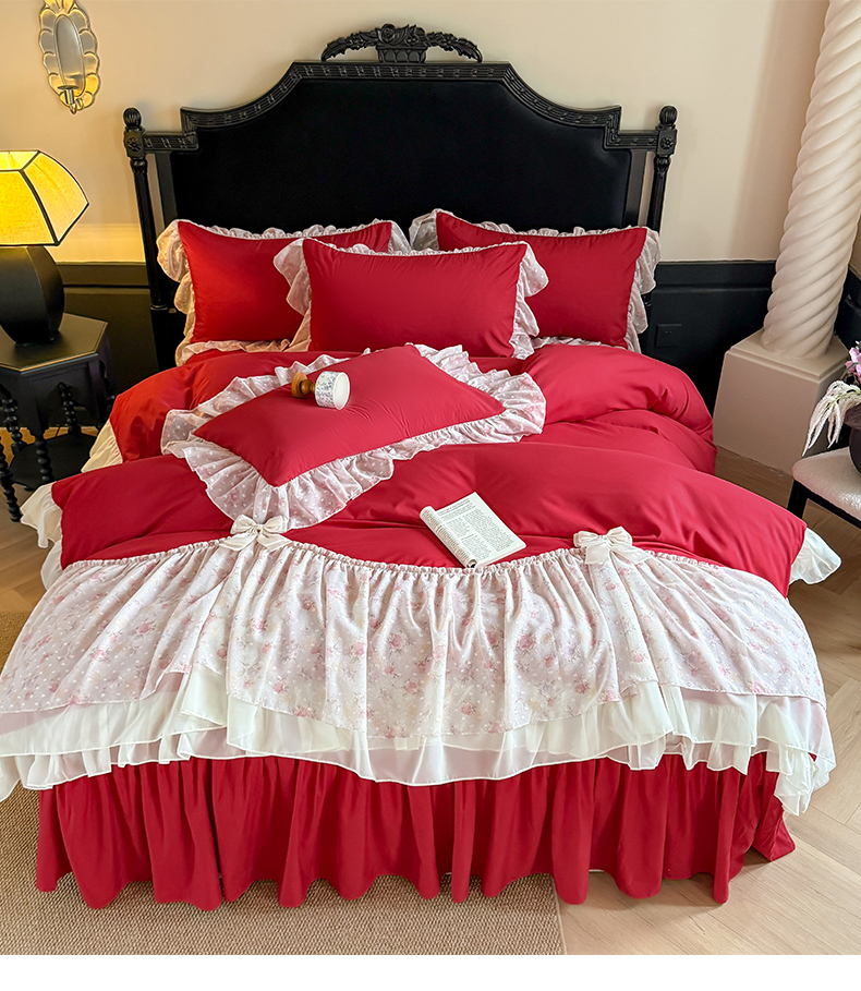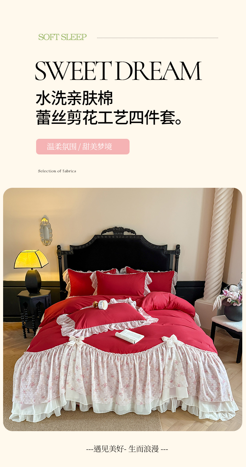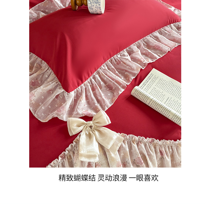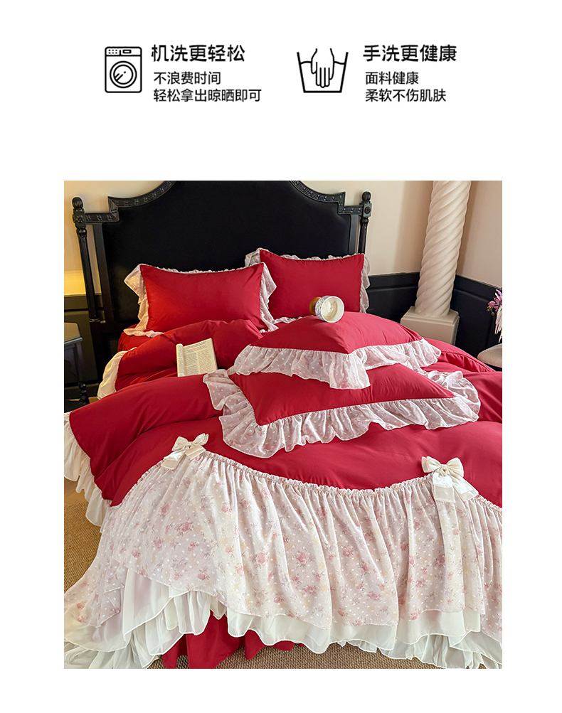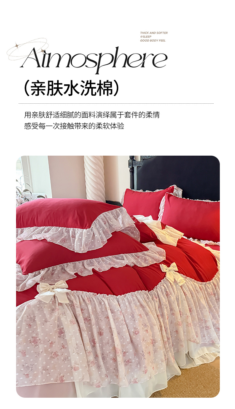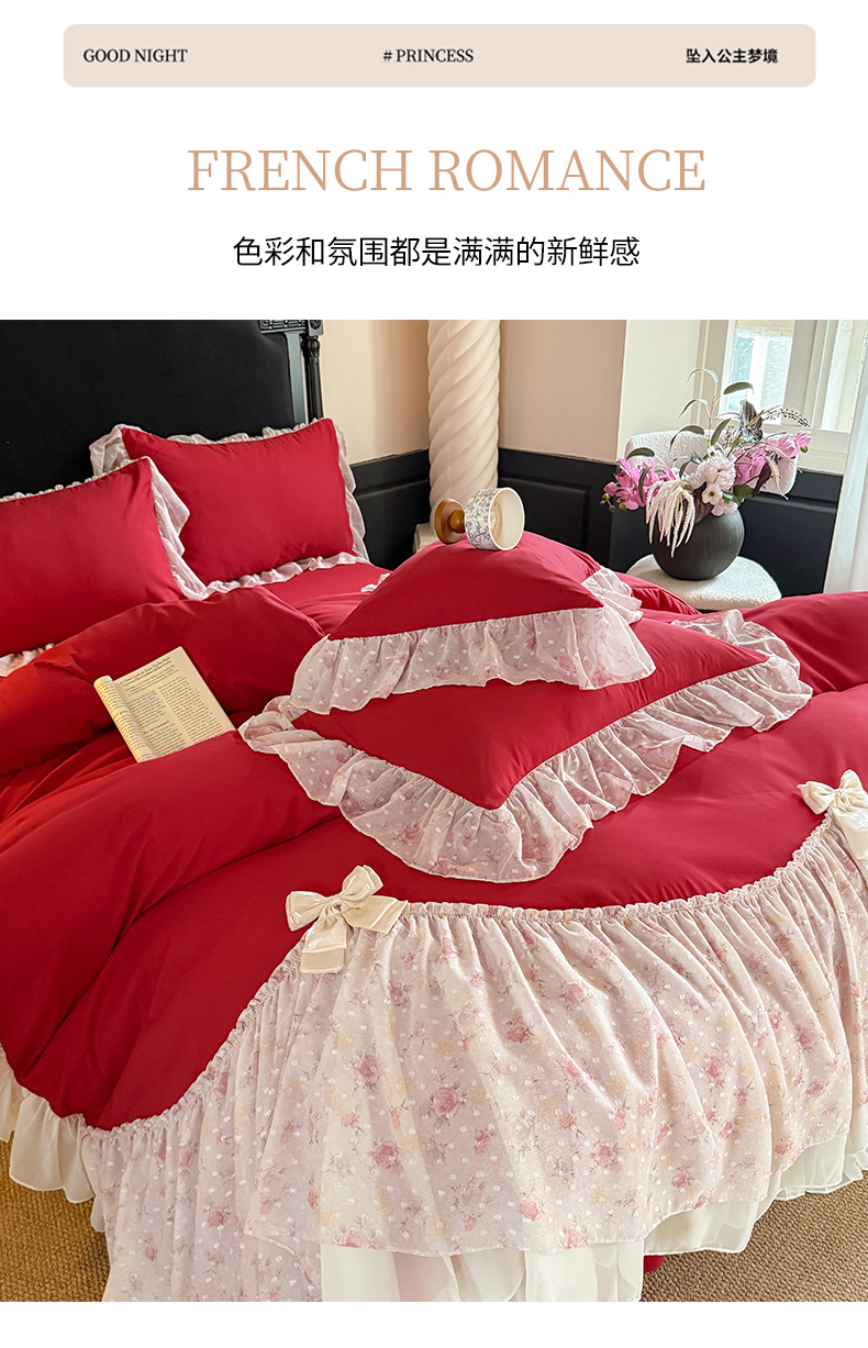 当前位置: 91家纺网 > 商品网购 > 床品套件 > 四件套 > 其它四件套 > 富盛家纺 2026新款水洗亲肤棉雪纺蕾丝刺绣法式床裙韩版四件套 浪漫主义-大红