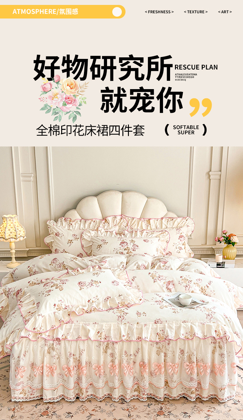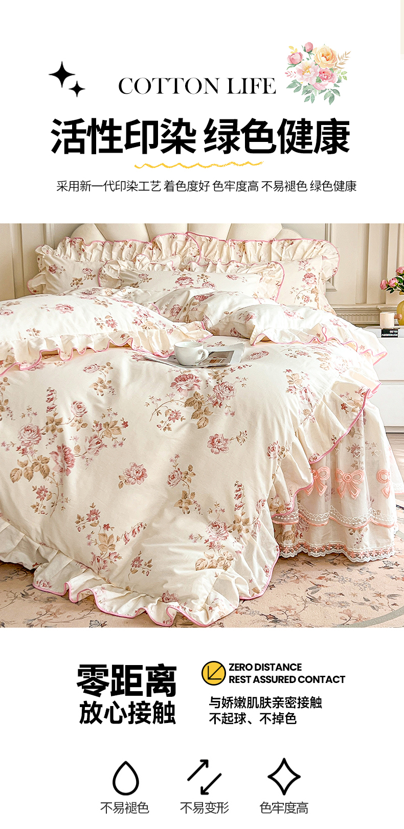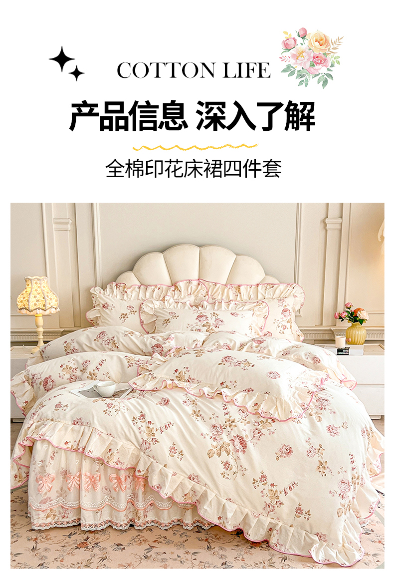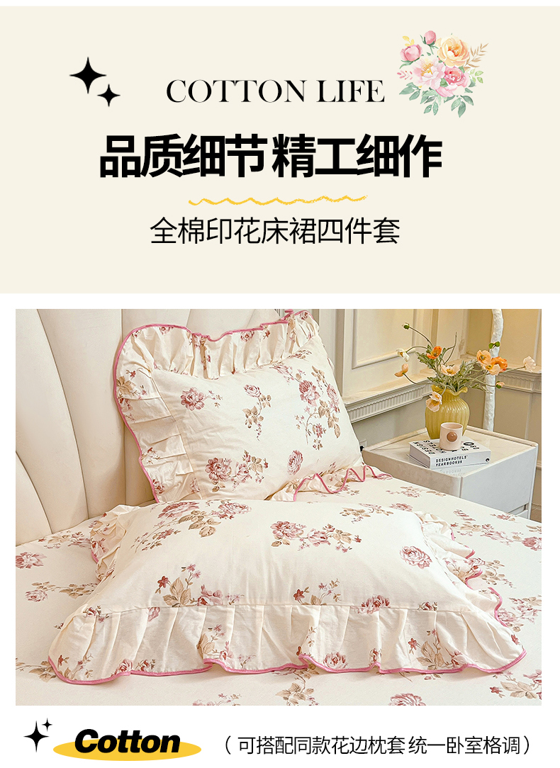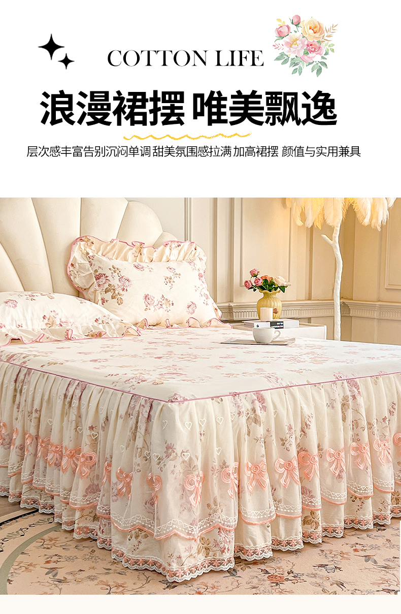 当前位置: 91家纺网 > 商品网购 > 床品套件 > 四件套 > 全棉普通四件套 > 宜凡家纺 2026新款全棉公主风单层床裙四件套 水苏栀清