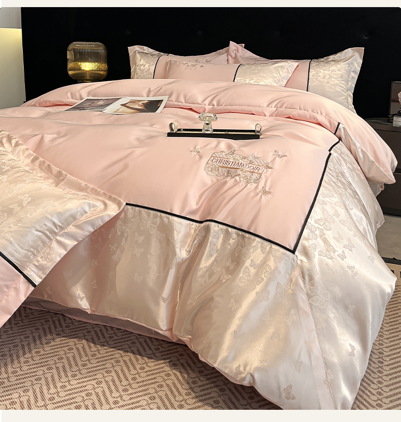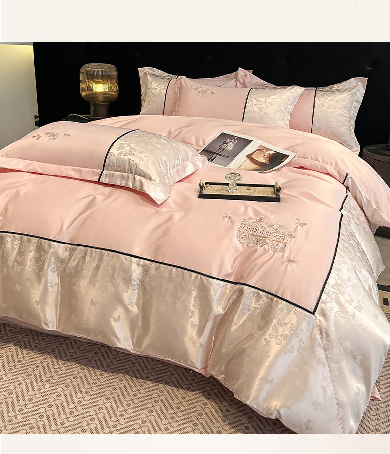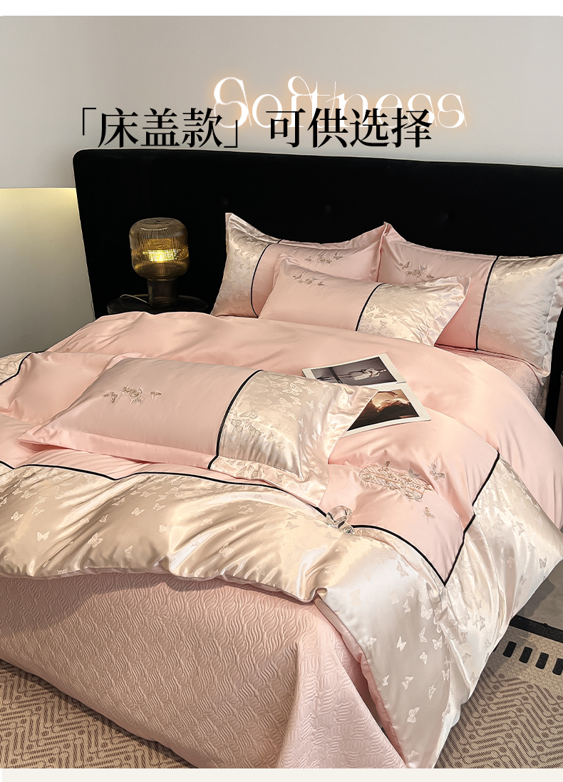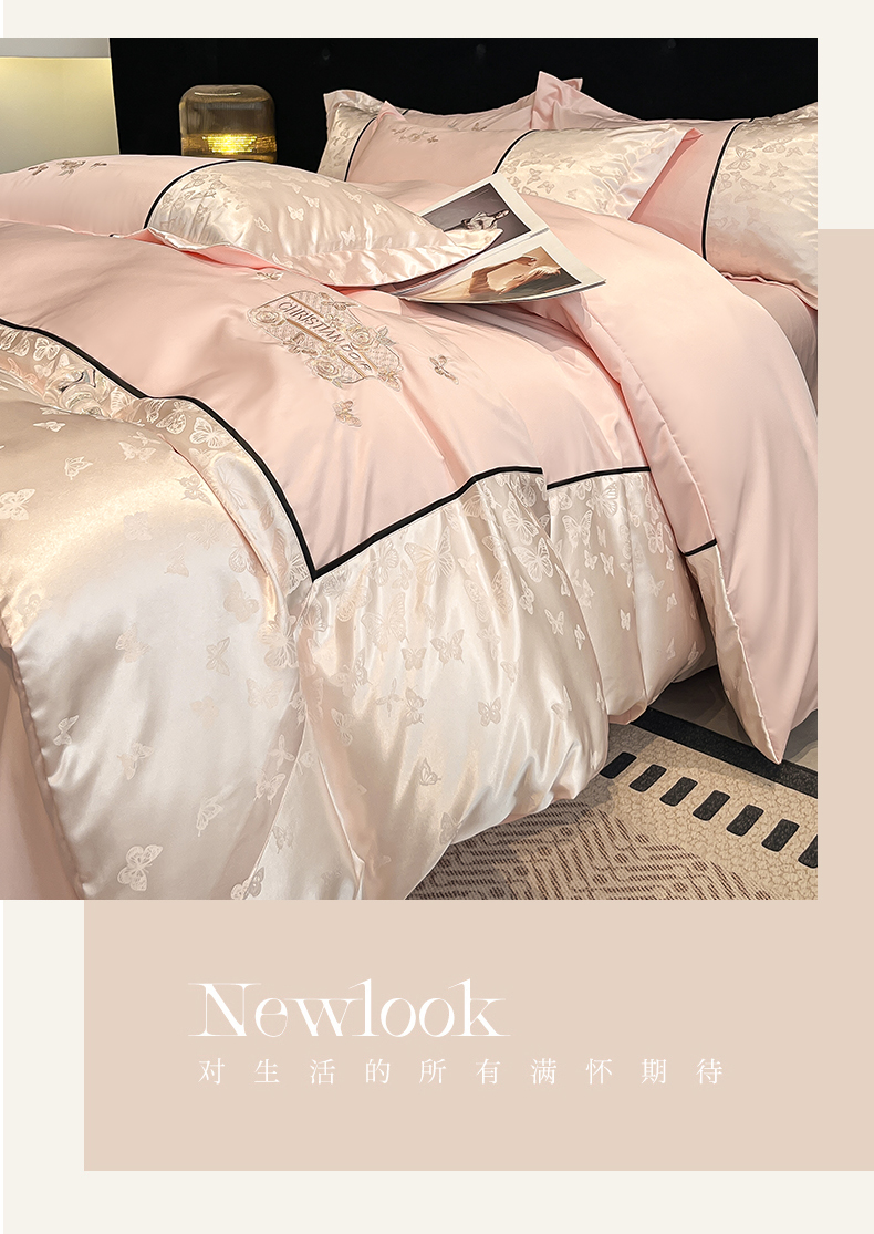 当前位置: 91家纺网 > 商品网购 > 床品套件 > 四件套 > 其它四件套 > 金牛座家纺 2026新款金牛座细斜纹贡缎亮丝提花大拼角刺绣床盖四件套-缇娜系列 缇娜-浅粉