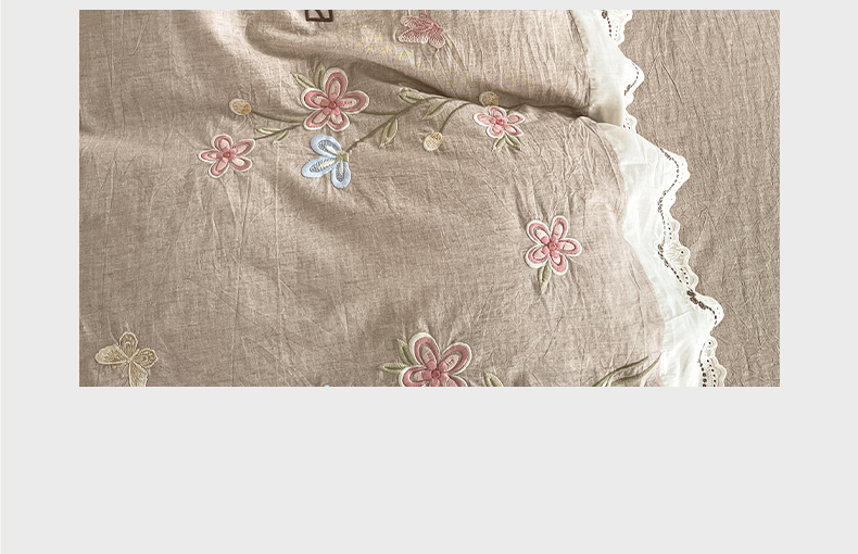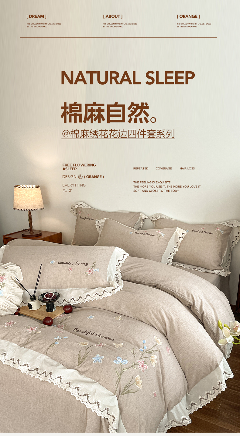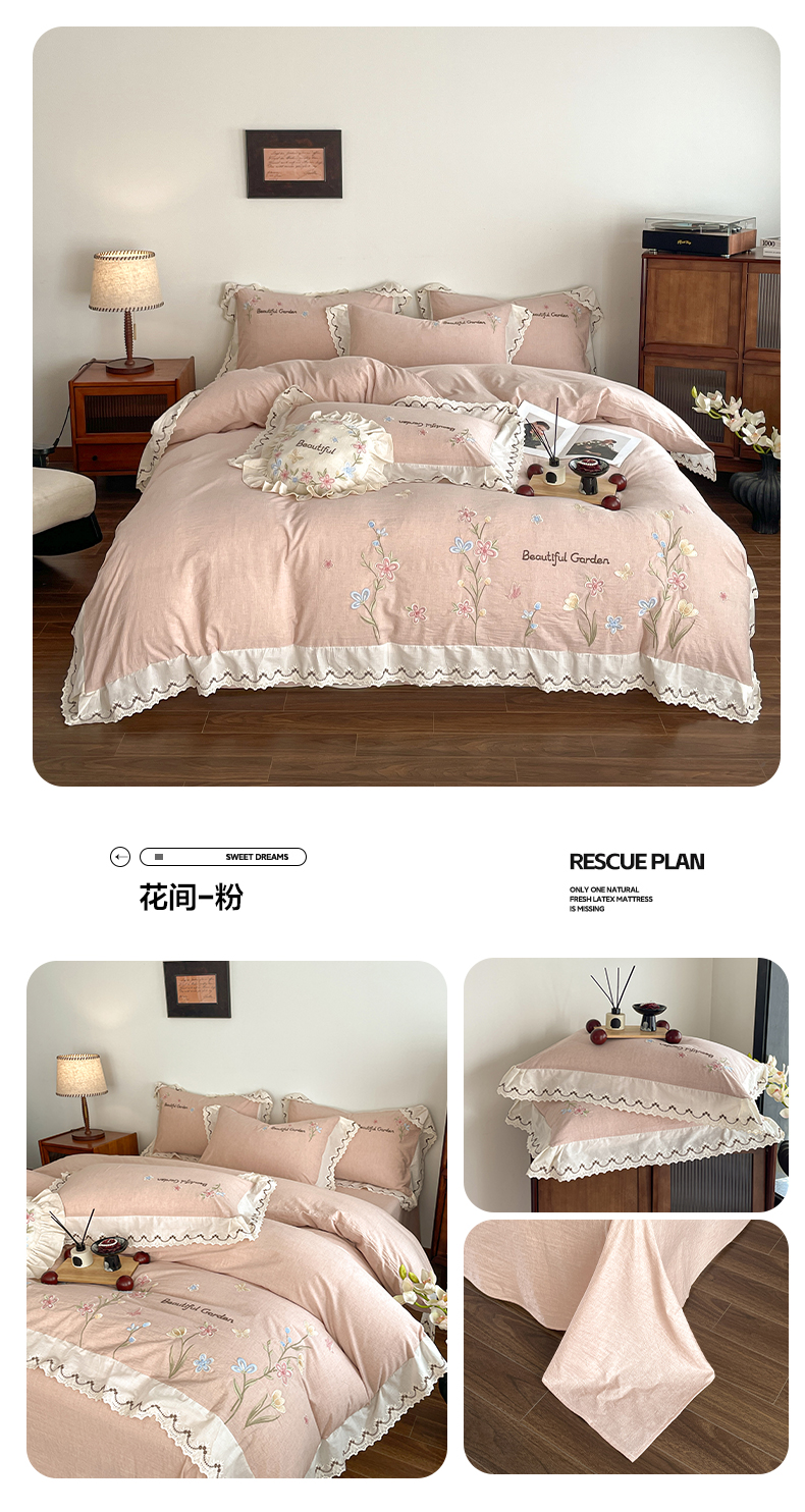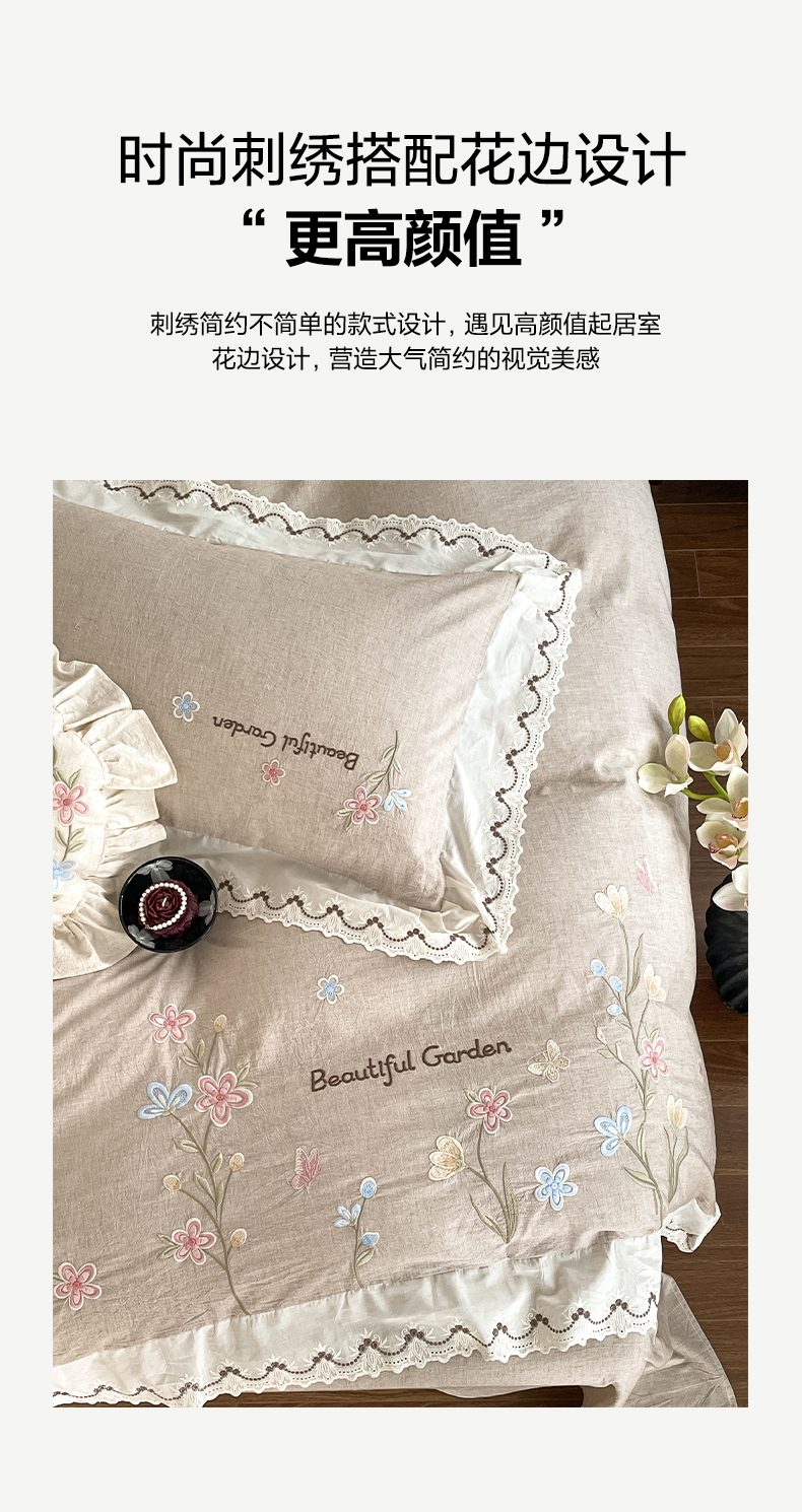 (总)如一 2026新款棉麻绣花花边款全棉亚麻四件套,花间-粉,花间-咖,花间-绿,花间-米