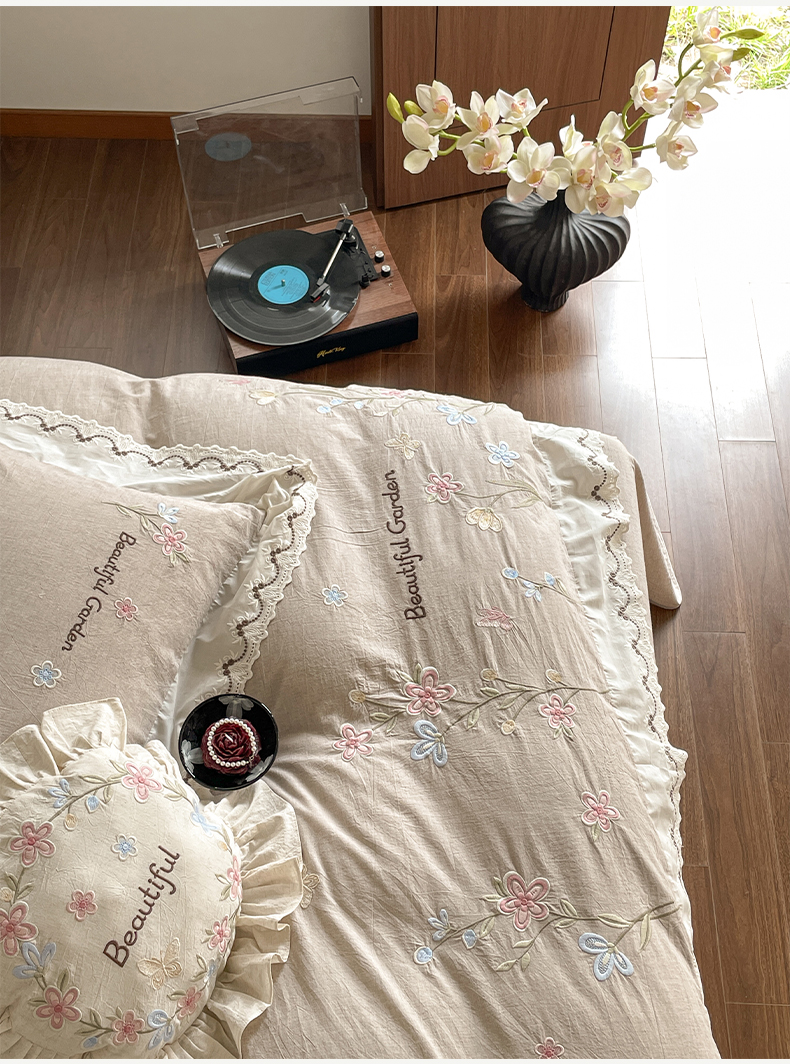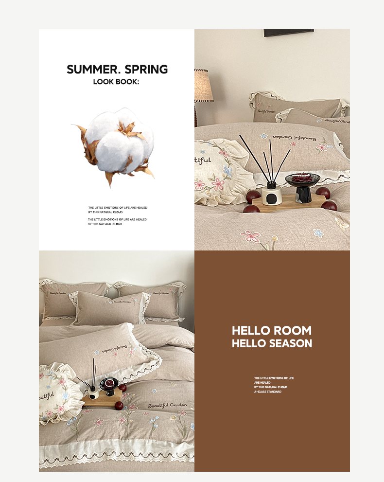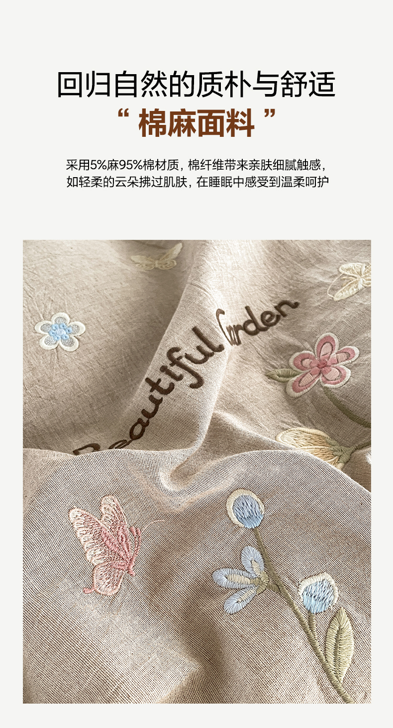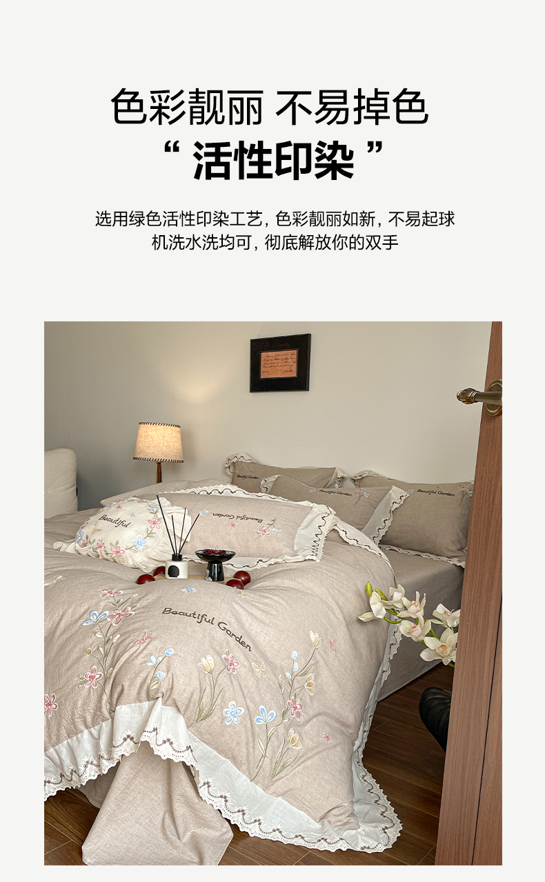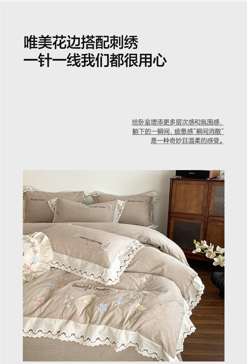 (总)如一 2026新款棉麻绣花花边款全棉亚麻四件套,花间-粉,花间-咖,花间-绿,花间-米