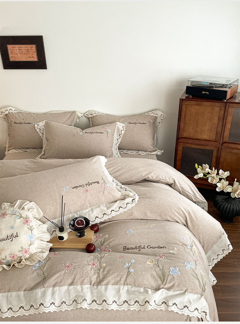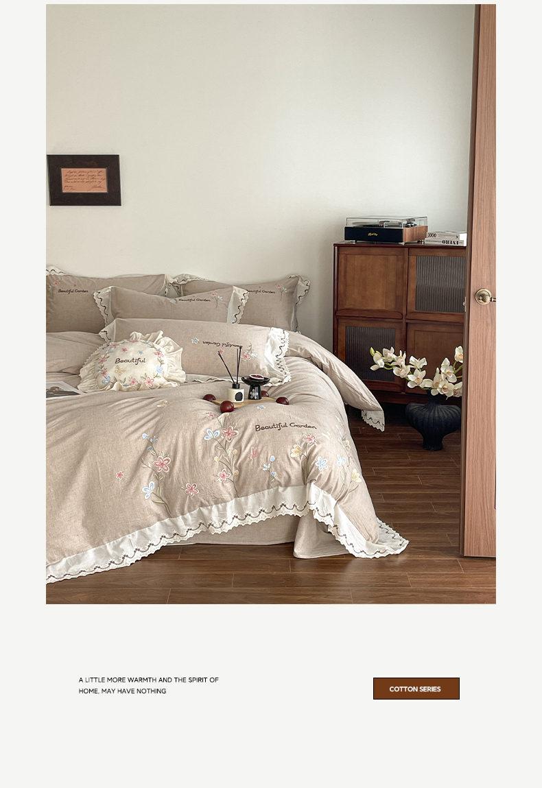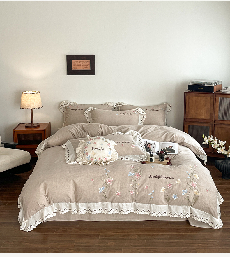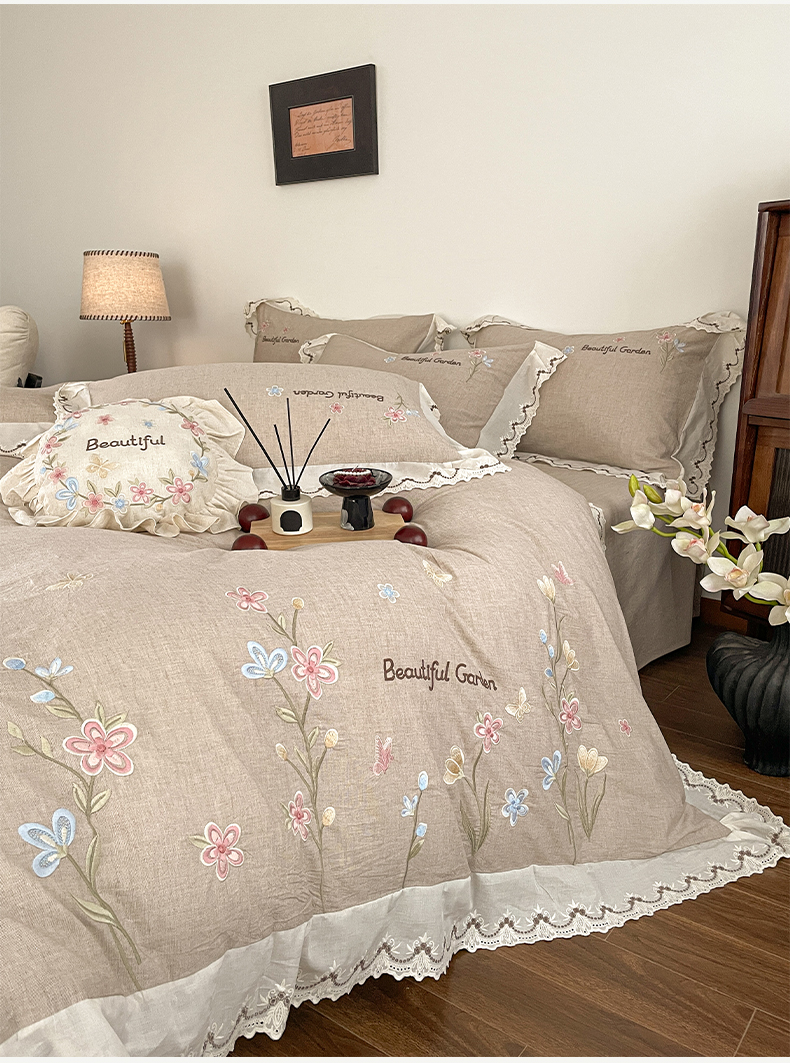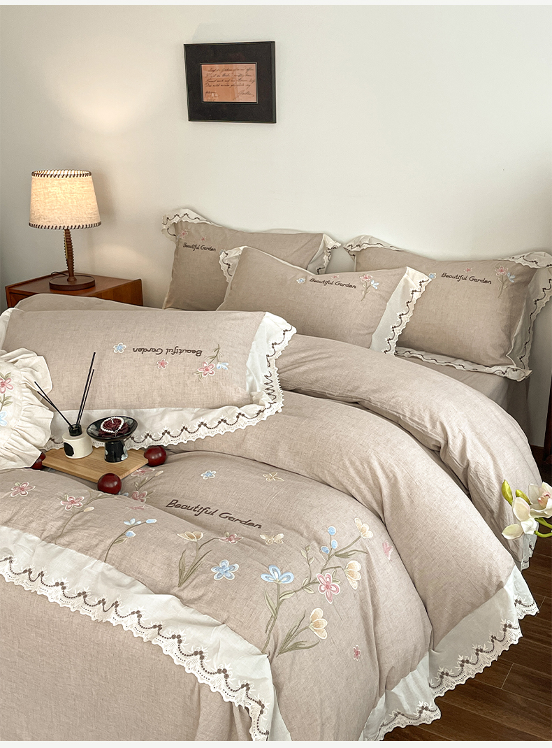 如一 2026新款棉麻绣花花边款全棉亚麻四件套 花间-咖