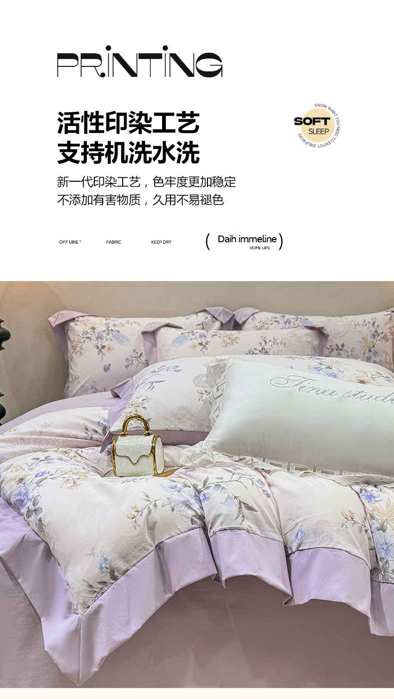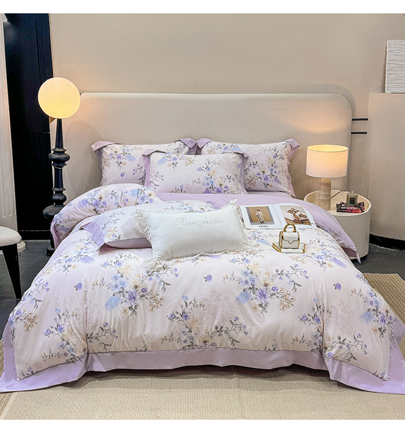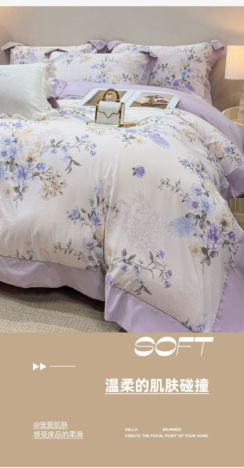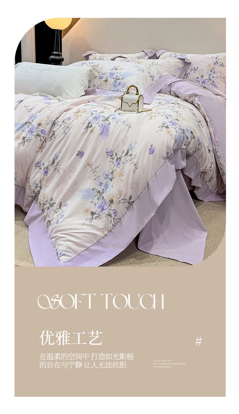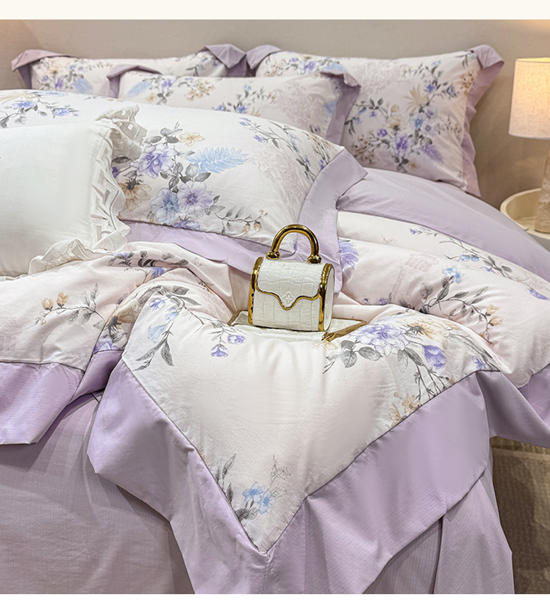 当前位置: 91家纺网 > 商品网购 > 床品套件 > 四件套 > 其它四件套 > 慕木家纺 2026新款A类印花拼角工艺慕斯棉四件套系列(抽空压缩可供跨境)提供买家秀 莫兰迪+浅紫